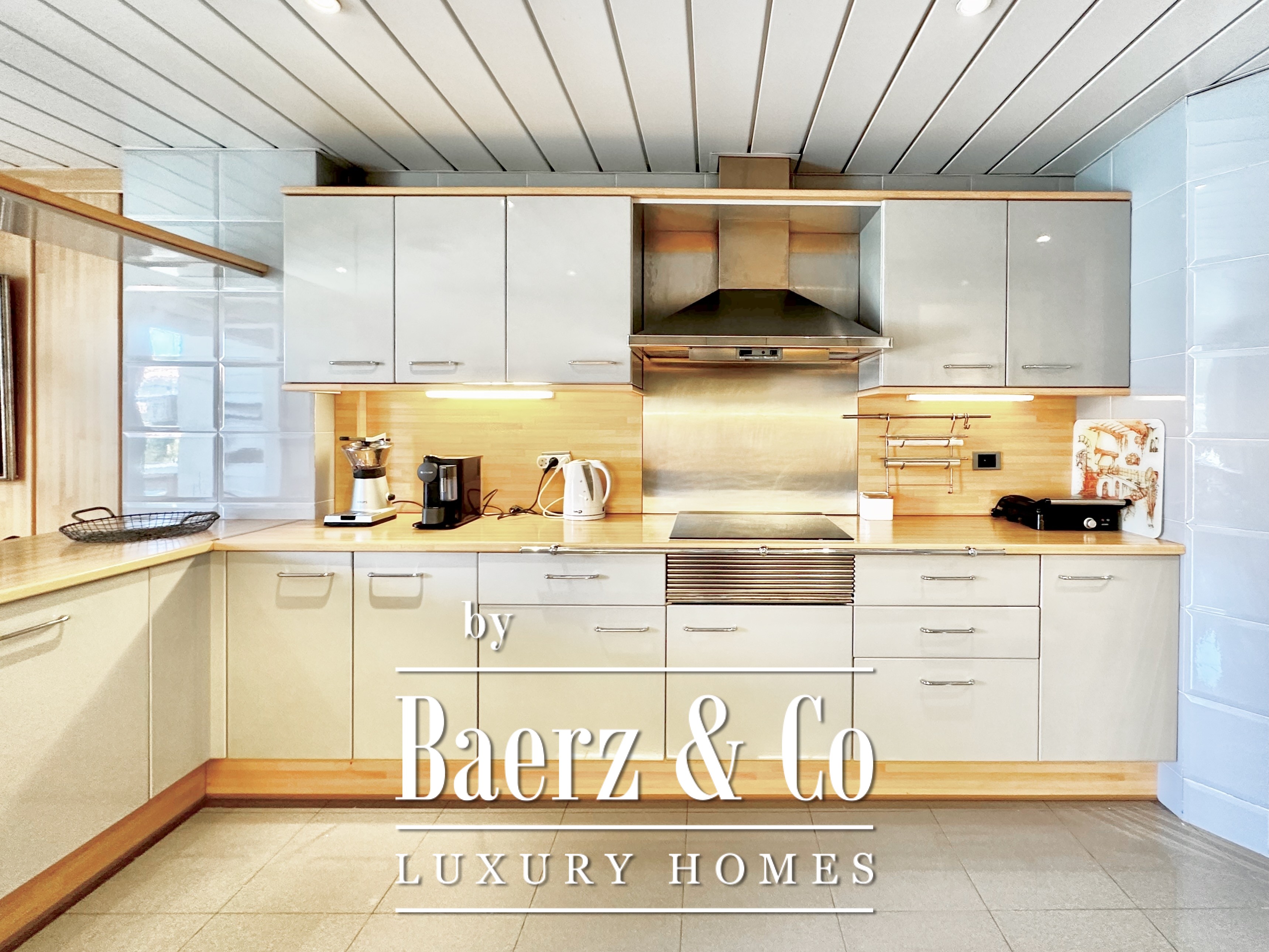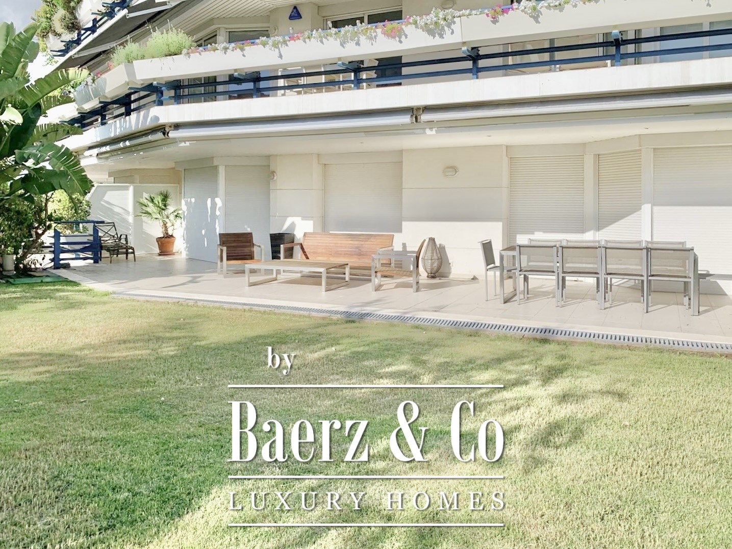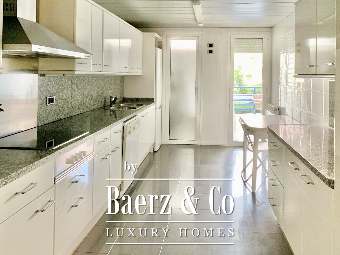 Two expansive terraces, totalling 71 m², trace the apartment’s perimeter, one overlooking the serene communal gardens and the other set directly above the shoreline for unobstructed views. The kitchen and dining space blend functionality and openness, extending onto a terrace framed by greenery. The property has been recently updated and includes two parking spaces and a 14 m² storage unit.