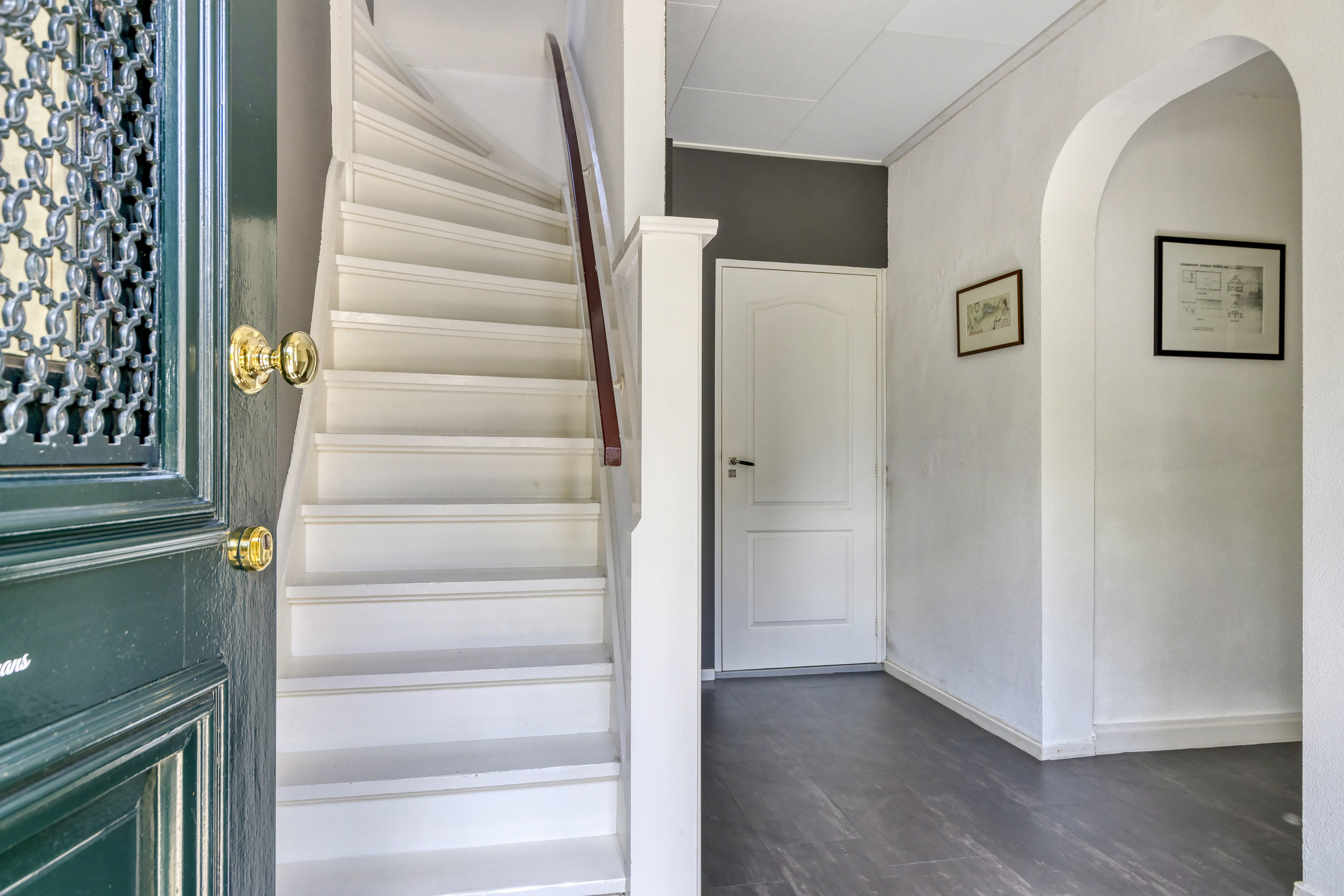 vanuit de tussenhal een trap naar de 1e verdieping, deur naar tuin/terras en schuifdeur naar bijkeuken en vanuit de hal/entree een trap naar de verdieping boven de slaap-/werk-/hobbykamer.