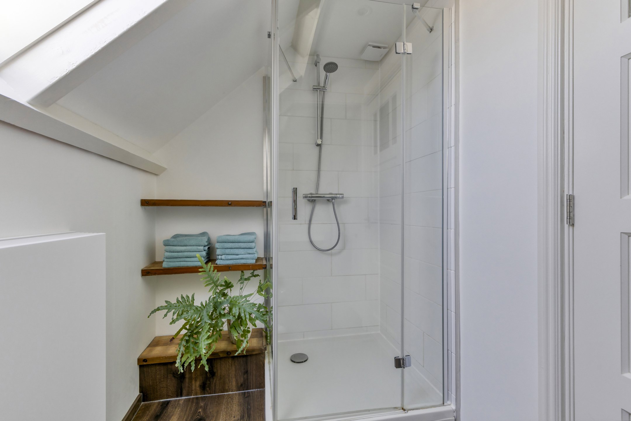 betegelde badkamer, voorzien van een douchecabine, badkamermeubel met een wastafel en mechanische ventilatie;