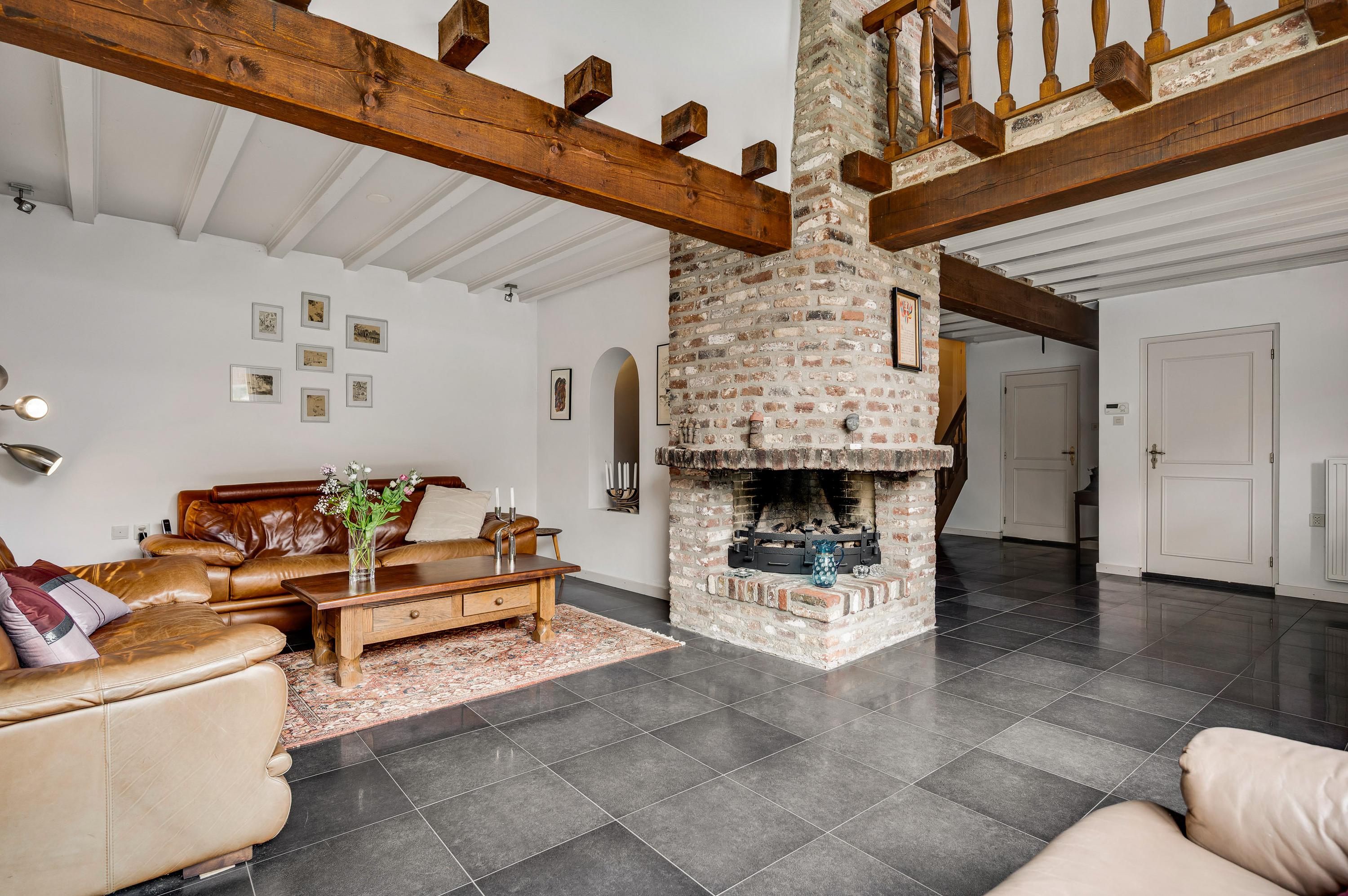 The spacious hall with a fireplace and meter cupboard provides access to the toilet, a bedroom with a separate bathroom, and the kitchen. The stairs to the first floor are also accessible from the hall. The hall also served as the B&B's former living room. This space can be used for various purposes.