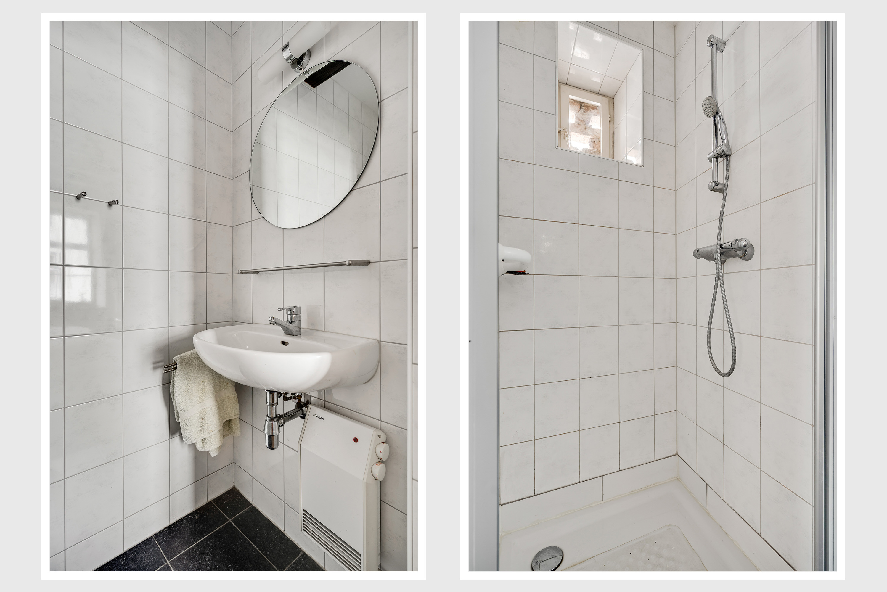 Luxurious, almost fully tiled bathroom with a sink, toilet, and shower, including a washing machine connection