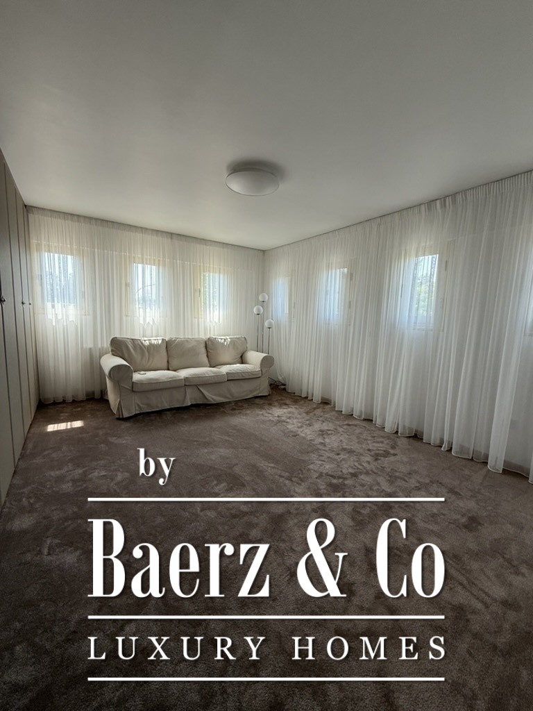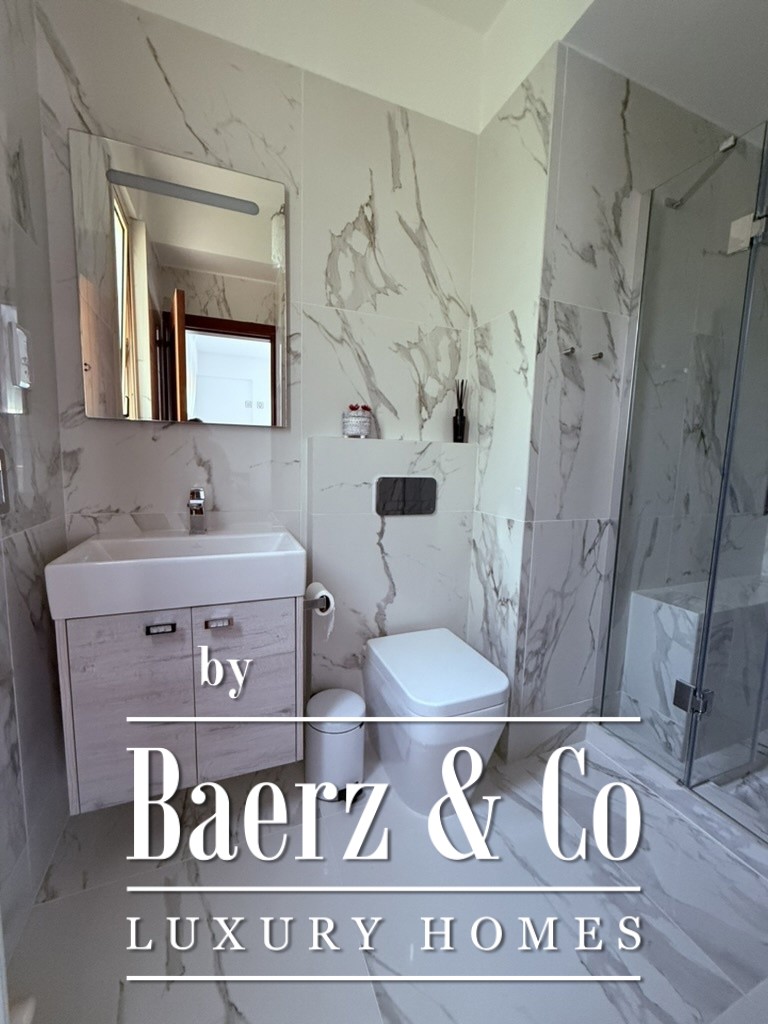 The fully furnished villa spans three levels with a 214 m² internal area on a 463 m² plot. Renovated in 2024, its five-bedroom layout includes five bathrooms and a guest WC. Four bedrooms reside on the second floor while the expansive master suite, complete with en-suite bathroom and a private storage room, occupies the top level. The kitchen faces the landscaped garden, complementing a separate dining area and a cozy living room anchored by a steam fireplace. Materials are elegantly matched with tiles, marble, and laminate throughout.