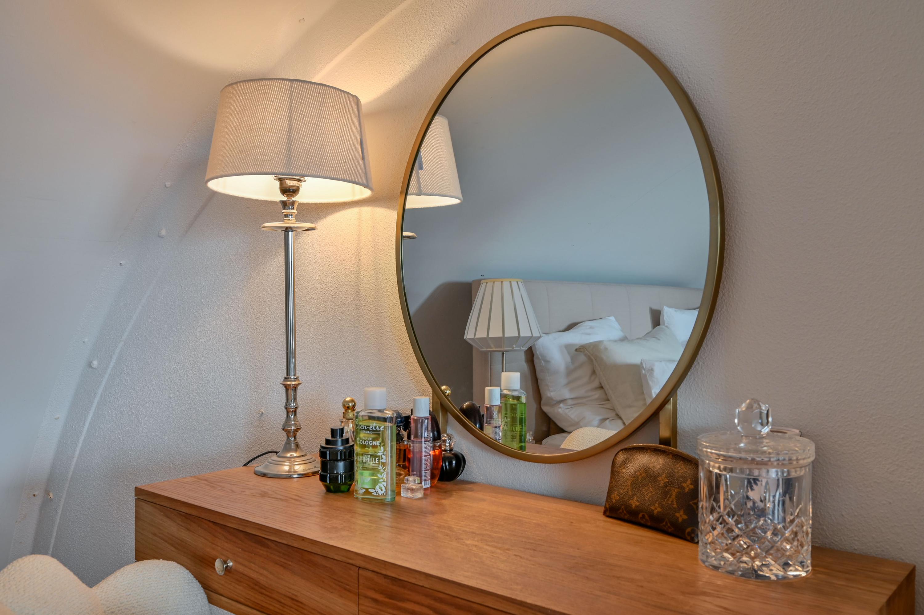 The spacious first-floor hall provides access to three large bedrooms, the stylish bathroom, and the practical laundry room. The spacious L-shaped master bedroom at the front features two large windows and a side window with garden views. The adjacent bathroom is equipped with a generous bathtub, modern shower, illuminated sink, toilet, and bidet – a space that perfectly combines luxury and functionality.