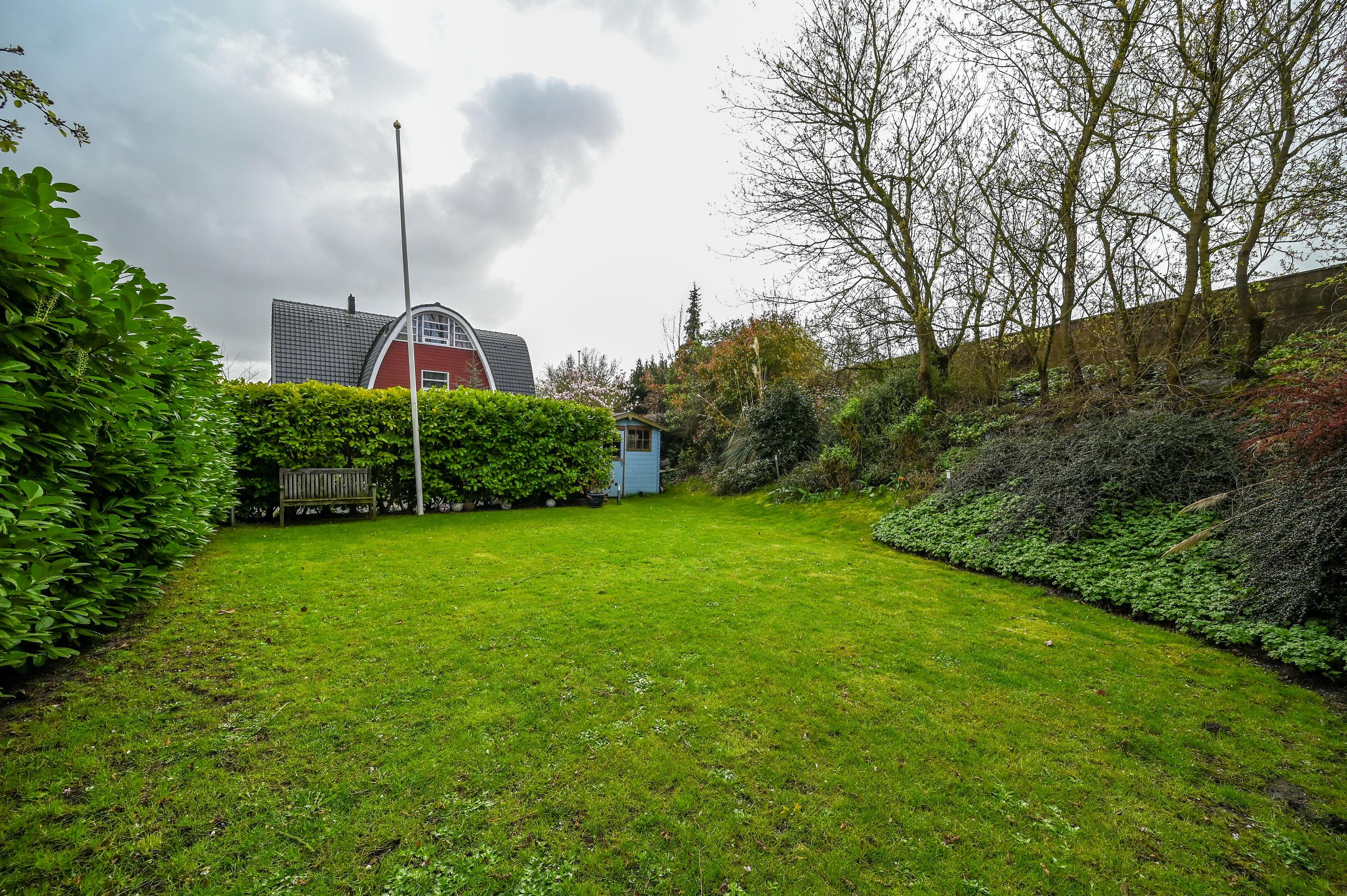 The garden continues into a generous side garden, with a compact garden house at the far end, ideal for tools, bikes, or extra storage, also equipped with electricity. A beautiful lawn runs throughout the garden, interspersed with perennial plants, stately plane trees, and ambient garden lighting. A playful gravel path connects the various terraces and the side entrance, where a water connection for a garden hose is available. The front garden is fully paved and offers space for three cars, including an electric charging point, combining comfort and functionality perfectly. This garden blends elegance, practical use, and ample opportunities to enjoy outdoor living at any time of the day.