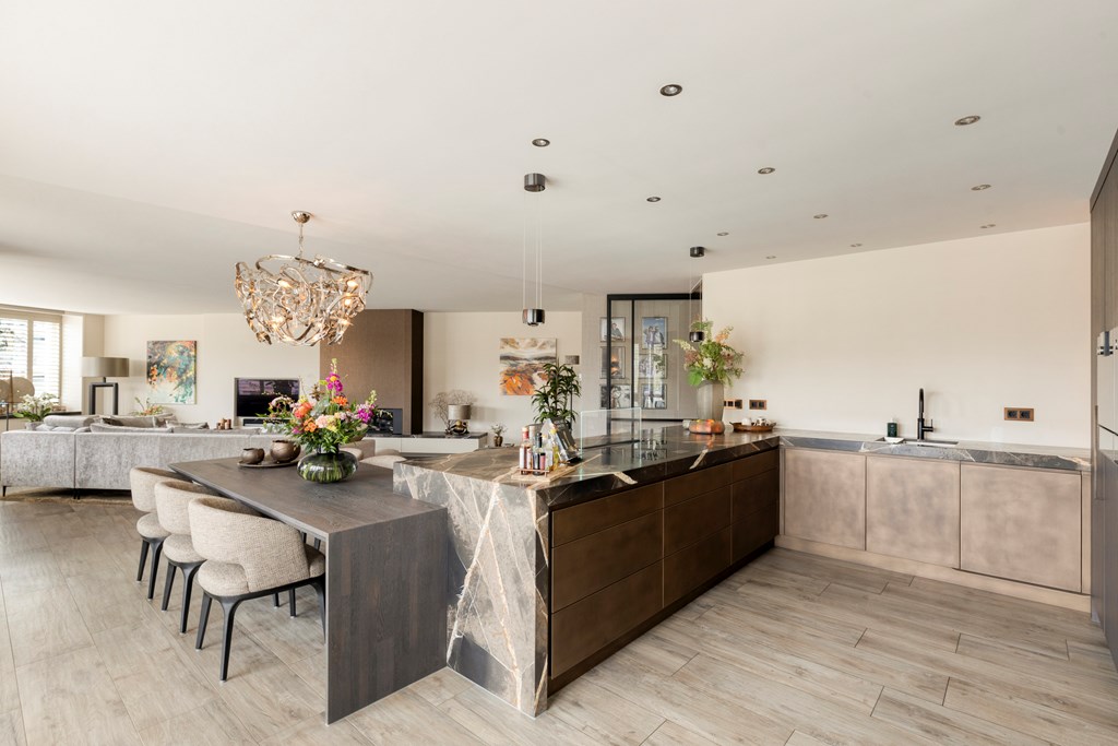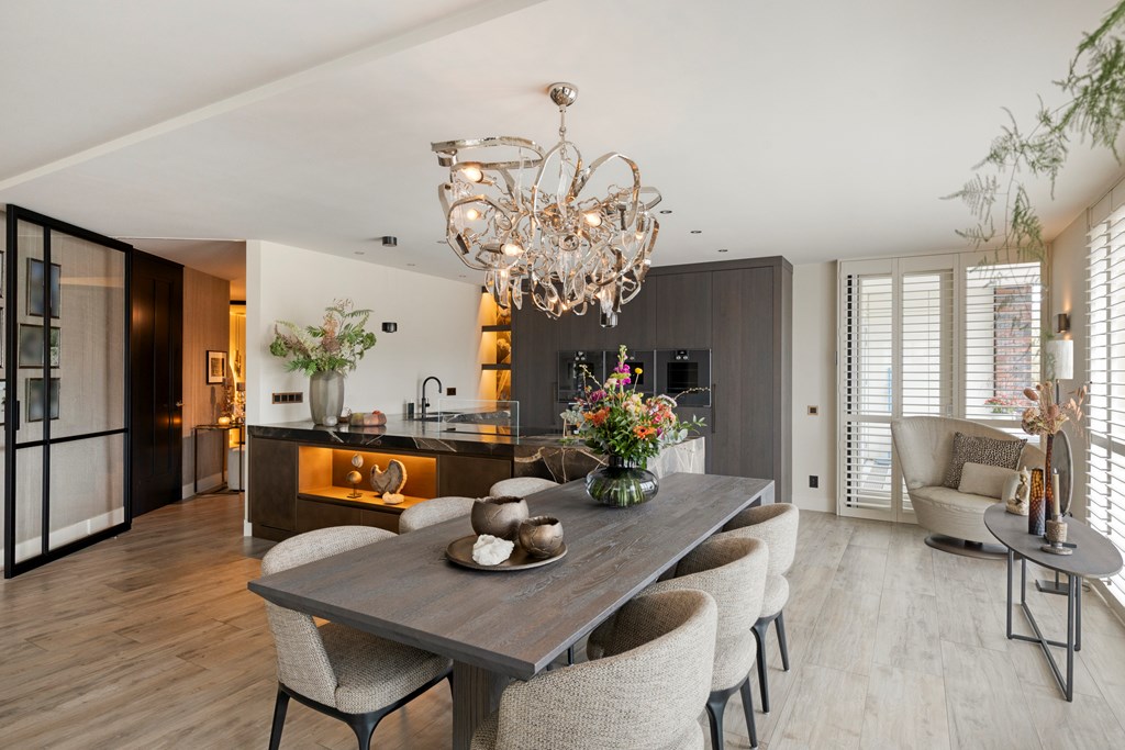 The luxury kitchen is truly a showpiece. The generous cooking island invites long dinners and convivial gatherings, while high-end built-in appliances by Gaggenau, including a combi-oven, steam oven, coffee machine, induction hob with downdraft extractor, Quooker, dishwasher, refrigerator, and freezer, ensure optimal cooking comfort. Adjacent is the luxurious dining area, perfectly positioned in natural daylight.