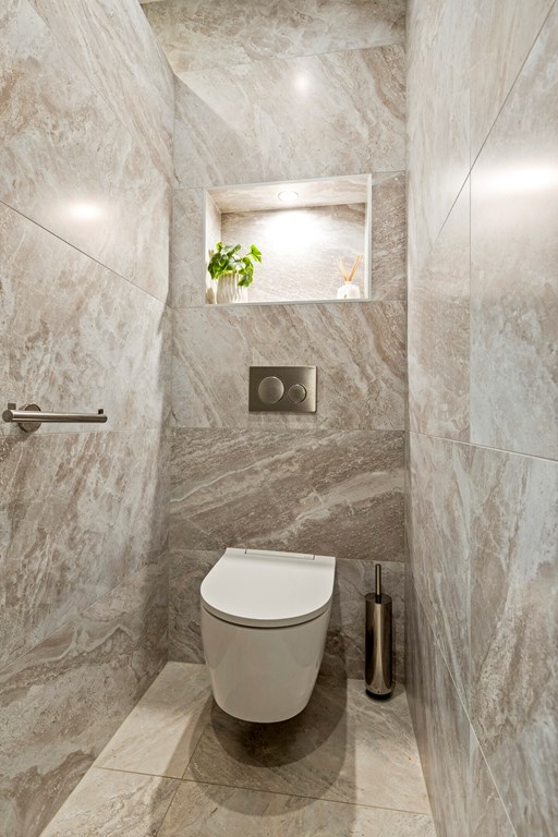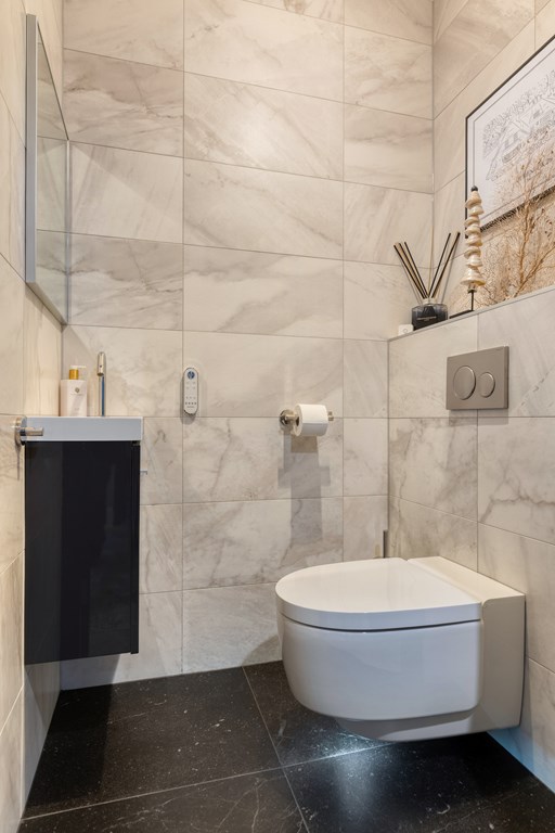 Upon entering the apartment, you are welcomed into a spacious hallway that immediately sets the tone for what follows. The finish is sleek and serene, featuring high-quality materials such as pivot doors and carefully selected lighting. The entire apartment is equipped with underfloor heating. From here, you have access to the separate toilet and the practical utility room, offering space for laundry appliances and storage, neatly out of sight yet perfectly integrated into the overall design.