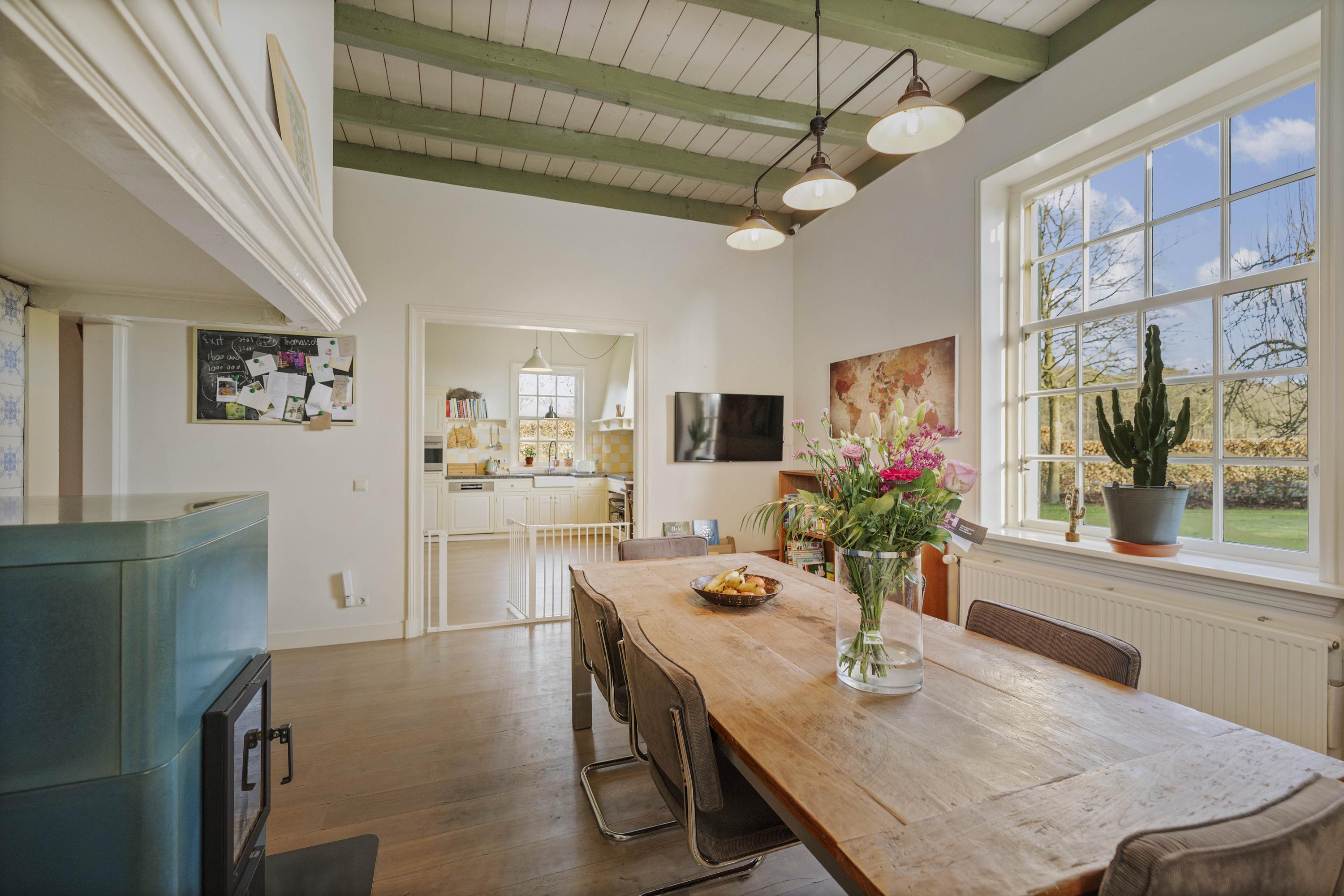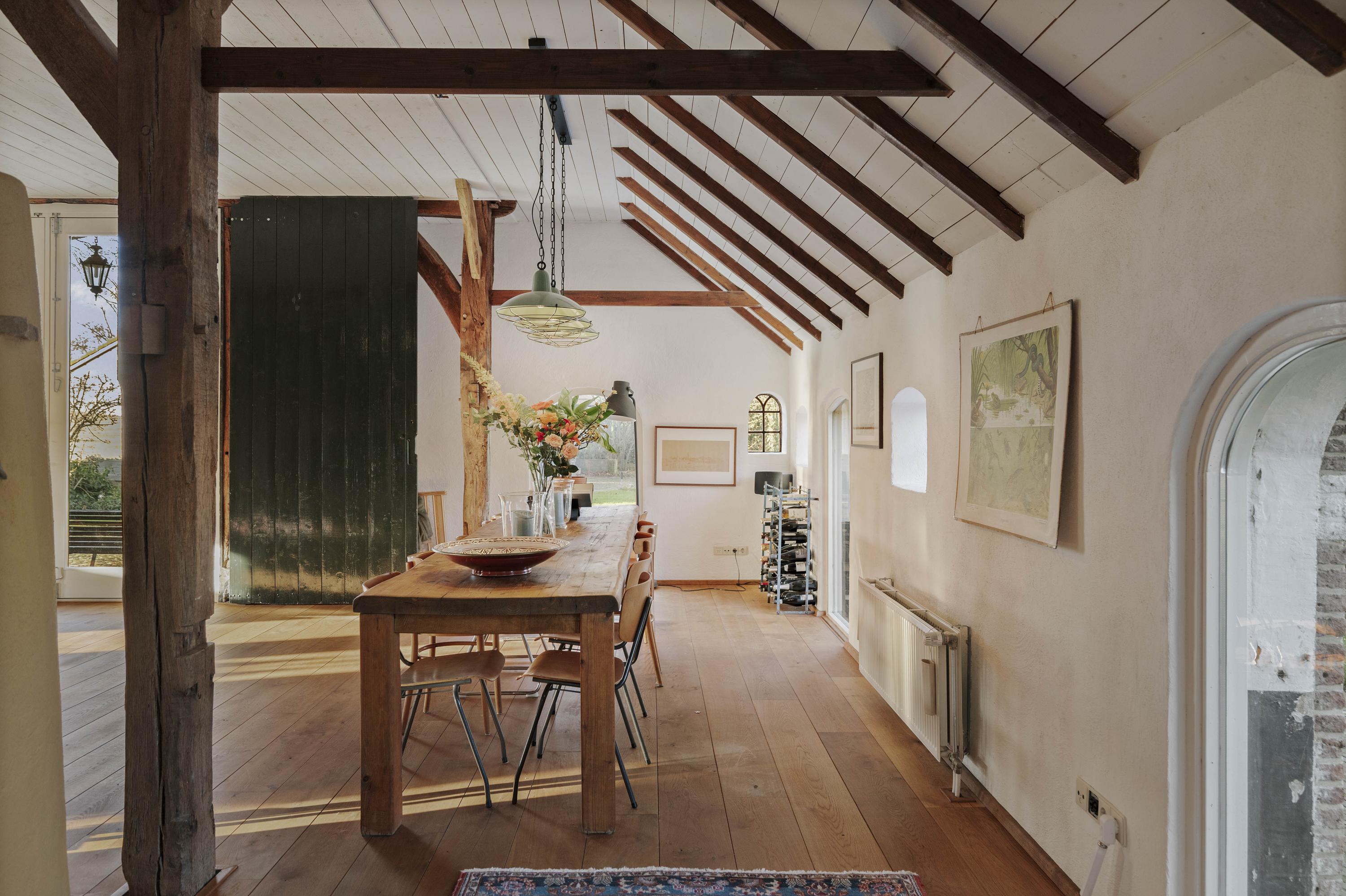 The barn is a fantastic space: over 150 m² of living space, brimming with atmosphere and rural charm. The floor is covered with oak planks and the old trusses still stand proudly in the room. In the heart of the space is a beautiful clay stove. These stoves are loved for their efficient heating, because in addition to keeping the living room warm, they also heat the water. The barn doors—the opening is now filled with glass—have been moved back on the inside and are a reminder of the barn's former function, as this is where the cows used to stand.