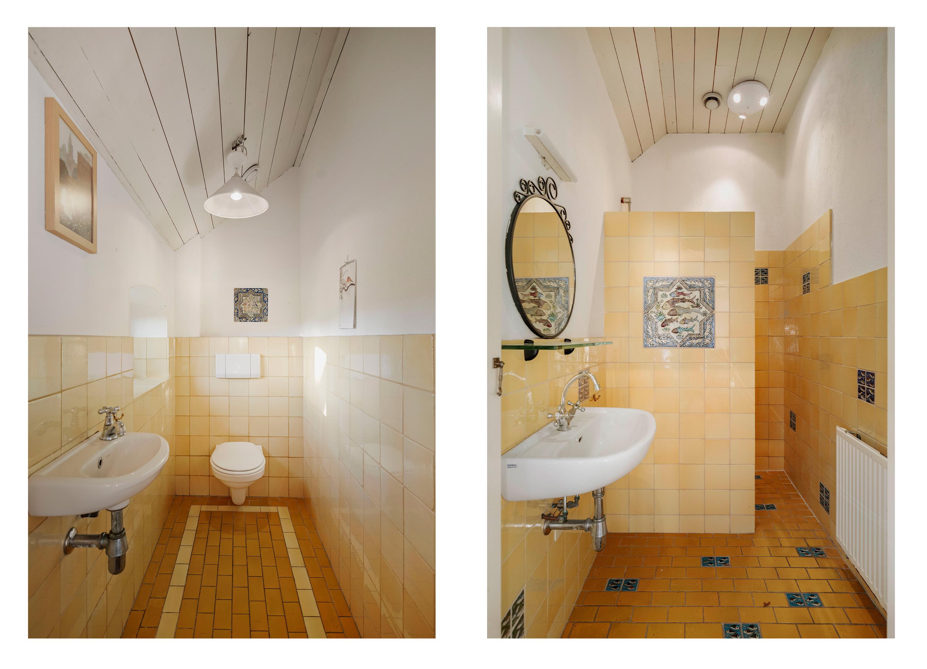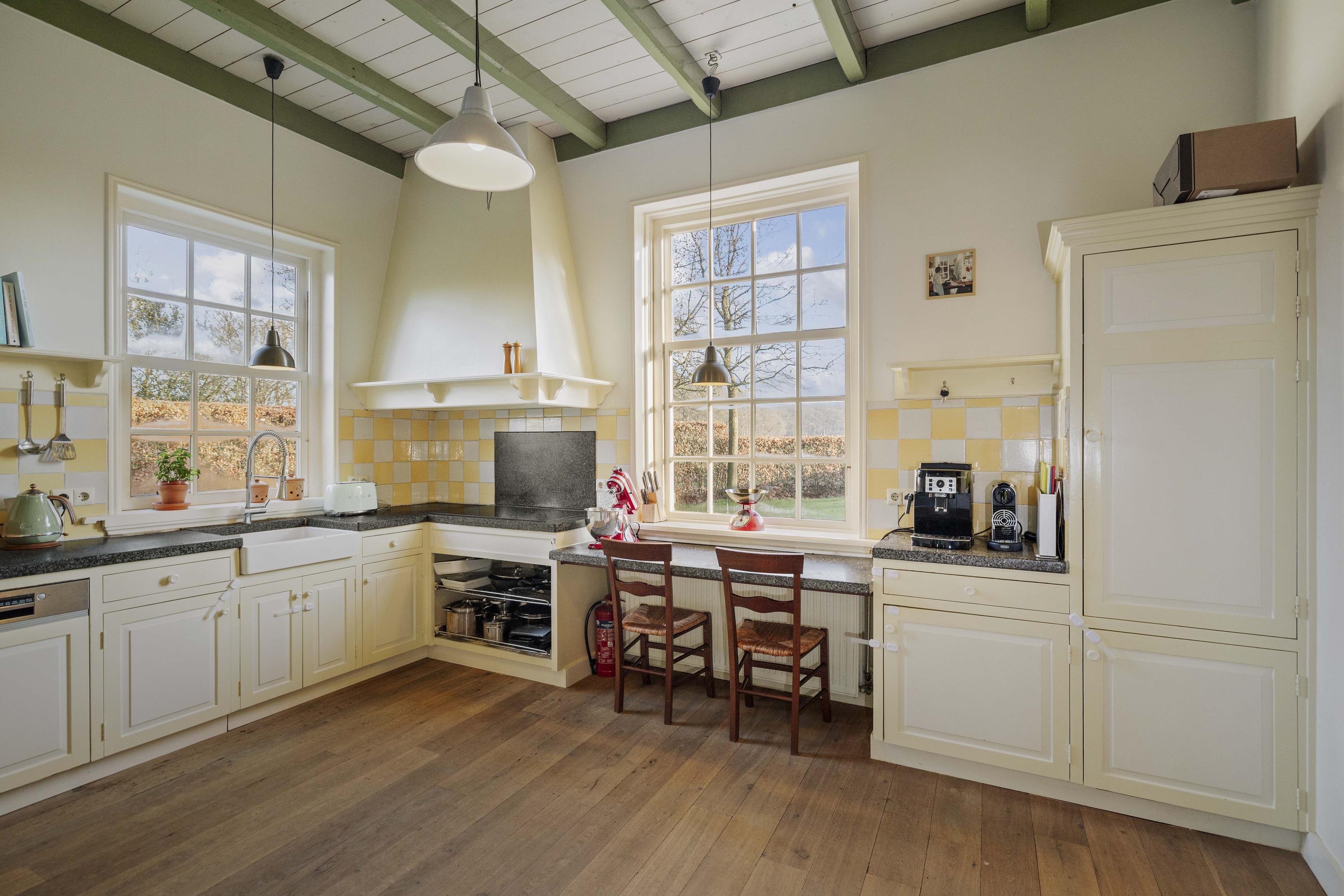 The gravel driveway leads us to the barn. In the Achterhoek region, it is customary to enter the house from the rear, and the entrance is located at the back of the house, offering impressive views of the surrounding farmland. The classic layout has been preserved in the program, as the traditional front door is also located at the front. The hall, with its high ceilings, is sunny and spacious, and the floor is covered with traditional terracotta tiles, which are so typical of this region. The formal hall is decorated with black and white decorative tiles, which contrast beautifully with the fresh white walls and cream-colored woodwork. The hall provides access to the toilet and bathroom on the ground floor, the dining room, the basement, and the upstairs room, which is currently used as an office with a pantry but would also be perfect as a guest room.