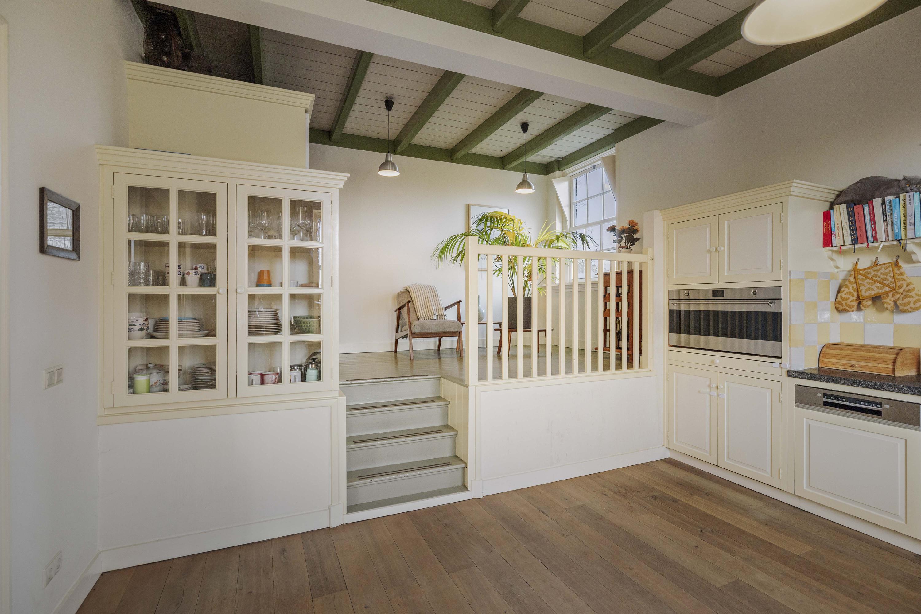 The kitchen, with its cozy upstairs room, perfectly matches the nostalgic look and feel of the house, but is surprisingly modern and fully equipped; a kitchen for foodies! The kitchen has cream-colored cabinets—there is plenty of storage space here—and a honed bluestone countertop. Cooking is done here on the extra-wide induction hob, and the built-in appliances are also top-notch, with a fridge-freezer, an extra-wide convection oven (90 cm, SMEG), and a dishwasher (Bosch). Underneath the upstairs room is the second storage cellar.