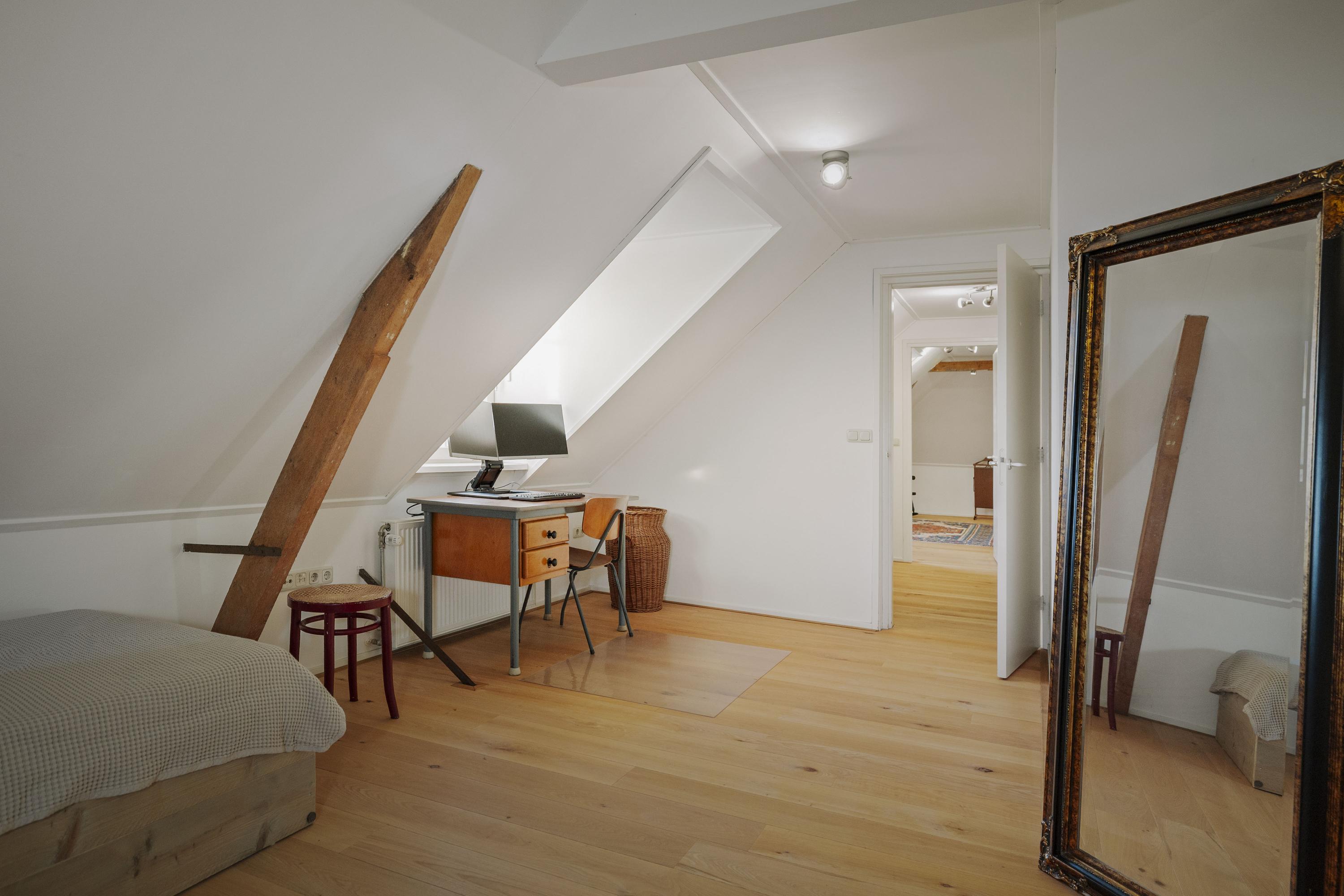 Five spacious bedrooms are located off the spacious and sunny landing, which has red oak plank flooring. The master bedroom has its own bathroom with a walk-in shower, toilet, and sink. The front part of the house also houses the laundry/utility room, with connections for the washing machine and dryer, the boiler and buffer tank, and a 120-liter boiler, as well as a practical storage room. Here you will also find the second bathroom, with double sinks, a spacious walk-in shower, and a toilet.