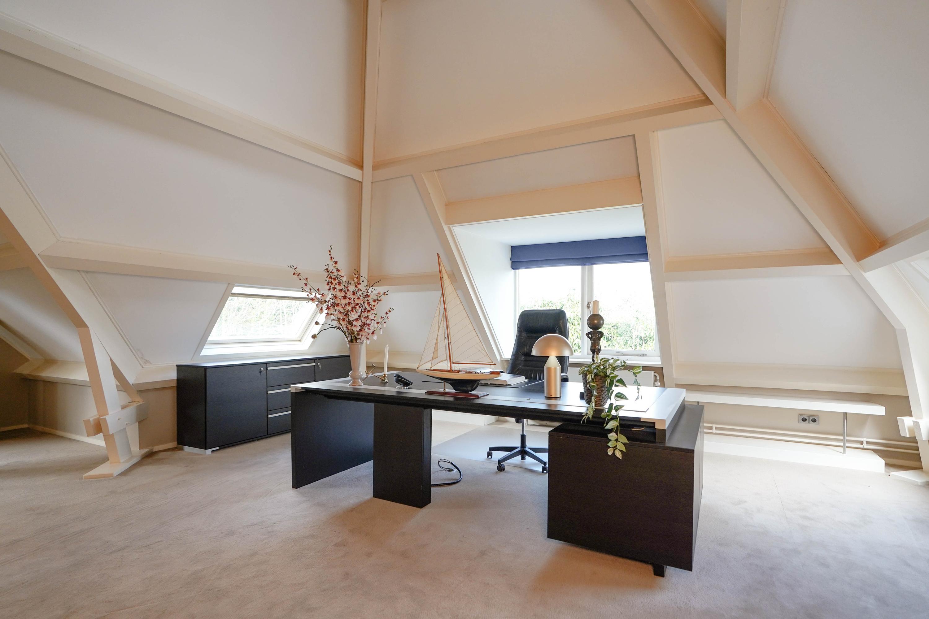 Landing, the first bathroom with shower, double sink and a toilet. Two spacious, identical children's bedrooms with a fixed staircase to a sleeping loft. The master bedroom has its own bathroom en suite (equipped with underfloor heating), fixed cupboard wall and French doors to a roof terrace with breathtaking views. Last but not least, on the first floor you will find the very spacious study with gas fireplace, view of the water, custom-made built-in cupboards and a fixed staircase to the vide and large storage attic.