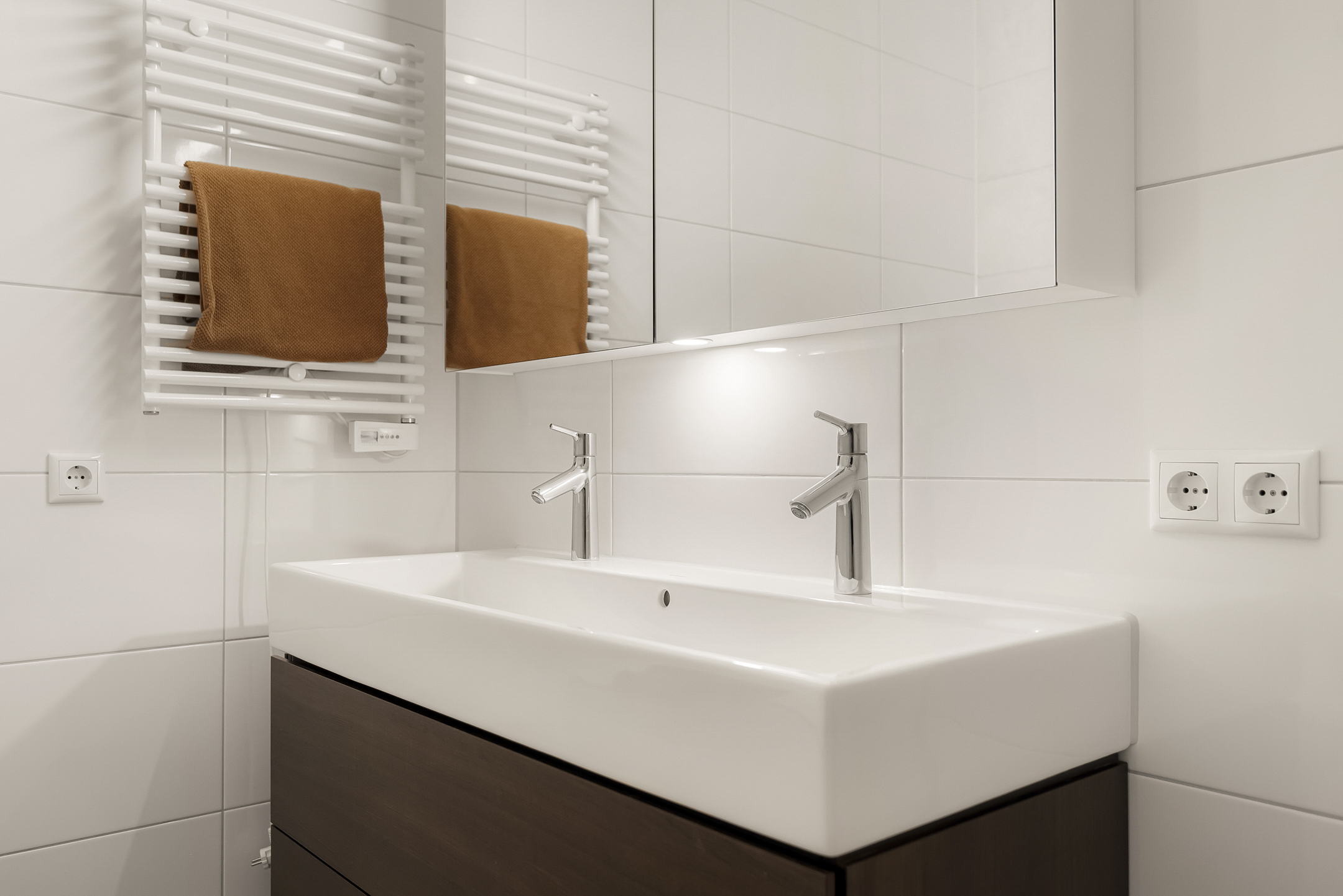 The bathroom exudes luxury and is fitted with a walk-in shower with linear drain, a bathtub, a stylish vanity with mirror cabinet and a towel radiator. This floor also has a PVC floor throughout and a separate toilet with wall-mounted closet.
