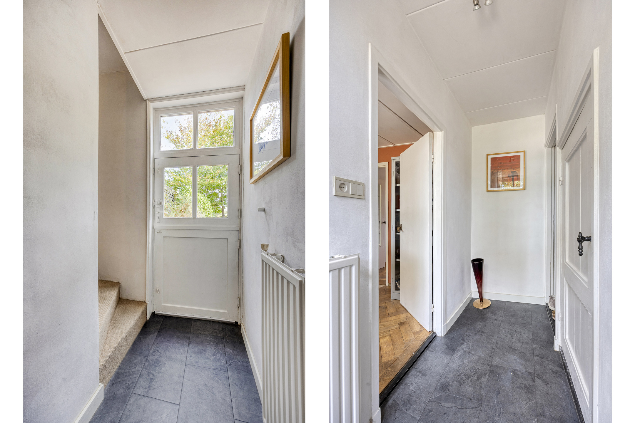 Side entrance hall with cloakroom, staircase to the first floor and access to the cellar; plastered walls, tiled floor, ceiling finished with plasterboard;