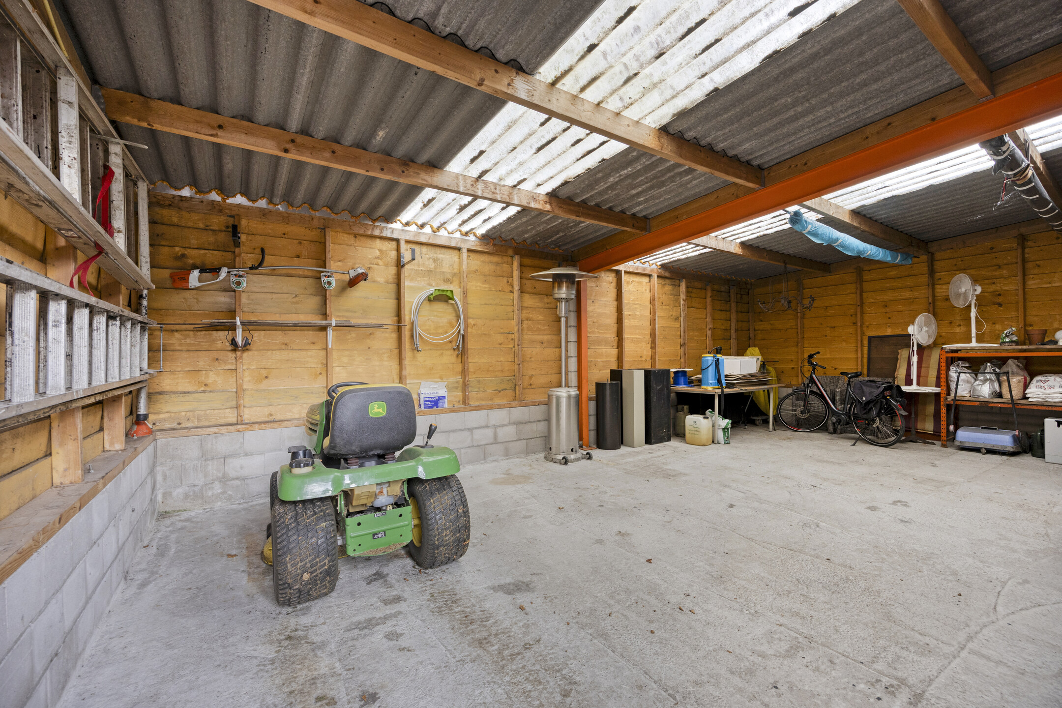 Barn II (approx. 302 m²), divided into two sections, featuring two sets of double wooden doors to the driveway/garden, three pedestrian doors, electricity, power supply, roof insulation and two storage mezzanines; partly tiled roofing and partly asbestos corrugated sheets.