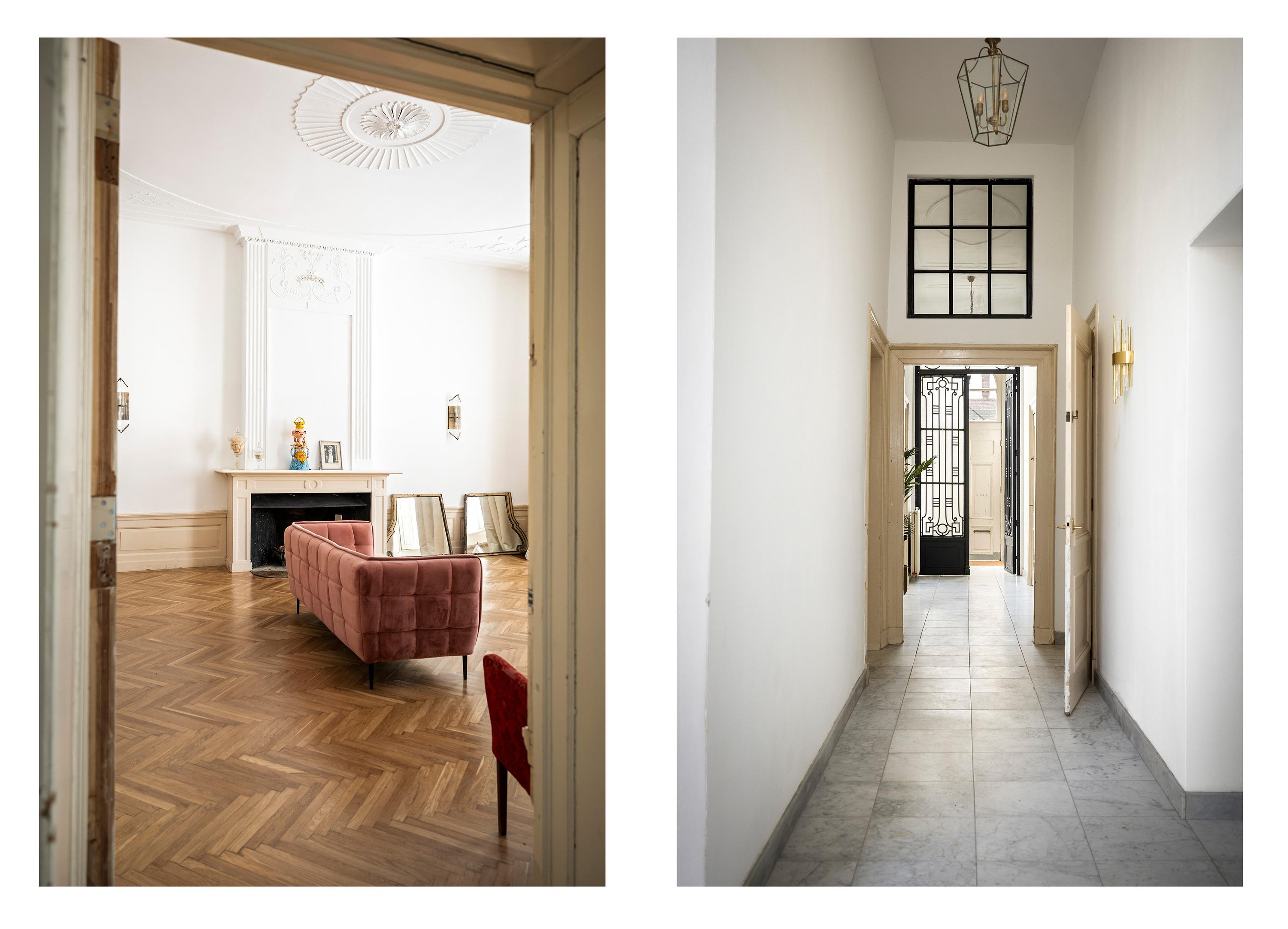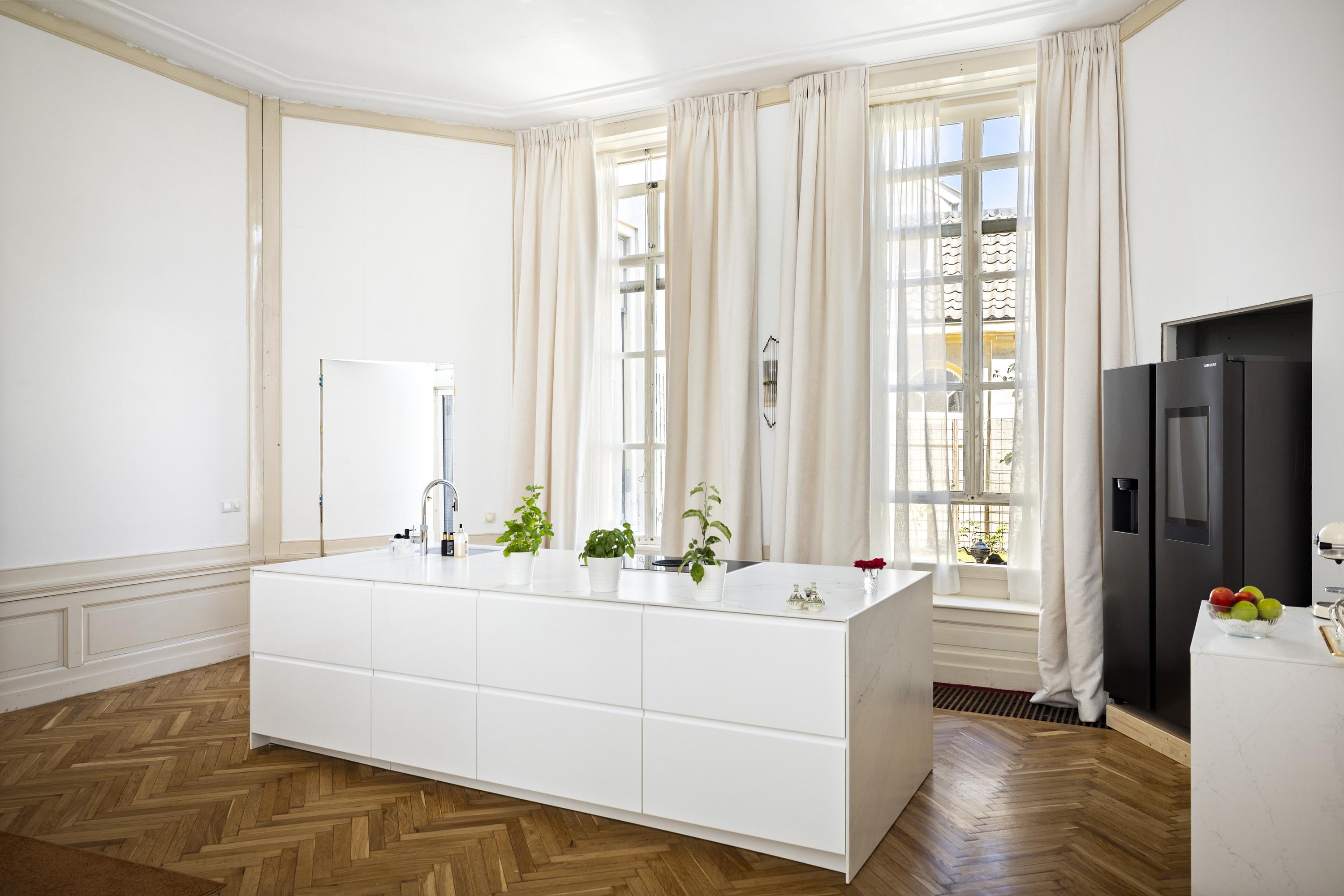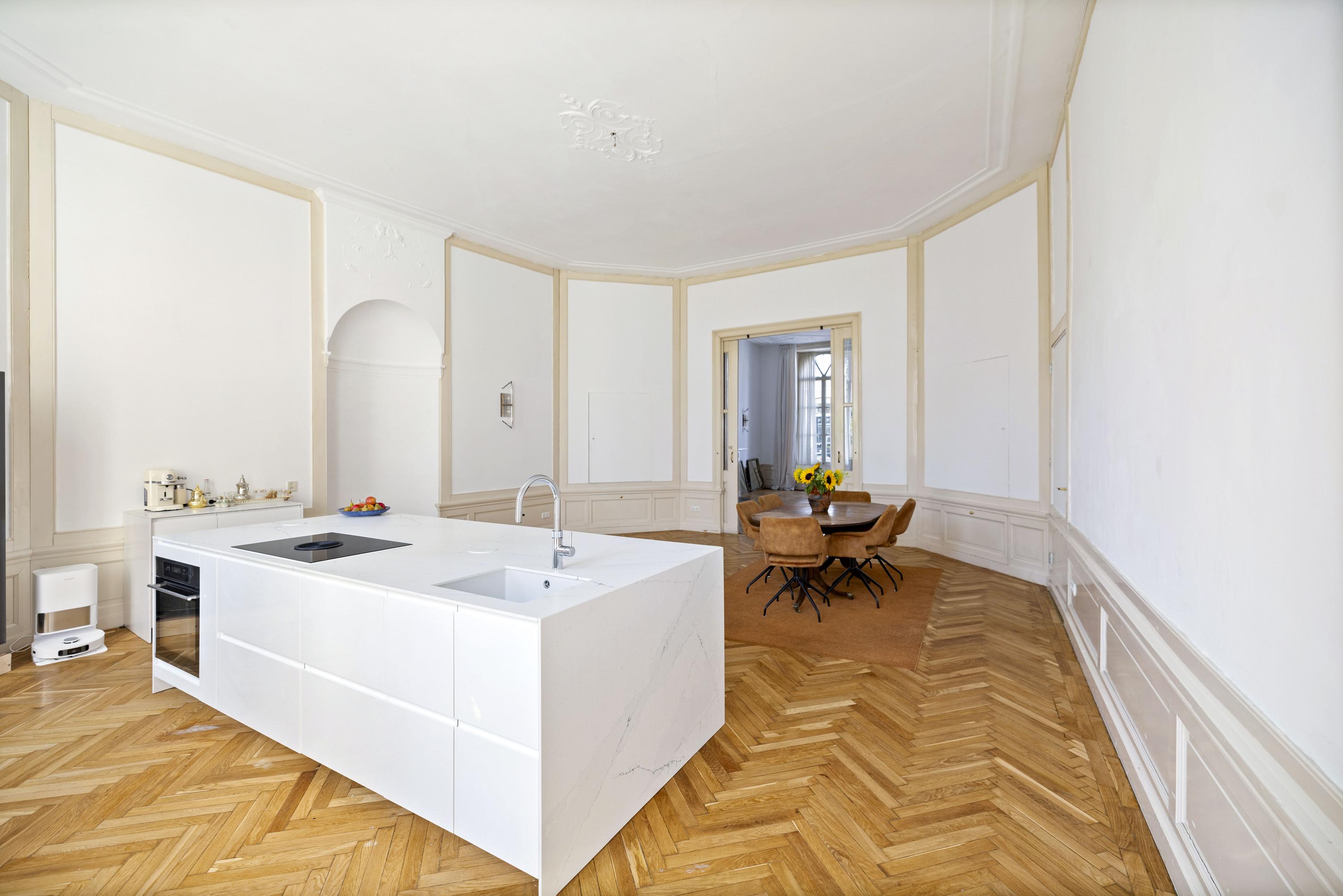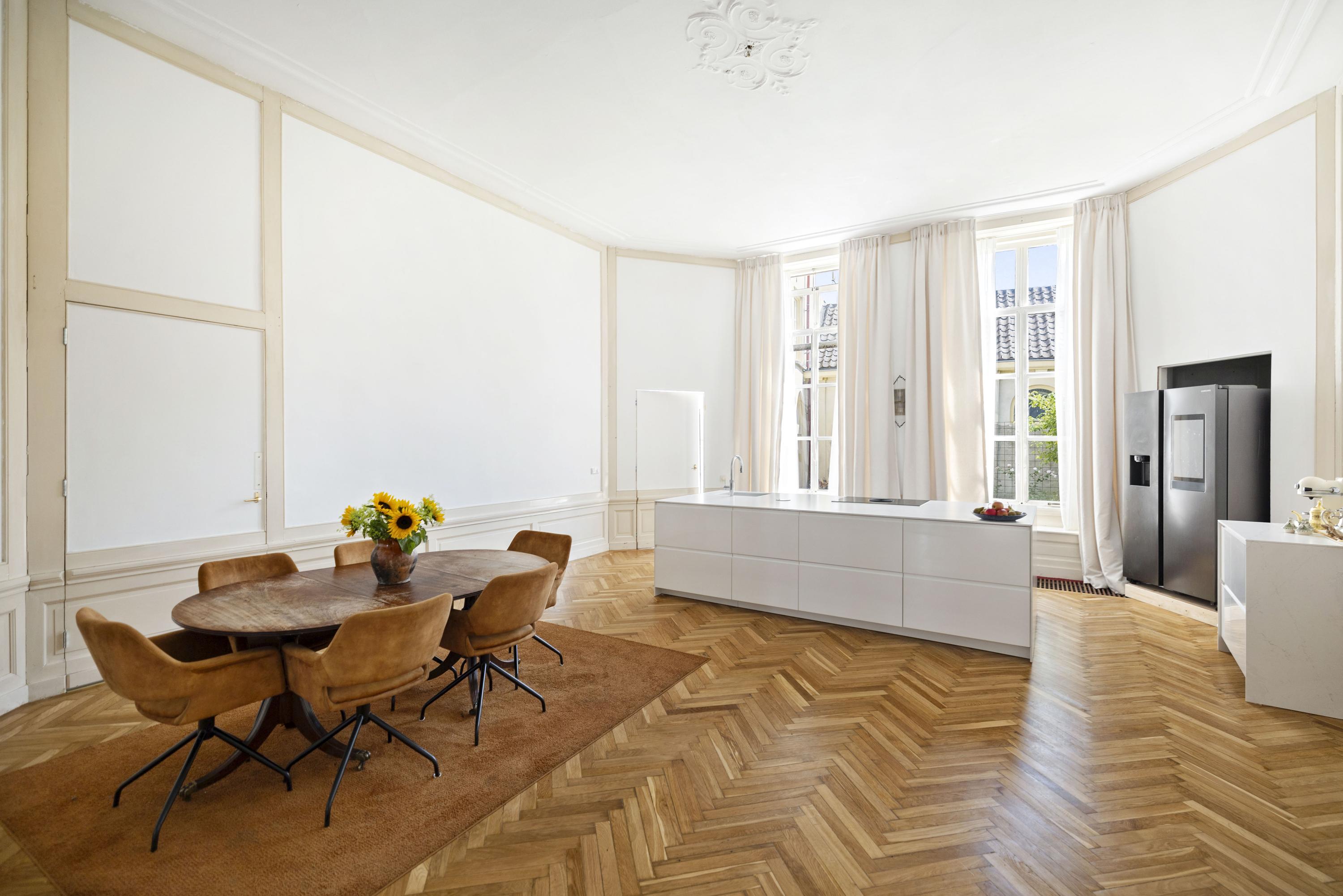 To the right: a living room and kitchen en suite. The flooring is warm oak in a classic herringbone pattern. The walls are freshly plastered in white, and the woodwork is finished in classic Bentheimer yellow. These rooms are surprisingly versatile — they can accommodate anything from sleek minimalist design to vibrant, art-filled spaces, even children’s bikes and dollhouses — everything finds its place here.