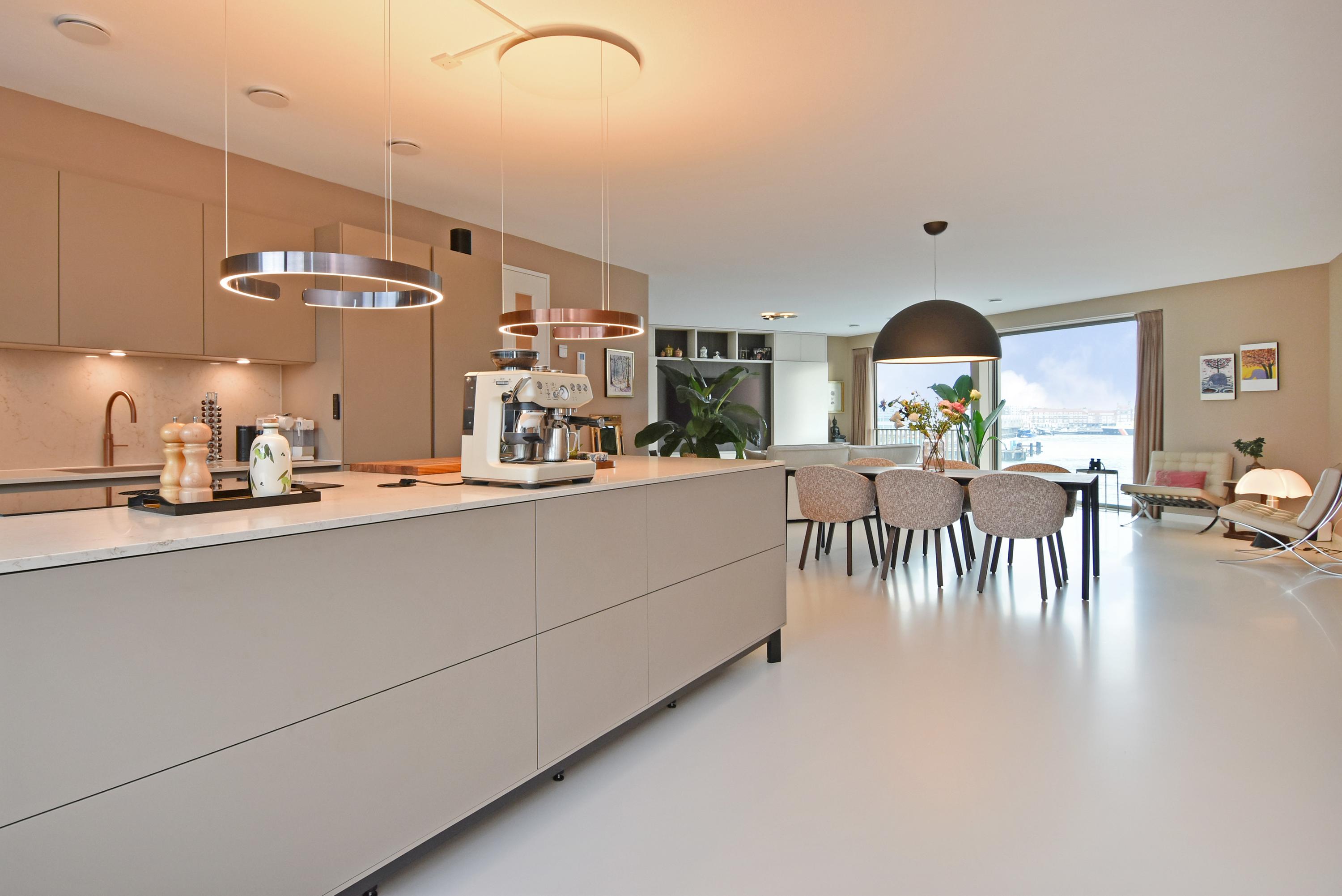 Aan de voorzijde bevindt zich het zitgedeelte met een stijlvolle, op maat gemaakte kastenwand met afsluitbare werkplek. Aan de achterzijde ligt de designkeuken met kookeiland en alle denkbare luxe inbouwapparatuur, waaronder een inductiekookplaat met geïntegreerde afzuiging, Quooker, vaatwasser, combi-oven, ruime koelkast en aparte ruime vriezer. Vanuit de keuken opent de grote schuifpui naar het riante balkon, waar u in alle rust kunt genieten van de middag- en avondzon.