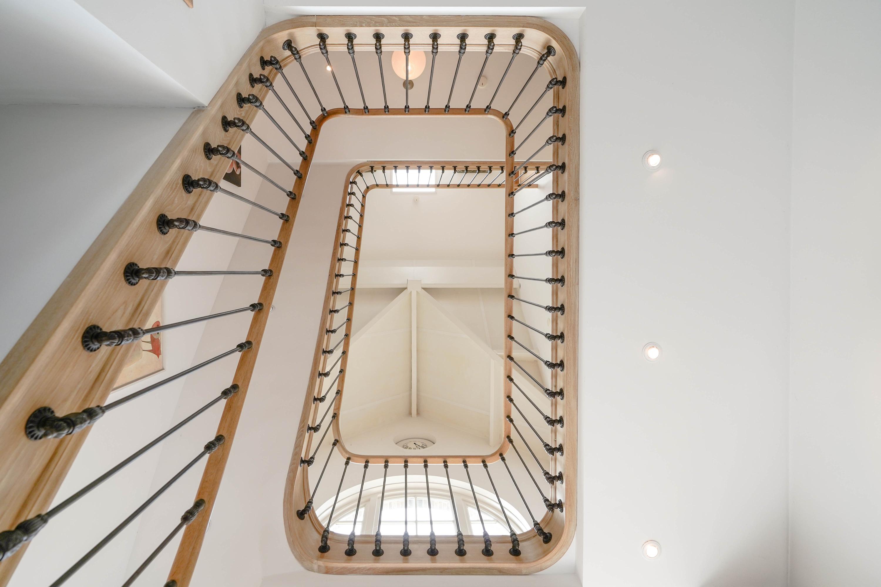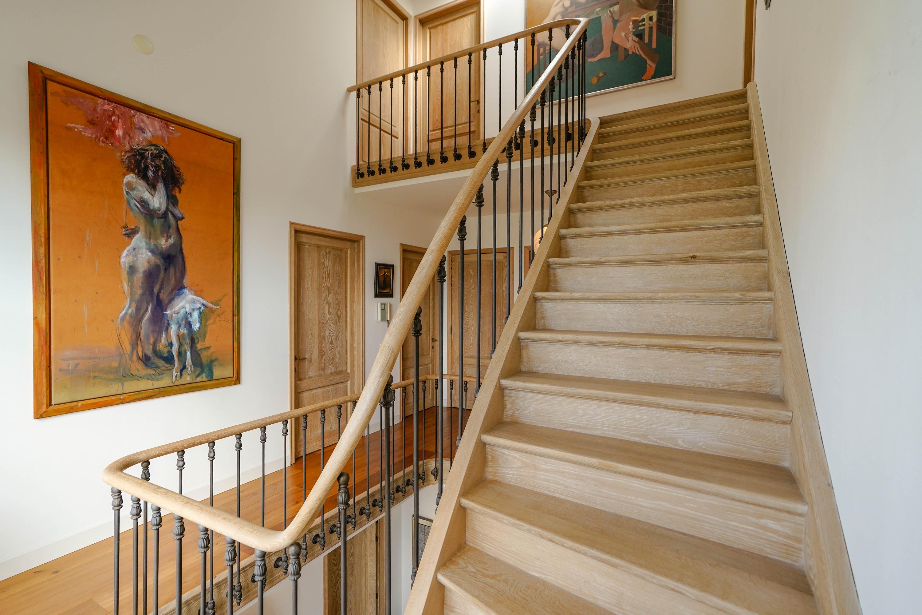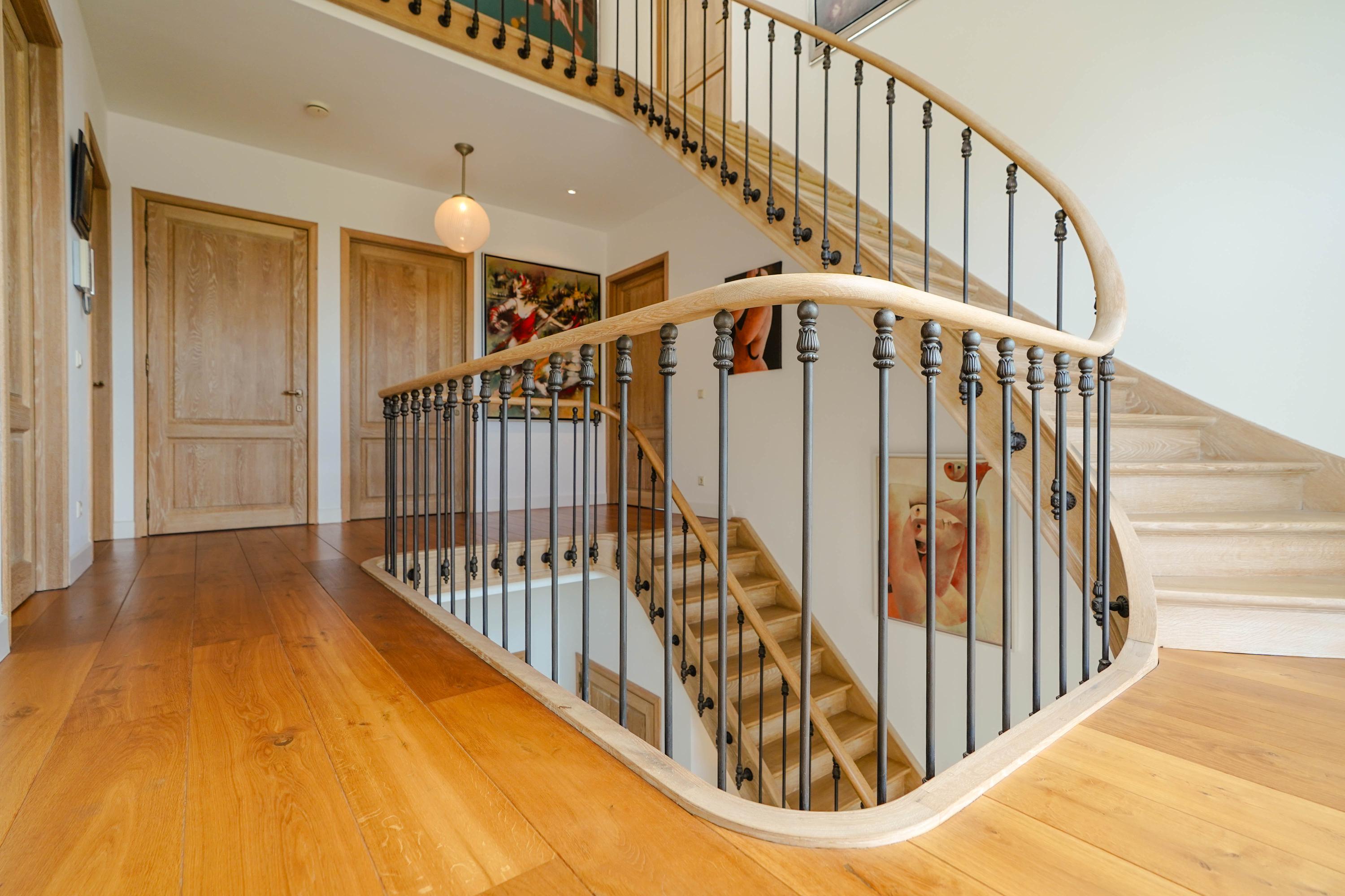 Inside, the entrance hall features a beautifully sculpted oak staircase. The solid oak handrail runs in a single, uninterrupted piece all the way to the top floor, supported by 87 patinated cast iron balusters—a masterpiece by renowned Belgian staircase maker Luc Steels, who also crafted all the panel doors and frames throughout the home. The hall includes a guest toilet and the meter cupboard. A skylight above the stairwell, combined with the large glass facade, brings natural light to all floors.