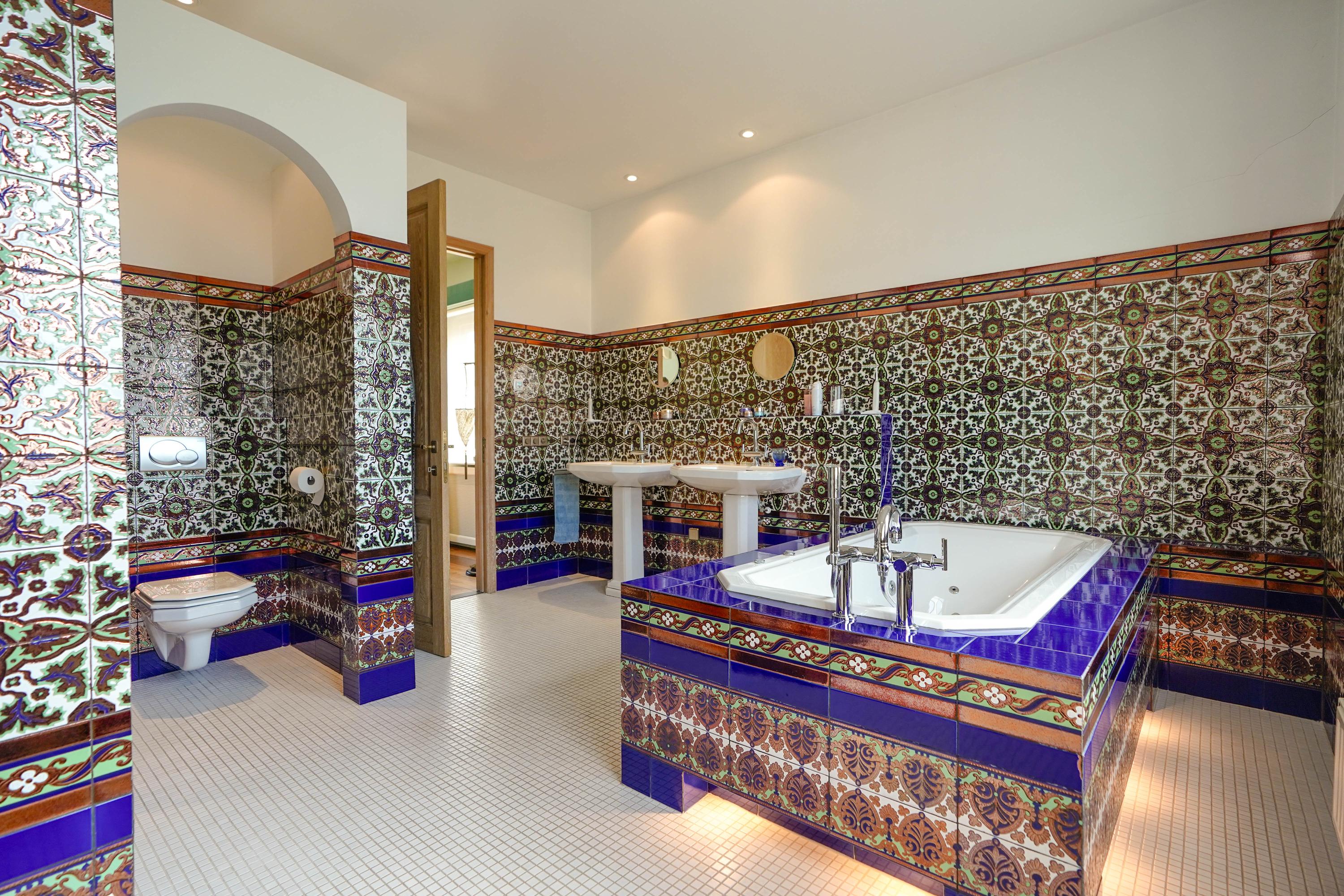 The luxurious bathroom is designed in Andalusian style and features a walk-in shower, jacuzzi bathtub, designer radiator, two Sphinx sinks, toilet, and matching Sphinx wall cabinets. The Andalusian wall tiles—meticulously laid in a patterned design—were imported from Mensaque Rodrigues, Triana/Seville, Spain.