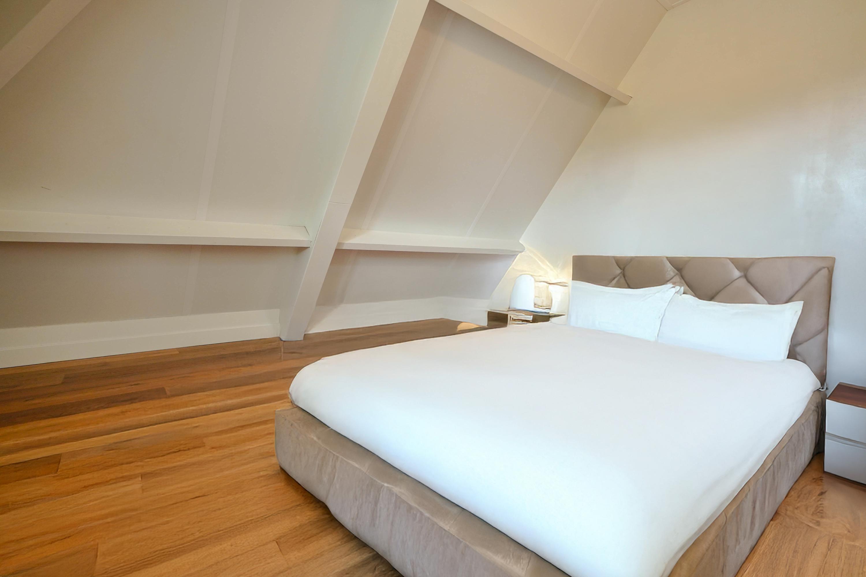 A spacious landing gives access to all rooms. The ceiling height is 2.9 meters throughout. Solid wood flooring (except in bathroom and toilet) is laid over the concrete subfloor across all rooms.