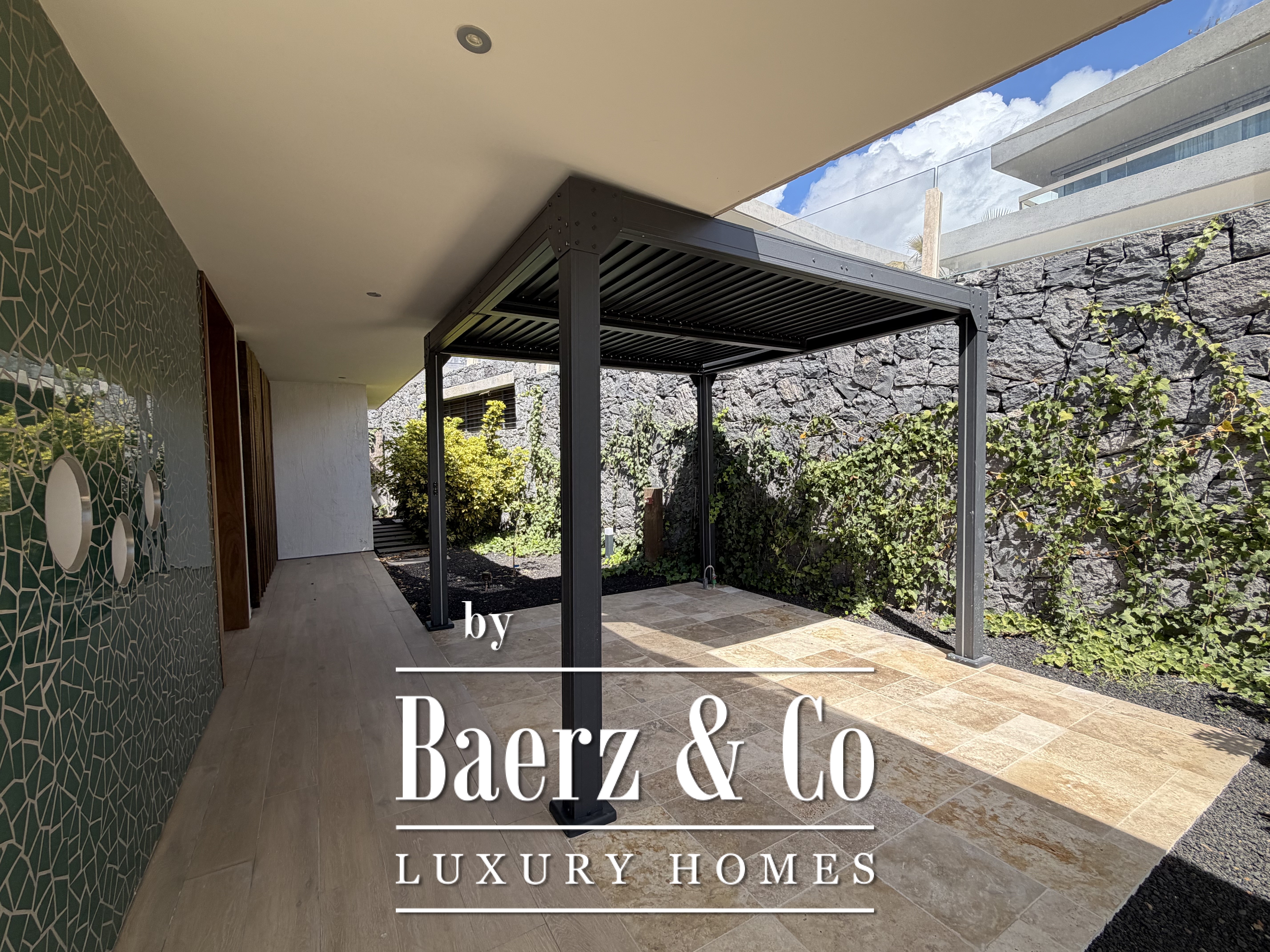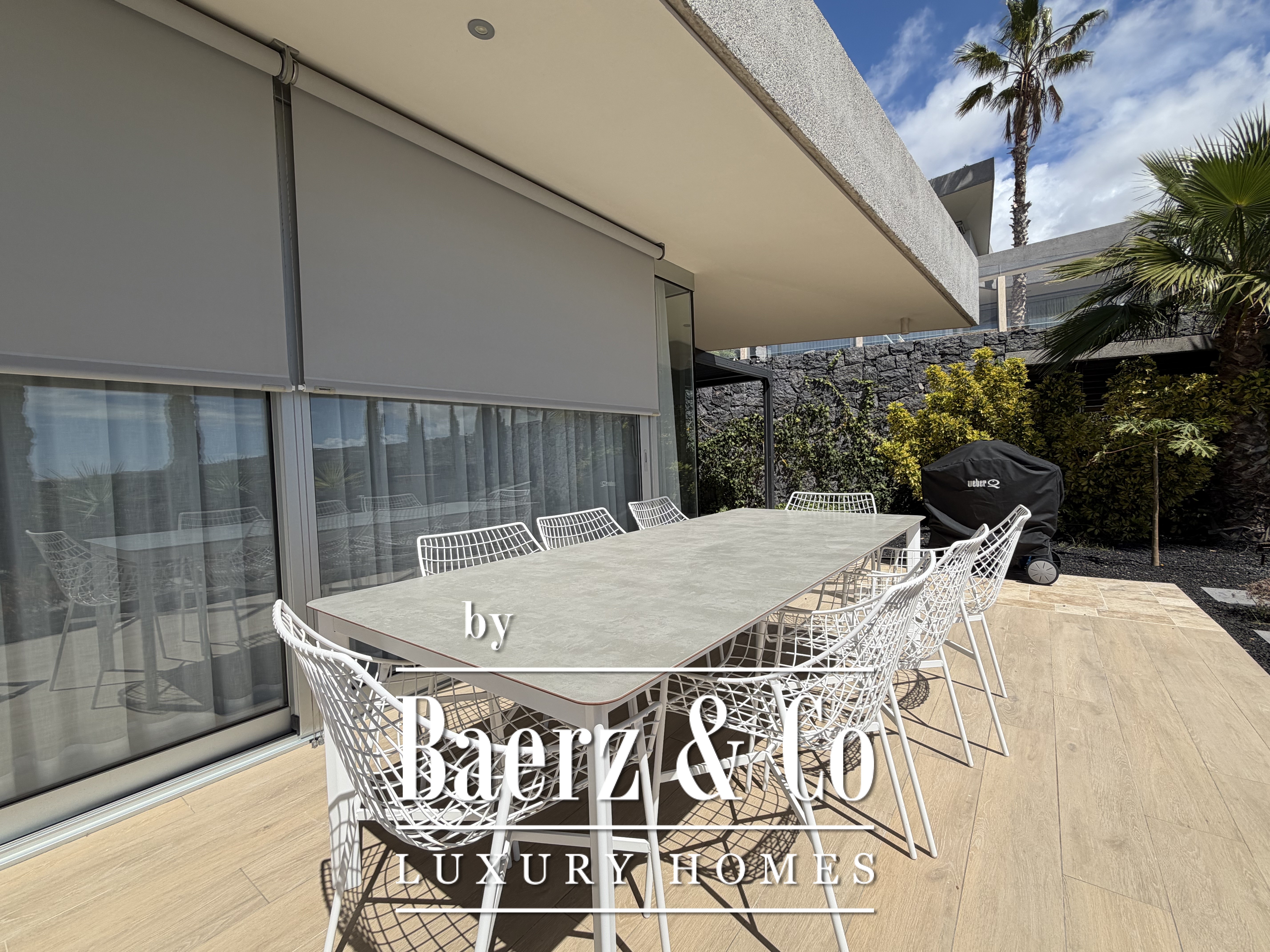 De woning beschikt over een garage voor één auto en een buggy en wordt volledig gemeubileerd verkocht met luxe meubilair, inclusief tuinmeubelen. De ramen zijn voorzien van automatische zonwering die het zonlicht reguleert zonder het natuurlijke licht te verliezen.