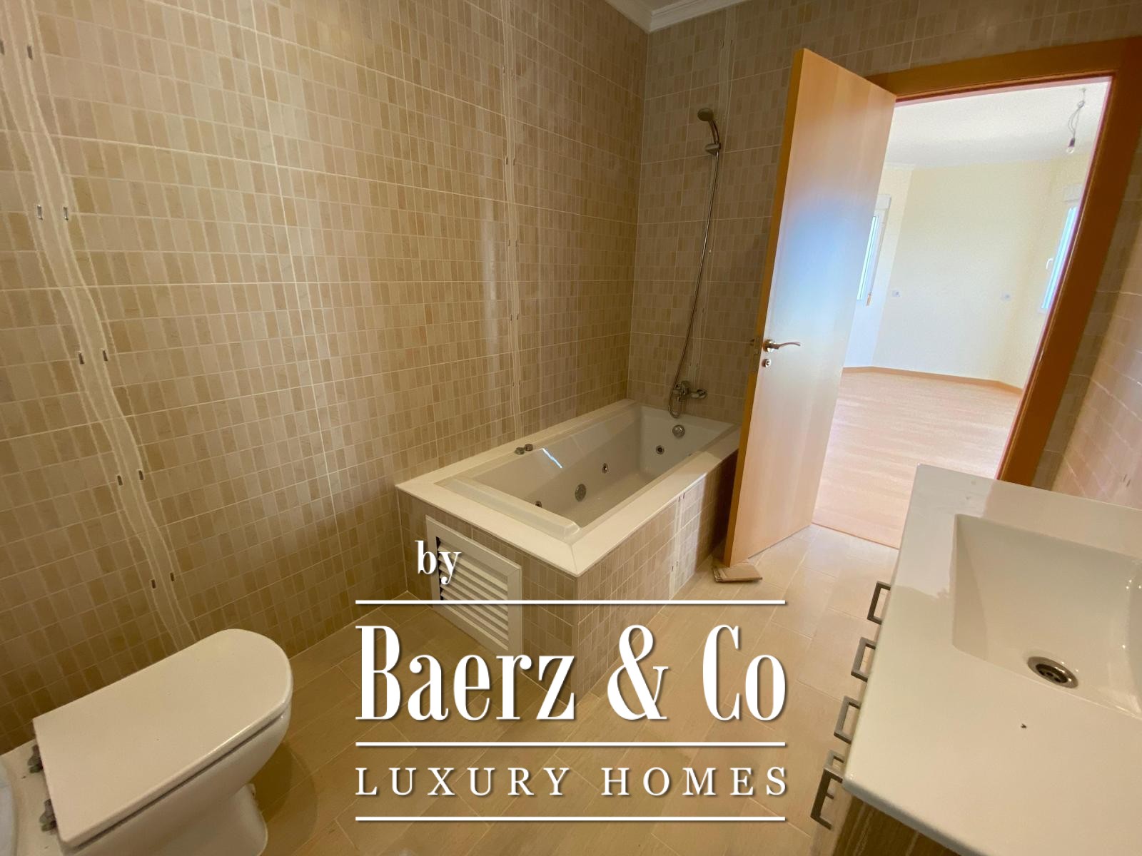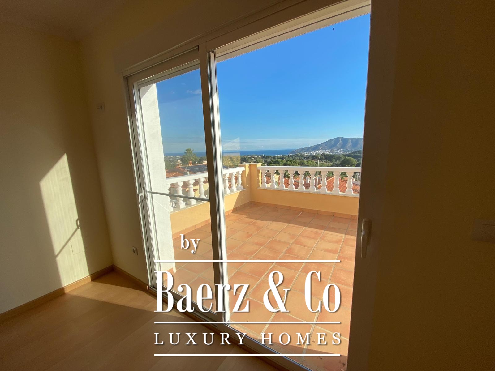 Binnen opent de heldere en ruime woonkamer naar een balkon met panoramisch uitzicht op bergen en zee. De grote keuken heeft ook toegang tot het balkon, perfect om maaltijden met uitzicht te genieten. Twee slaapkamers delen een complete badkamer op deze verdieping.