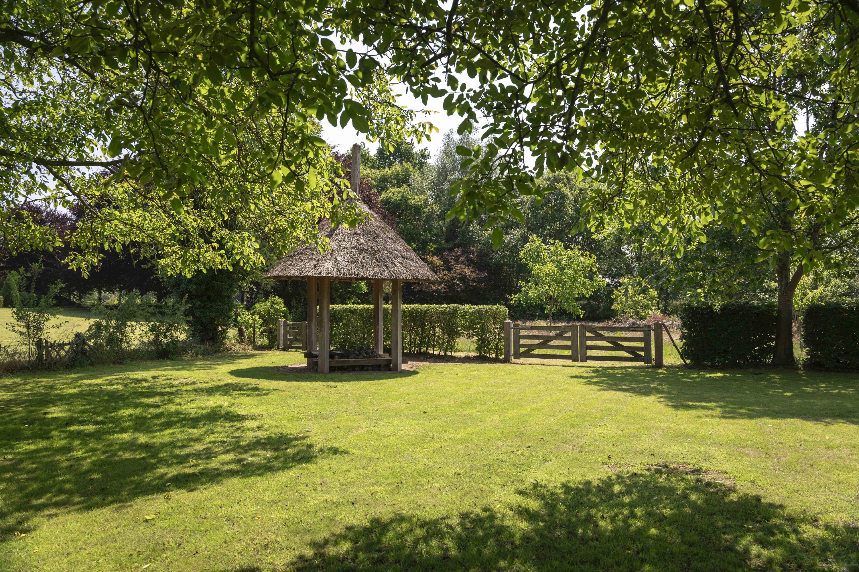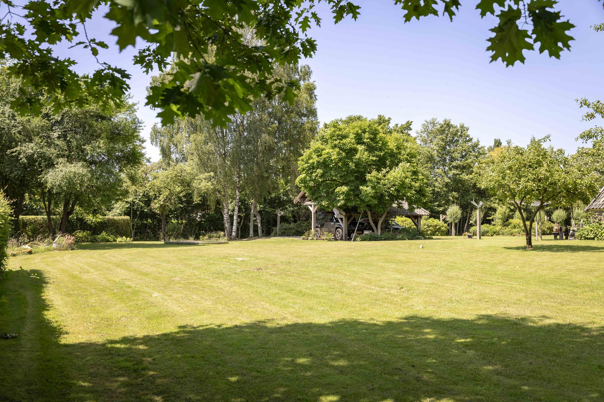Rond het huis is een prachtige tuin aangelegd, omzoomd door een haag. De oprit wordt speels geflankeerd door rododendrons en aan het einde ervan staat een open kapschuur met ruimte voor twee auto’s. Door de tuin heen staan diverse volwassen bomen. Aan de achterzijde van de tuin is een zitje ingericht, waar u een magnifiek uitzicht hebt over uw erf.