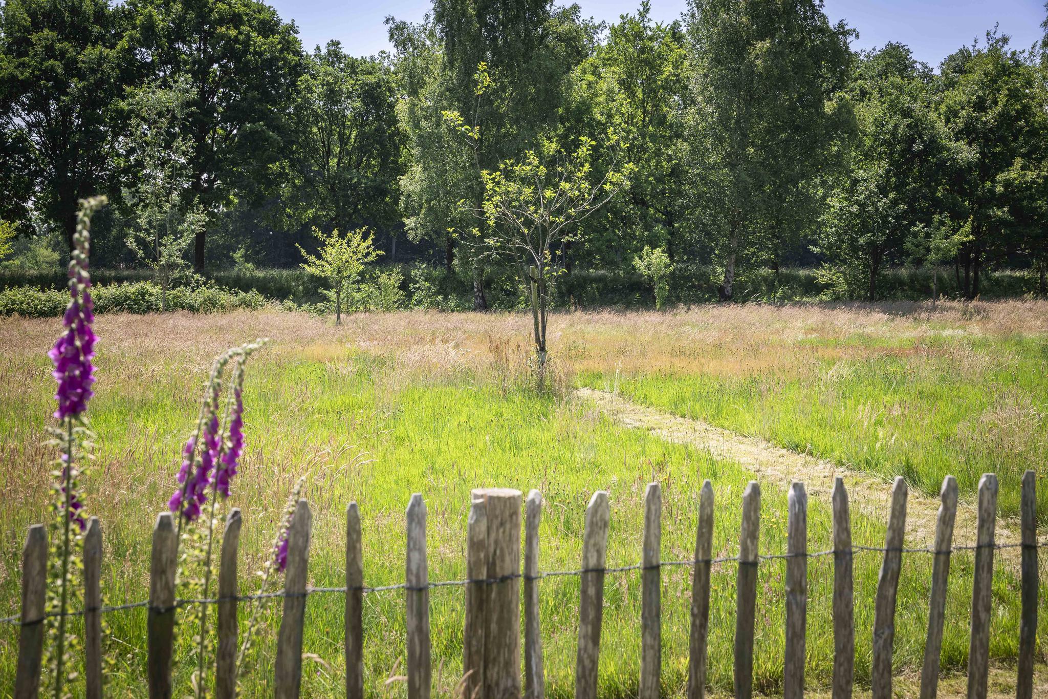 Het weiland tussen het Twentekanaal en de tuin is aangeplant met jonge fruitbomen.