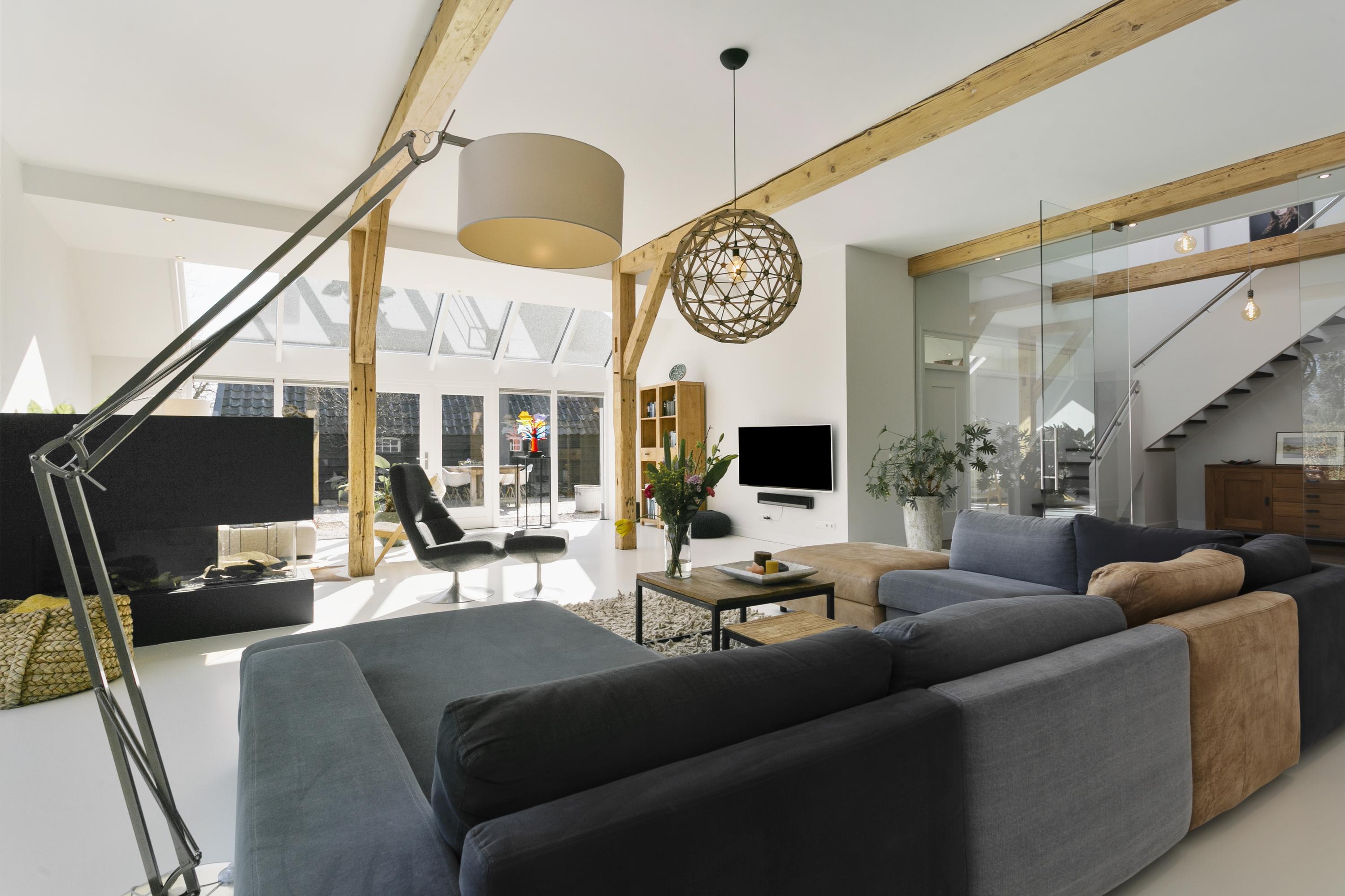 De voormalige deel is nu een riante leefruimte (70 m²). Aan de zuidzijde zijn zowel het zichtbare deel van het dak als de wanden ingevuld met glas, waardoor de ruimte baadt in daglicht. Op de vloer ligt een lichte gietvloer, die perfect samenwerkt met de vloerverwarming. De blikvanger in de kamer is de openhaard achter glas, die met één knop ervoor zorgt dat er een aangenaam vuurtje brandt.
