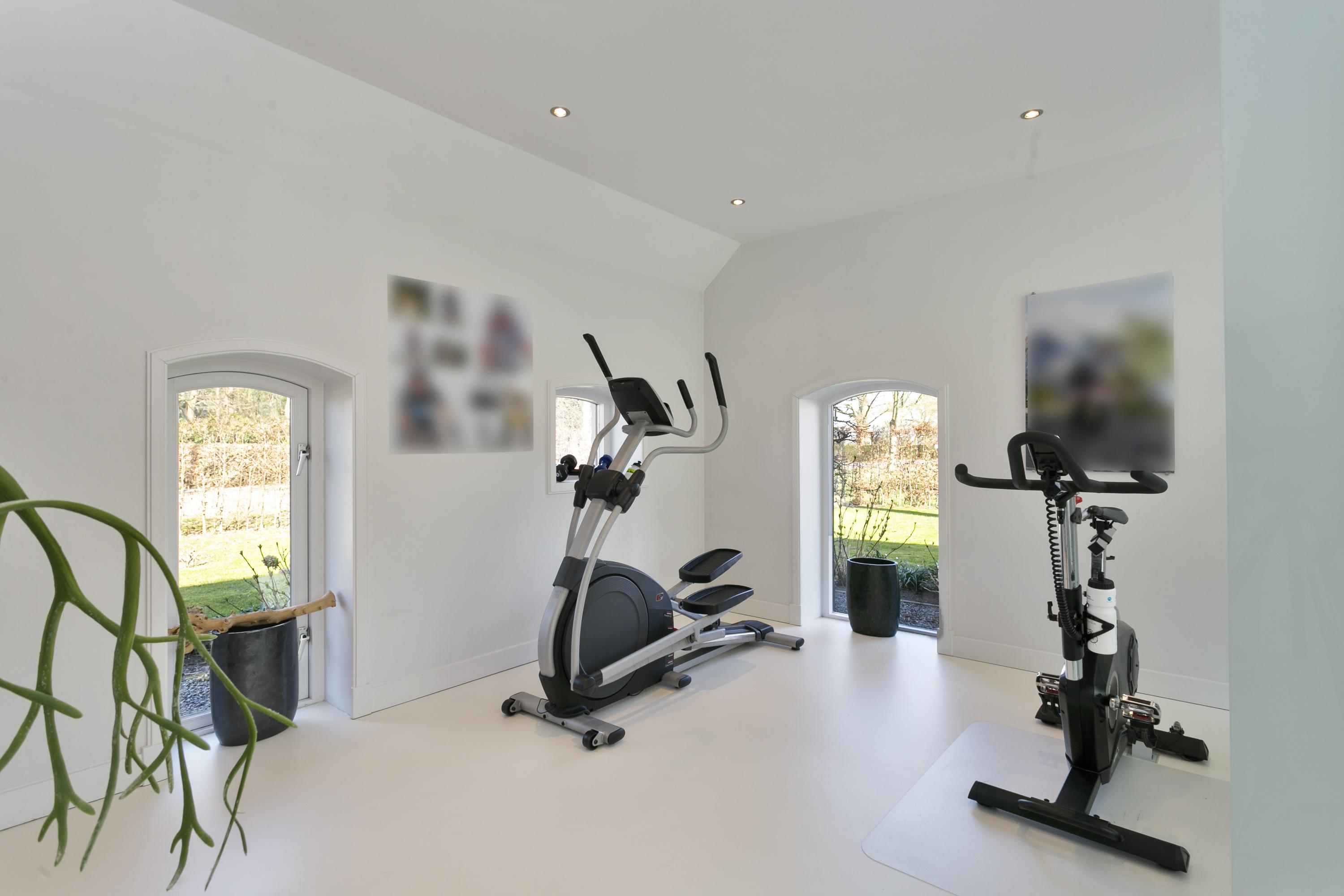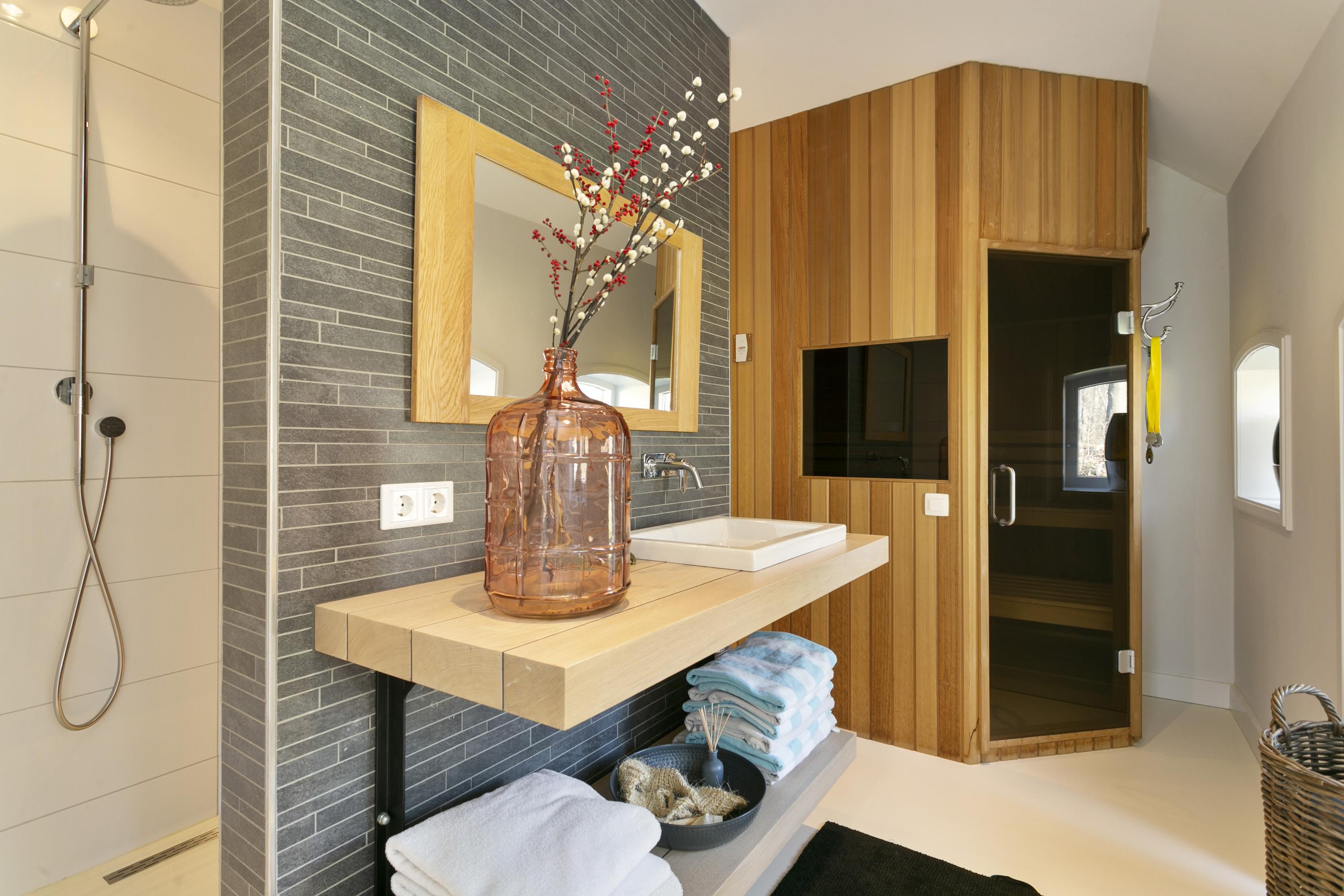Aan de voorzijde van het huis links, de fitnessruimte en de wellness; een prachtige badkamer met dubbele douches, wastafel en Finse sauna (6-persoons)
