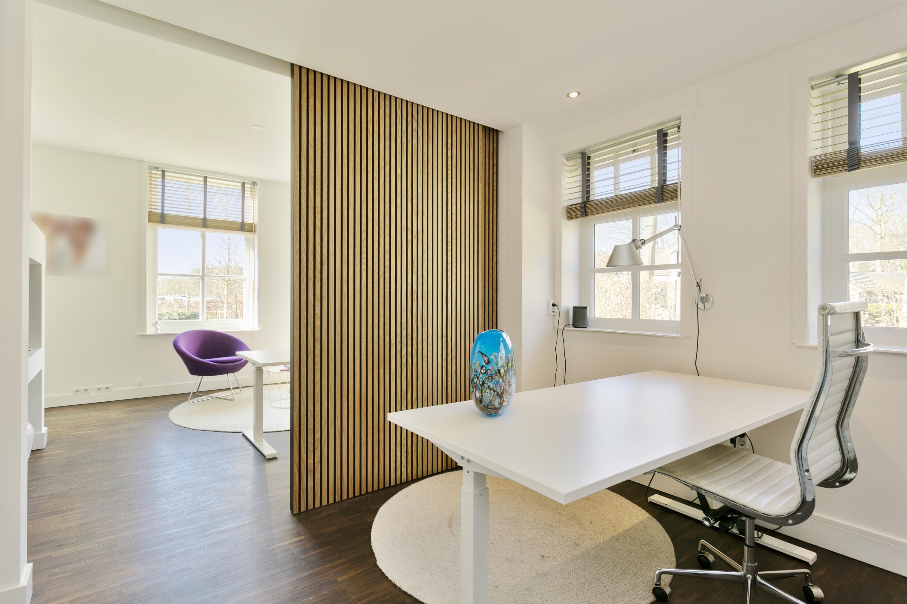 Vanuit de entree links een dubbele werkruimte, gescheiden door een geluiddempende wand, met aan de achterzijde een bergruimte.