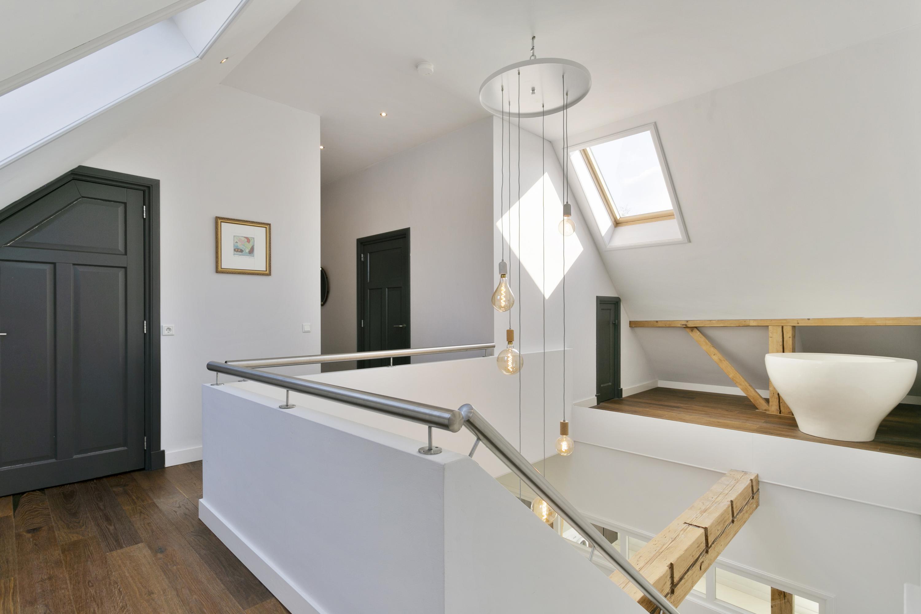 Vanuit de centrale hal de trap naar de verdieping, in de vorm van een grote vide met daaromheen de overloop. Op de vloer walnootkleurig parket; onderhoudsvriendelijk en robuust.