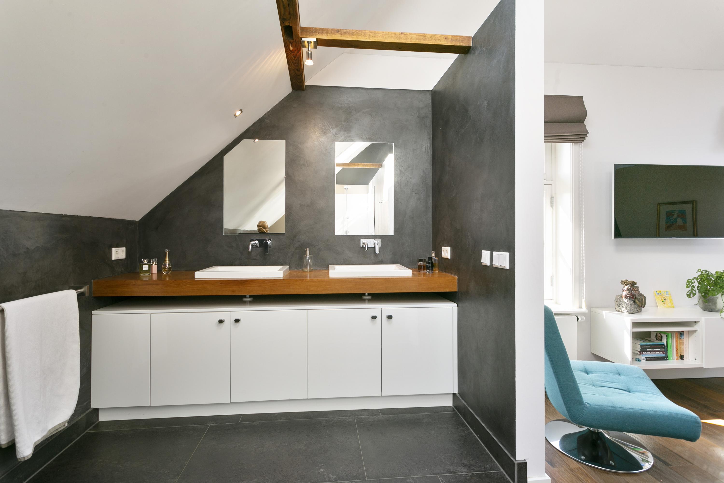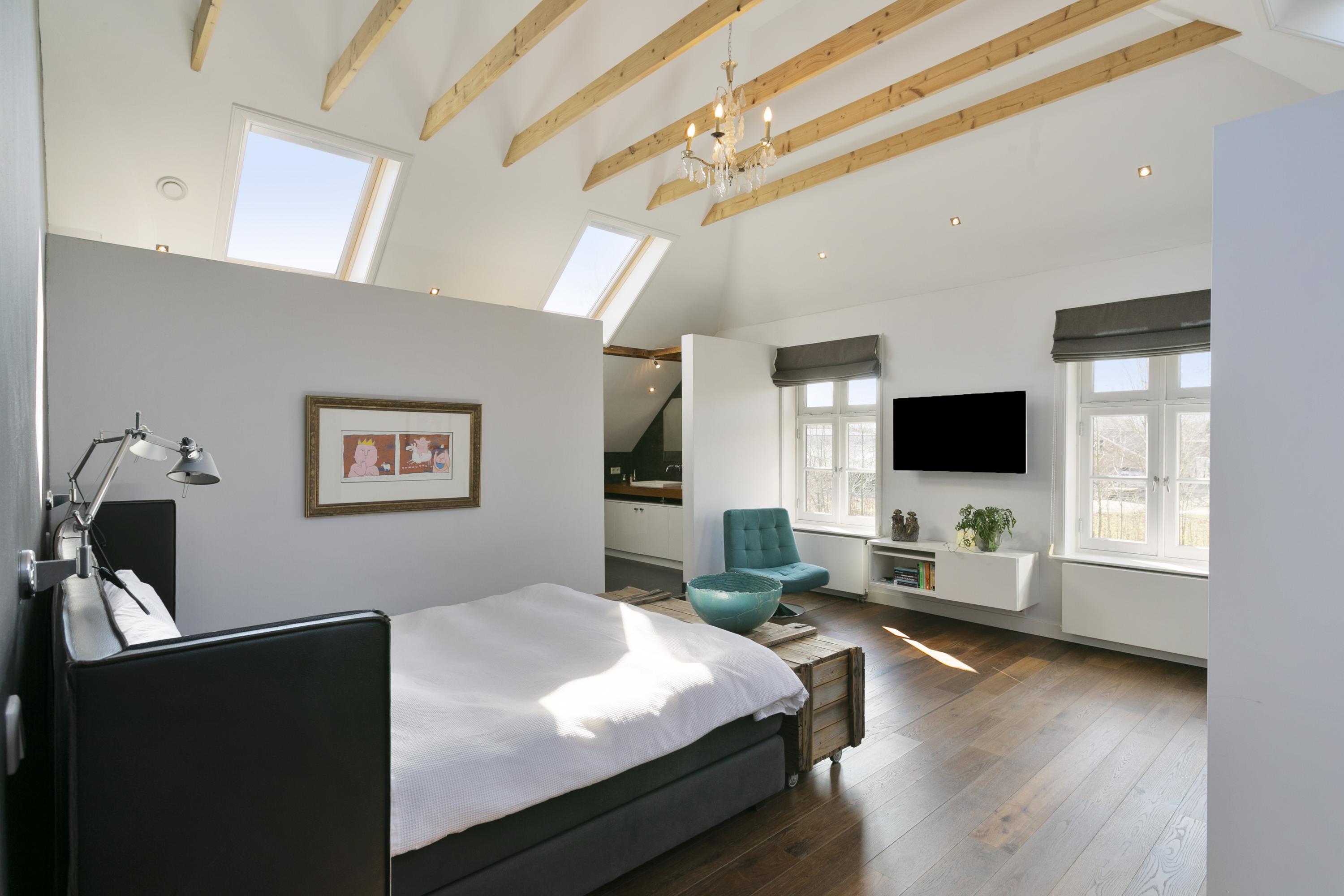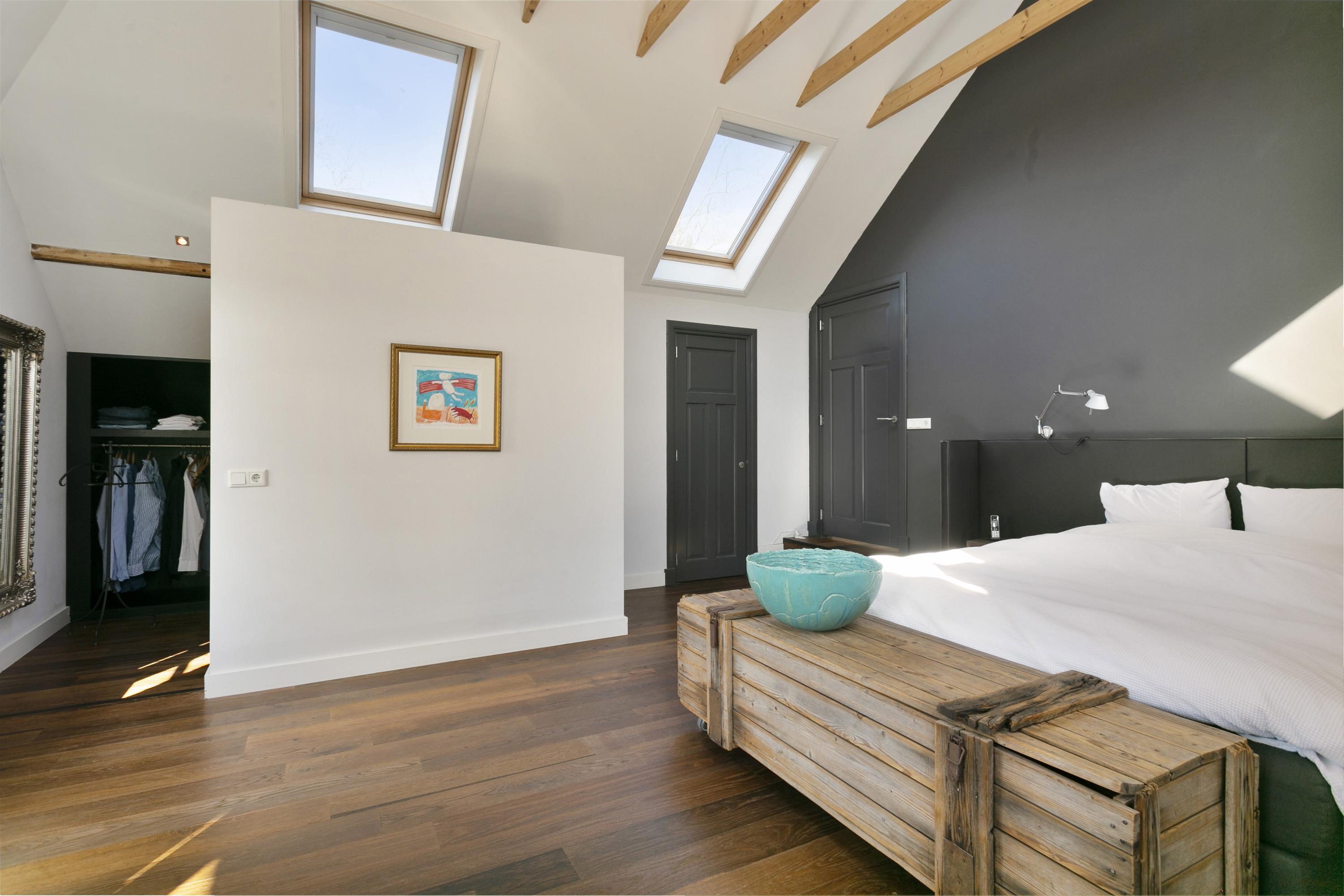 Rechts de ouderslaapkamer (50 m²), met een ruime inloopkast en een prachtige badkamer met ligbad, WC, 2 wastafels en inloopdouche. Aan beide zijden veel extra bergruimte.