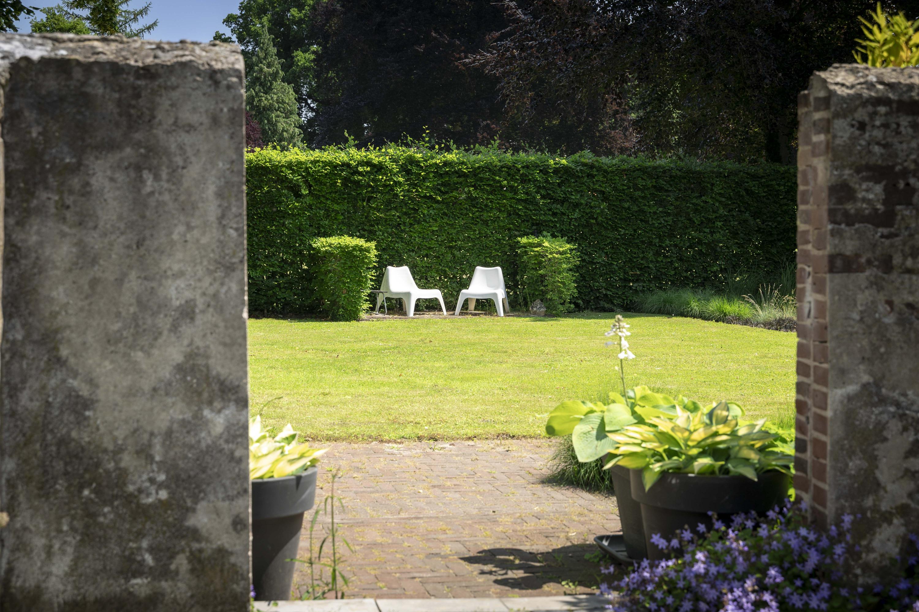 Zo modern als het huis vanbinnen is, zo lieflijk en schilderachtig is de tuin. Als een waar groen paradijs, met grote gazons, een boomgaard en schitterende terrassen. Even behoefte aan een frisse neus? Achter in de tuin is de oever van het Twentekanaal te bereiken middels een bruggetje.