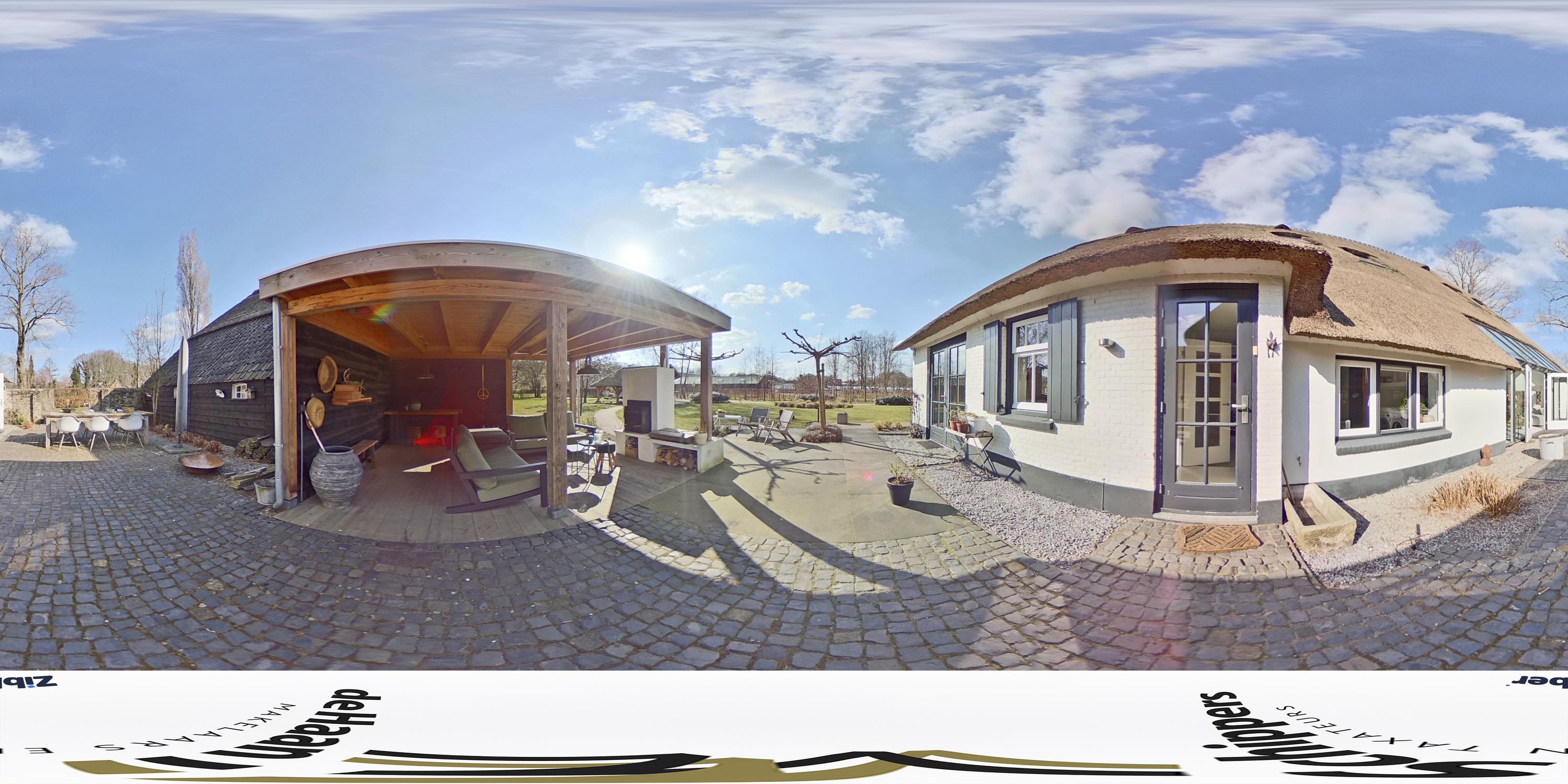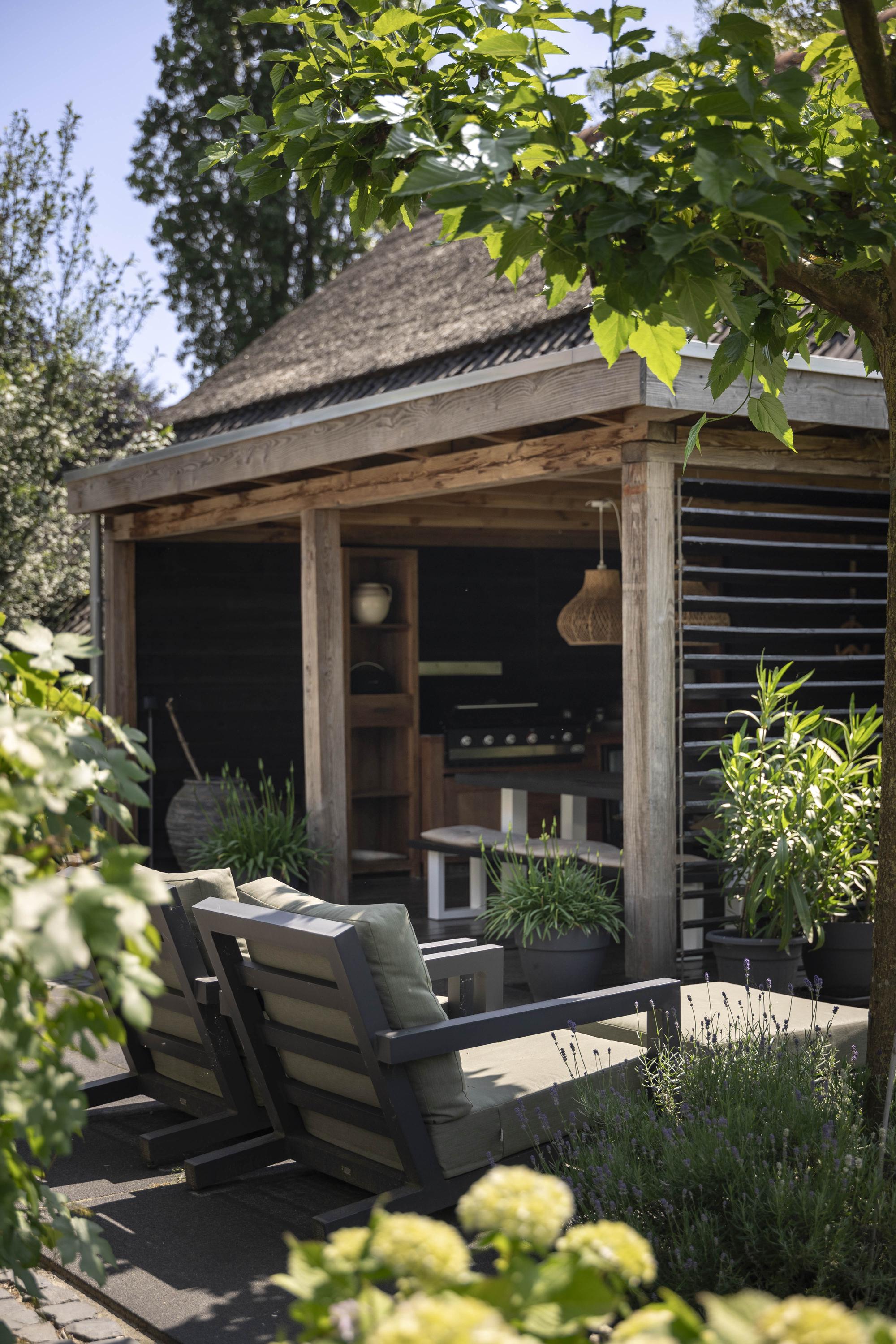 De bezonning is ideaal; de achtertuin ligt perfect op het zuiden gericht. Achter het huis, toegankelijk vanuit de woonkamer, keuken en bijkeuken, het heerlijke zonneterras. Onder de overkapping is een loungehoek ingericht met een leemkachel.