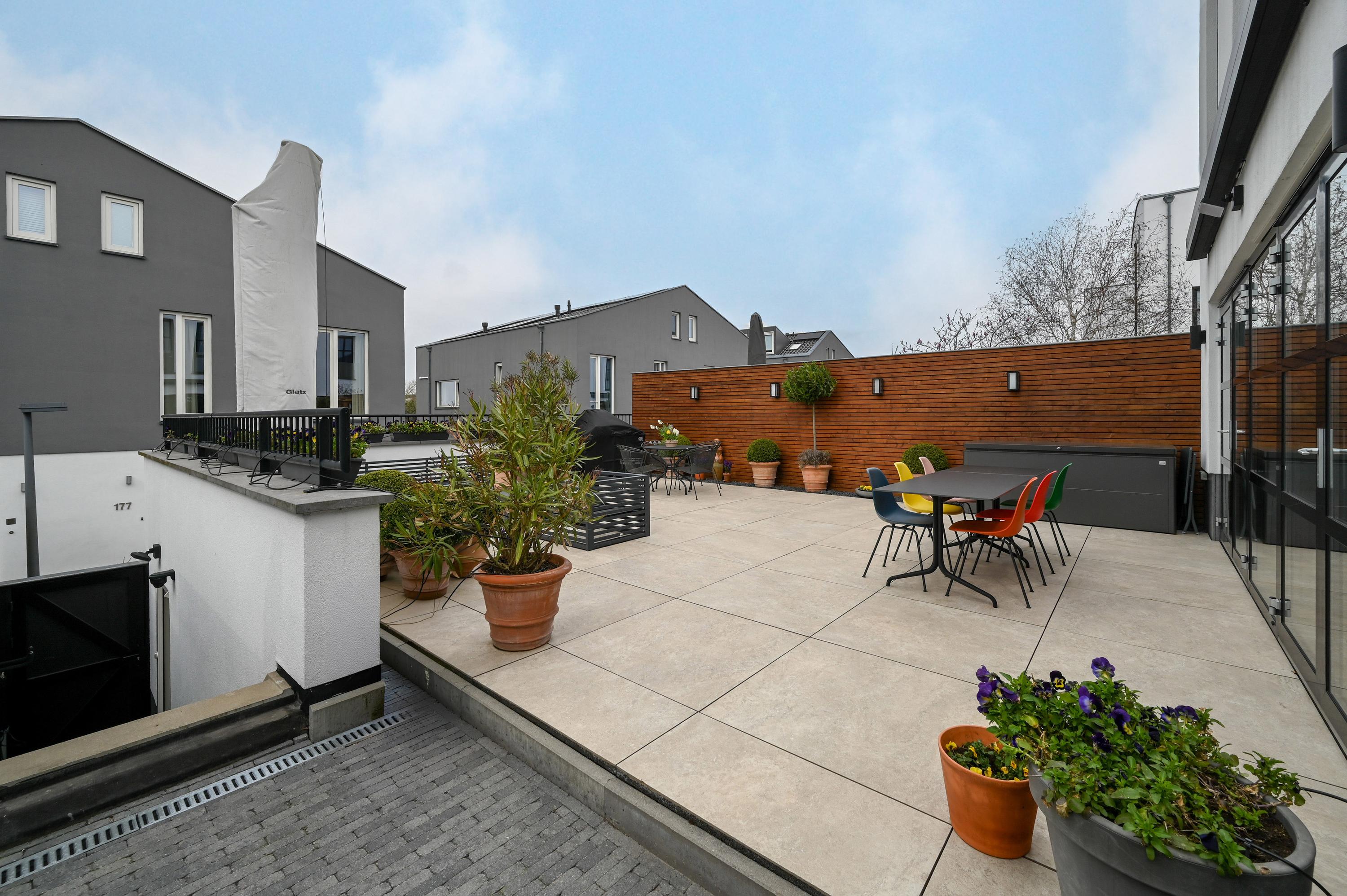 Het terras is volledig betegeld met grote, lichte tegels en omlijst met verzorgde beplanting langs de randen. Dankzij subtiele tuinverlichting ontstaat hier een stijlvolle en uitnodigende buitenruimte, waar u zowel overdag als ’s-avonds van het buitenleven kunt genieten. Het elektrische zonnescherm zorgt voor schaduw wanneer nodig.