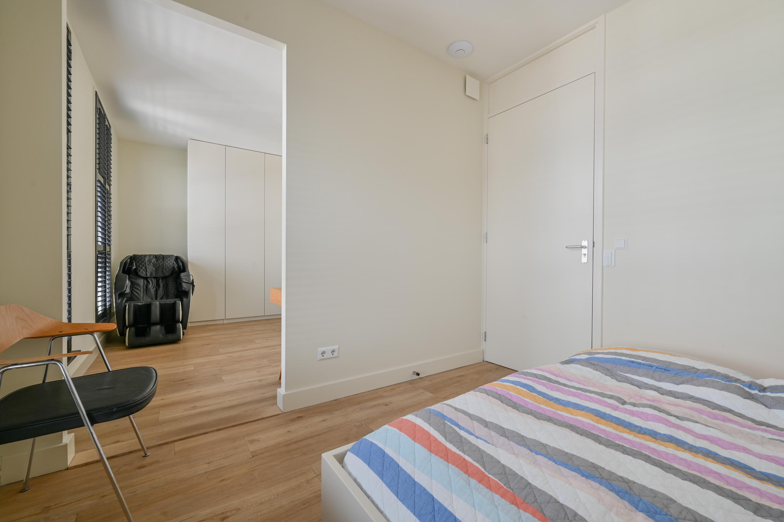 Aan de voorzijde bevinden zich nog twee kamers: momenteel is één kamer in gebruik als stijlvolle kantoorruimte terwijl de andere dienstdoet als riante master-bedroom. Deze master is uitgerust met een op maat gemaakte kastenwand en een luxe ensuite badkamer. De badkamer straalt elegantie uit met lichte designtegels, een inloopdouche met dubbele stort- en handdouche, een lichtstraat die daglicht overvloedig naar binnen laat, een dubbele wastafel met Hotbath kranen en voorzien van lades, een strak wandmeubel en een automatisch toilet met afstandsbediening.