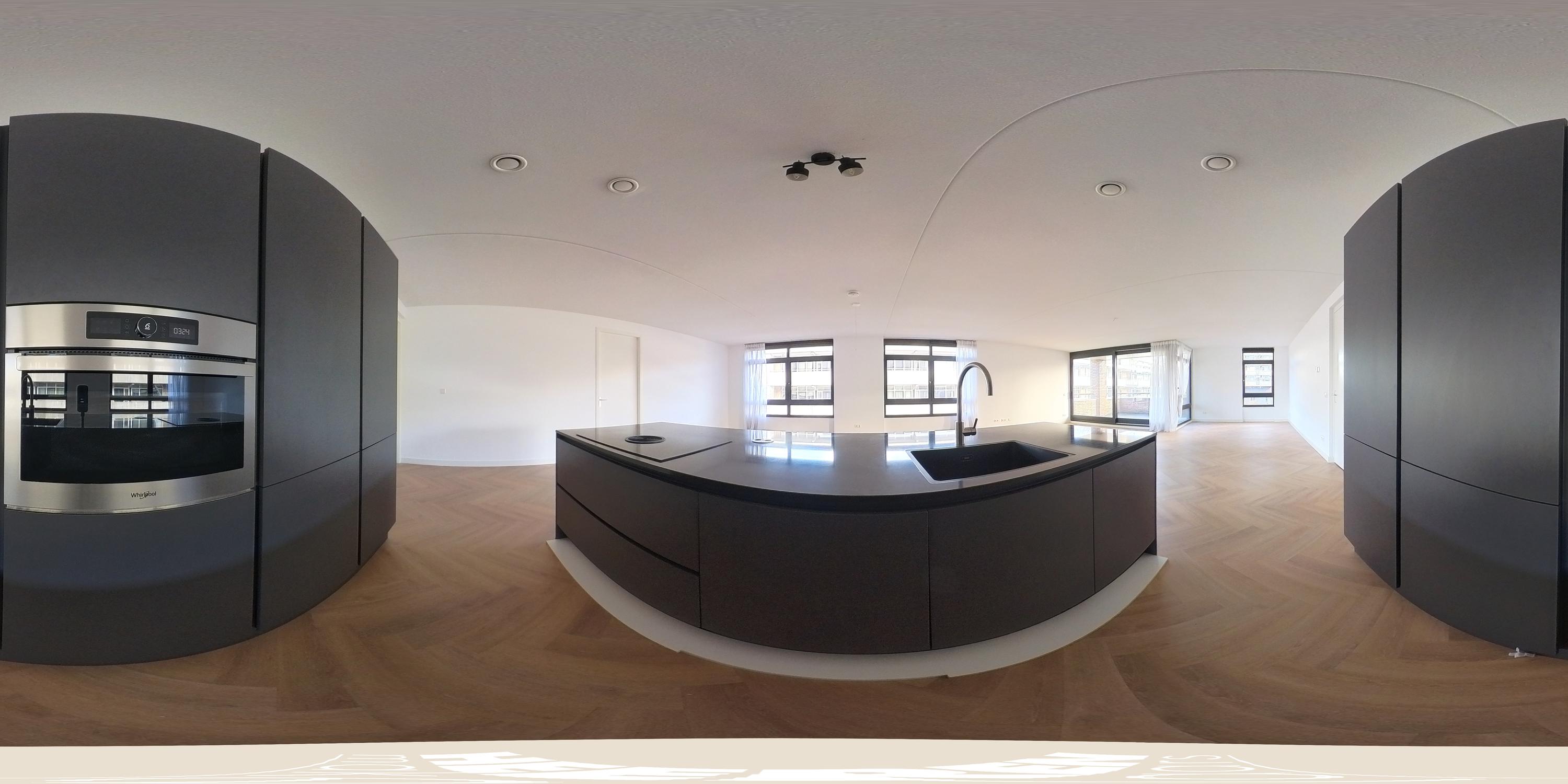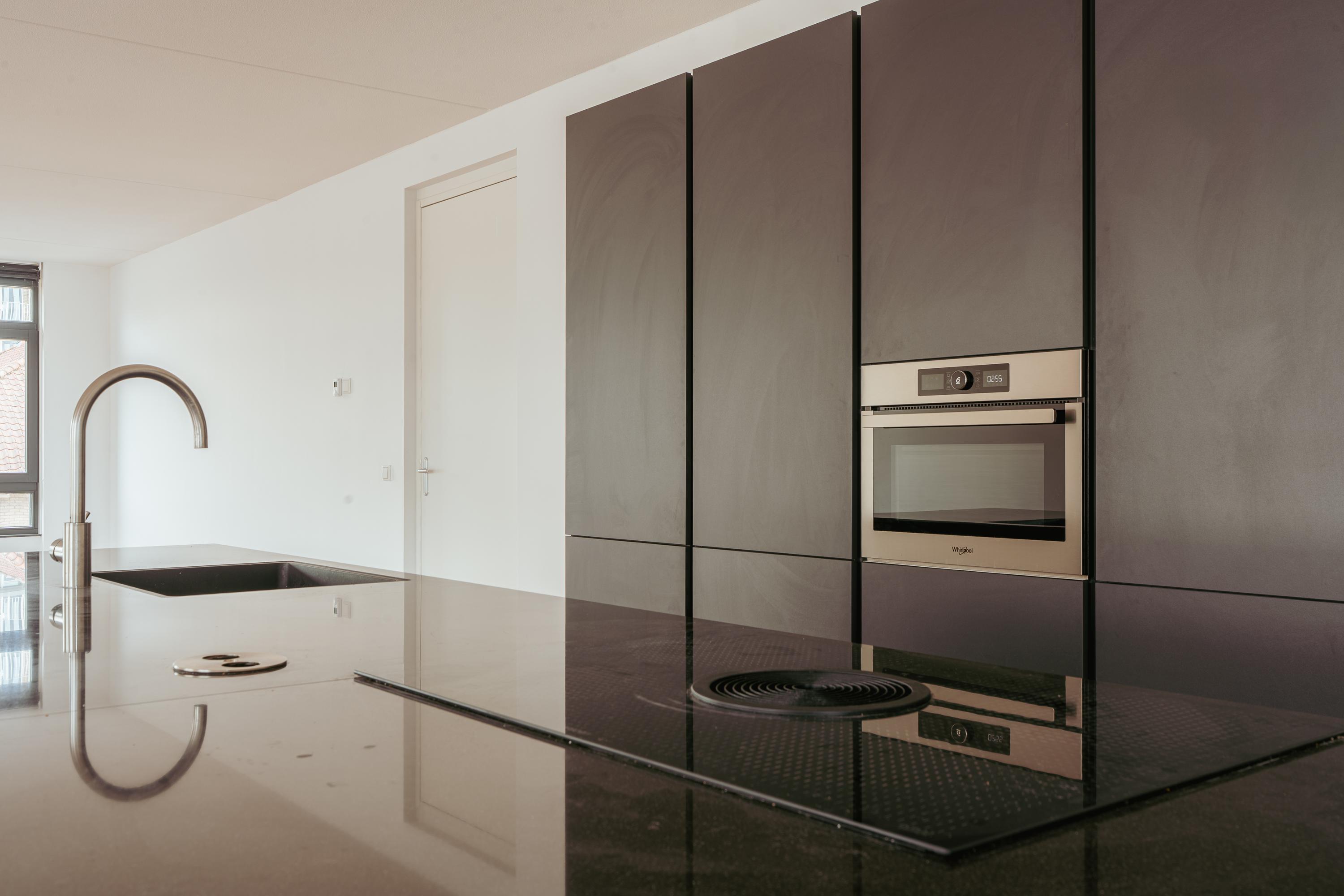 U bereikt het appartement comfortabel met de lift, waarna u via de nette centrale hal binnenkomt in deze prachtig afgewerkte woning. De entree leidt naar een brede gang die uitkomt bij dubbele deuren naar de royale woonkamer, waar direct het gevoel van licht, ruimte en verfijning overheerst. De open keuken met royaal kookeiland vormt het kloppend hart van het appartement en is uitgevoerd met maatwerk houten kasten, een natuurstenen werkblad en hoogwaardige inbouwapparatuur met geïntegreerde afzuiging. Dankzij het stijlvolle bargedeelte is dit een heerlijke plek om samen te koken, te borrelen en te genieten van het huiselijke comfort.
