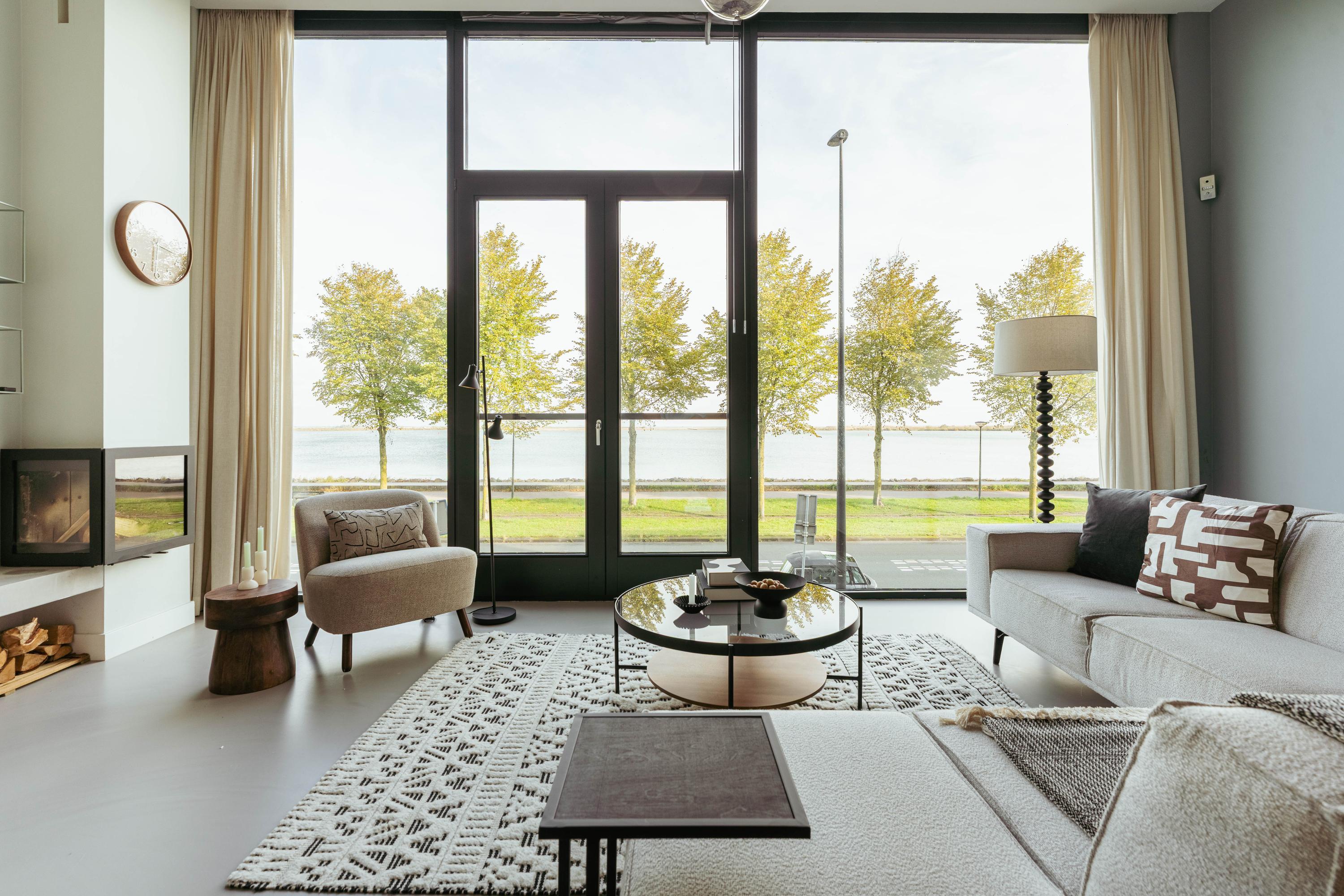 De eerste verdieping is ingericht als comfortabele woonverdieping met een speelse indeling en veel licht. Aan de voorzijde ligt de ruime woonkamer met een plafondhoogte van 2,60 meter en grote raampartijen met vrij uitzicht over het IJmeer. De openslaande deuren en haard creëren een sfeervolle, lichte ruimte met een vloeiende overgang tussen binnen en buiten.