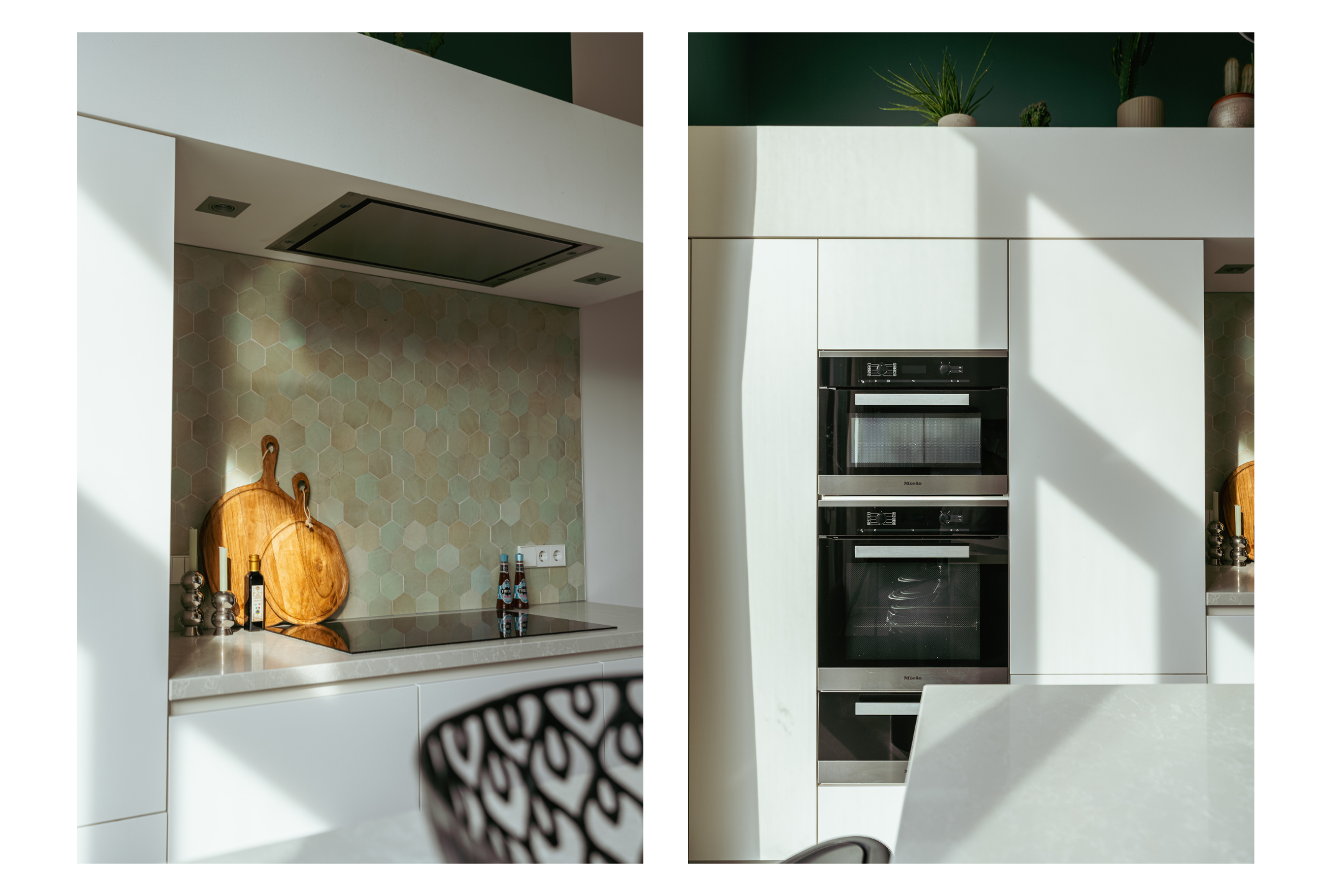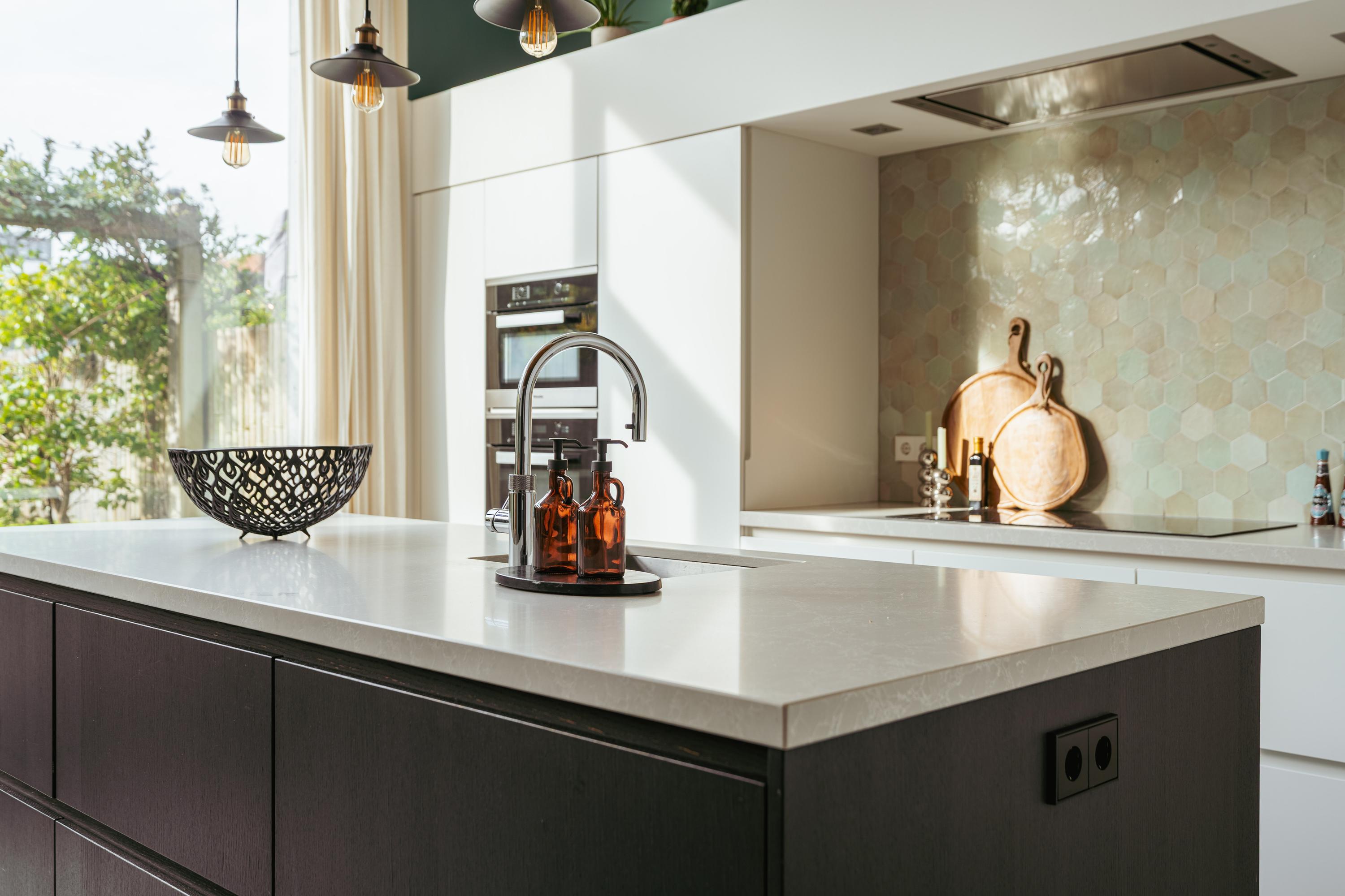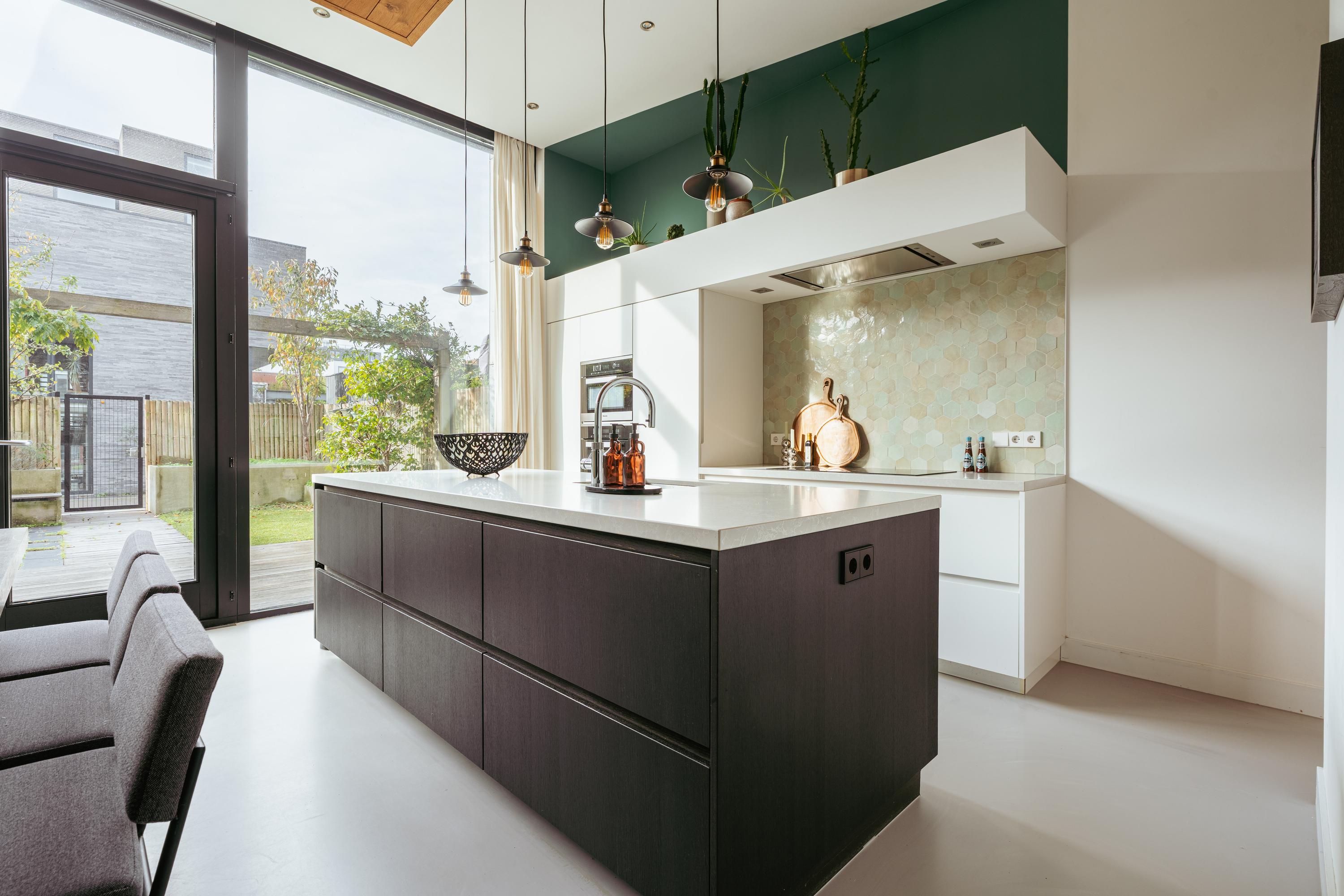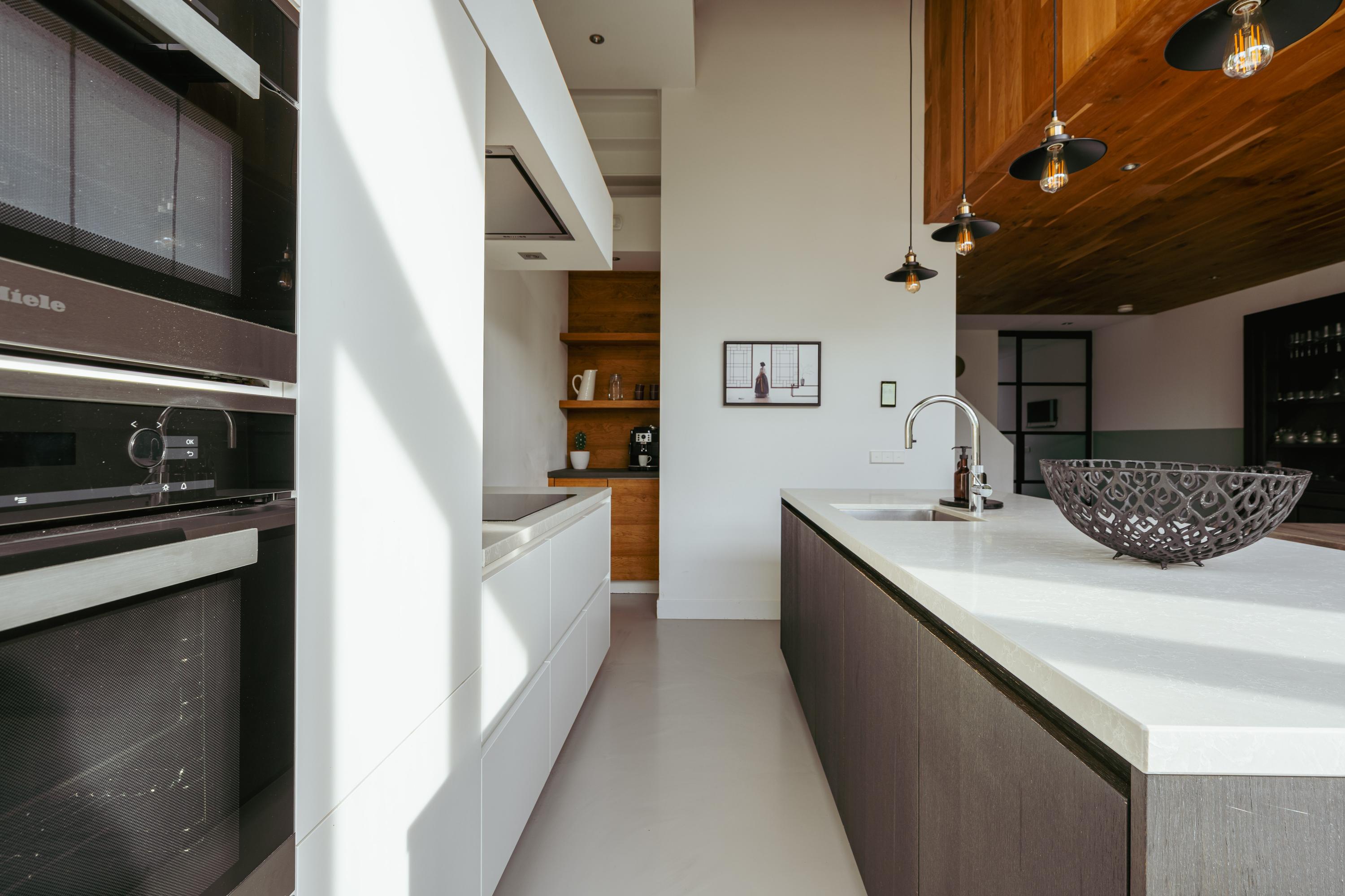 Via de glazen tussendeur bereikt u de ruime leefkeuken, gelegen aan de achterzijde met zicht op de tuin. De hoge plafonds en grote raampartijen tot aan de vloer zorgen voor een overvloed aan licht en een ruimtelijk gevoel. De moderne keuken is uitgerust met een groot kookeiland, composiet werkblad en hoogwaardige inbouwapparatuur, waaronder een vaatwasser, Quooker, inductiekookplaat, magnetron, oven en bordenwarmer.