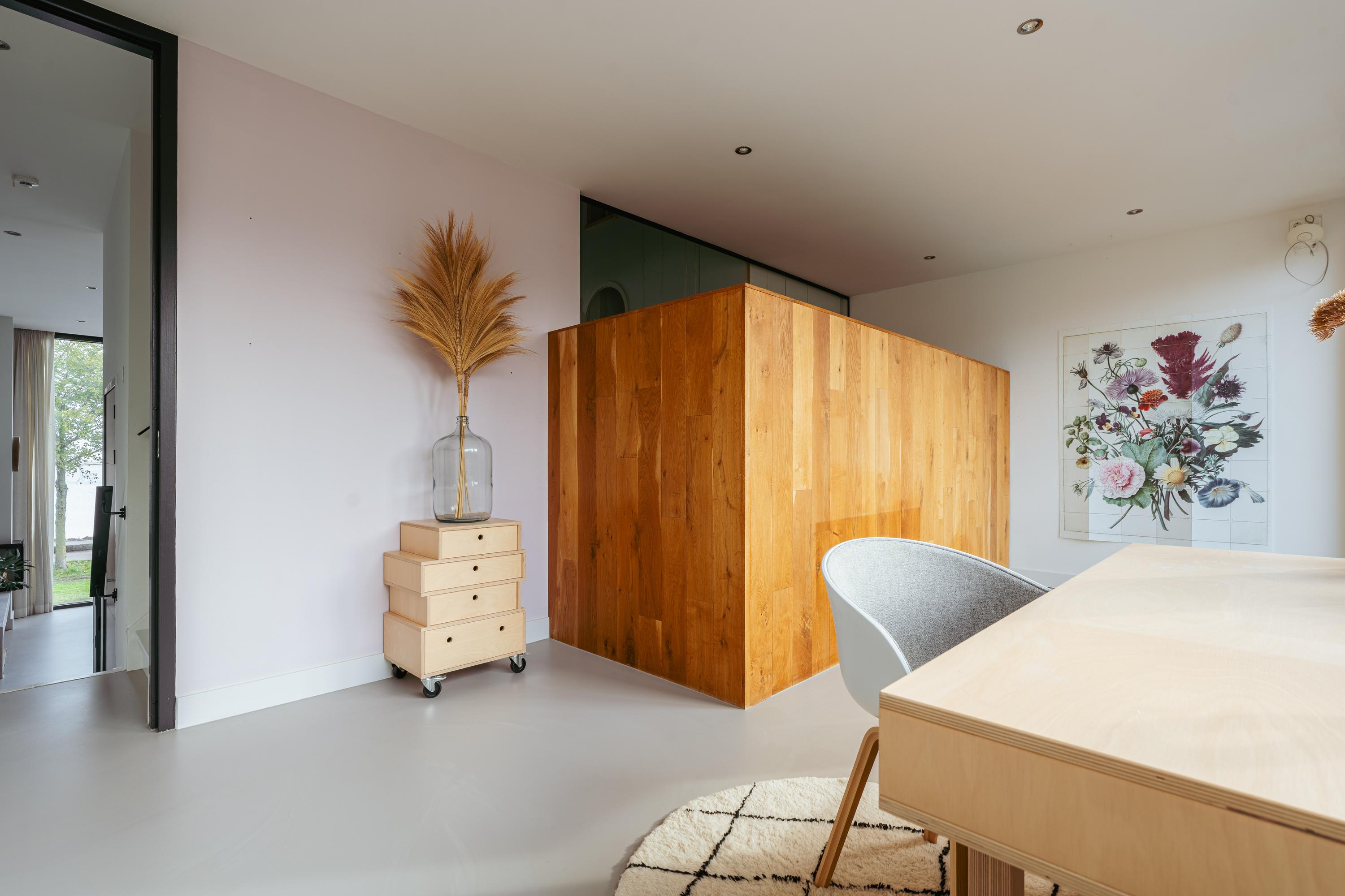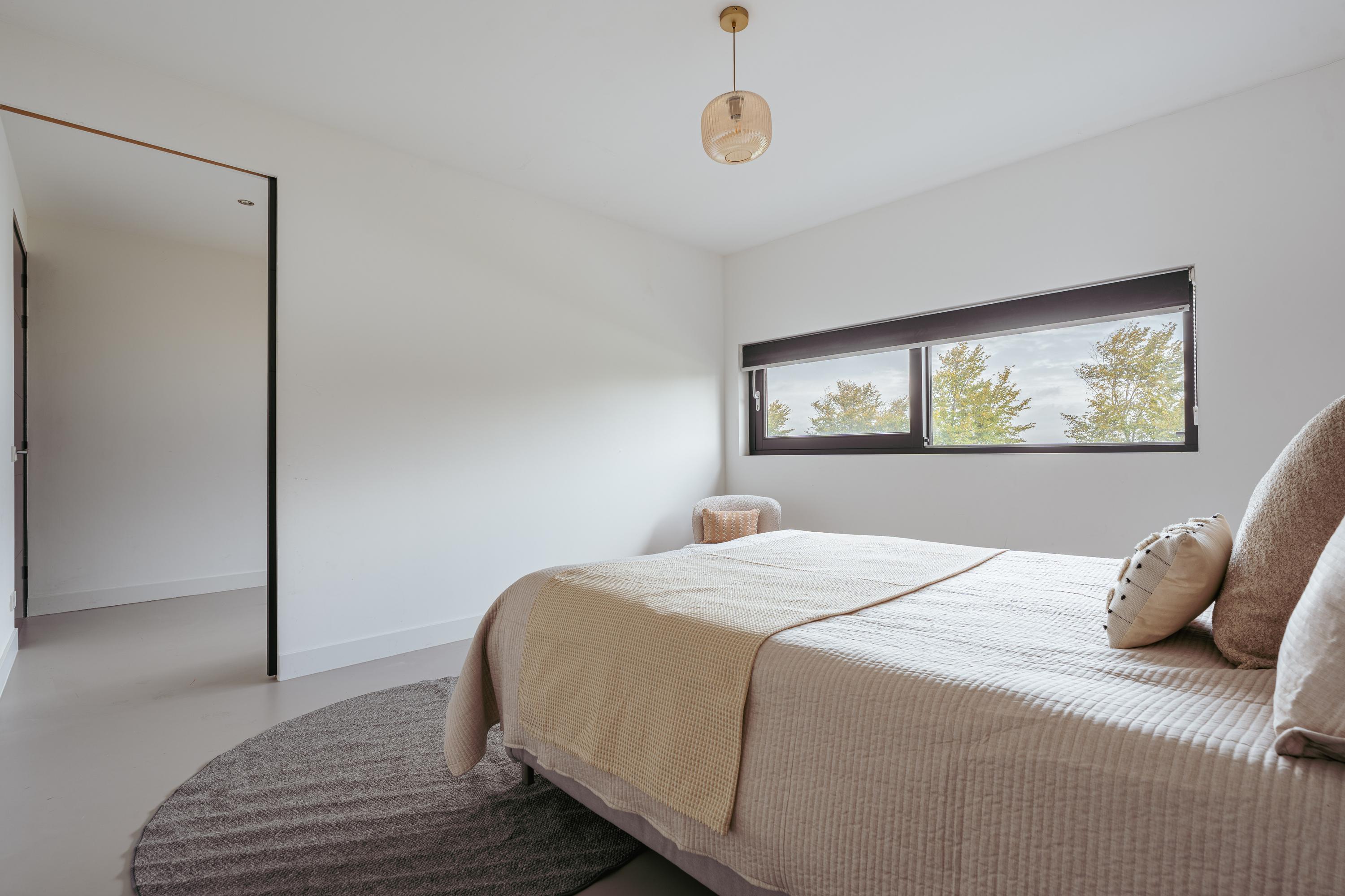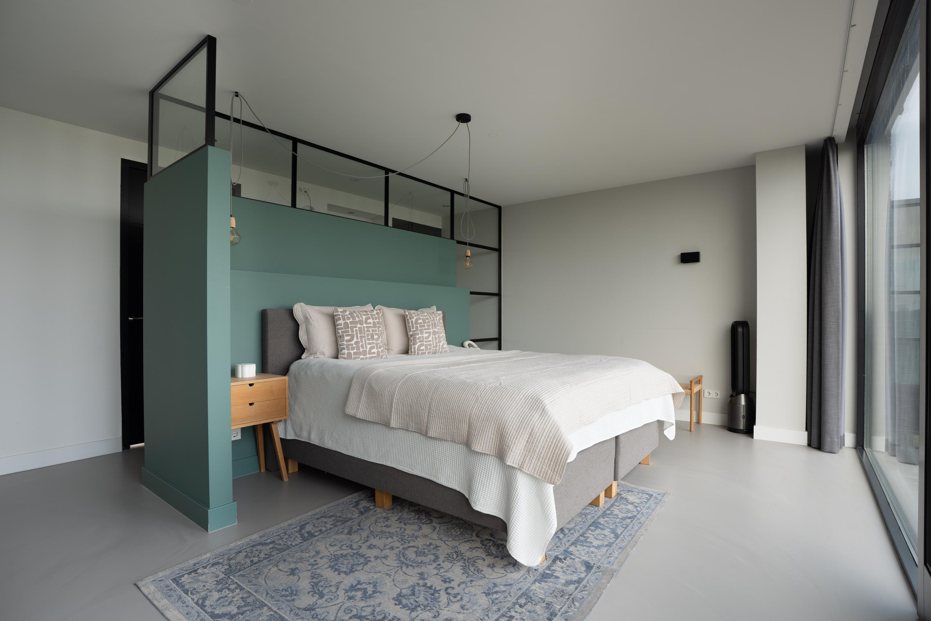 Daarnaast beschikt deze verdieping over een separaat toilet, een praktische berging en een vaste kast. De afwerking is modern en verzorgd, met een strakke gietvloer en glad gestucte wanden.
