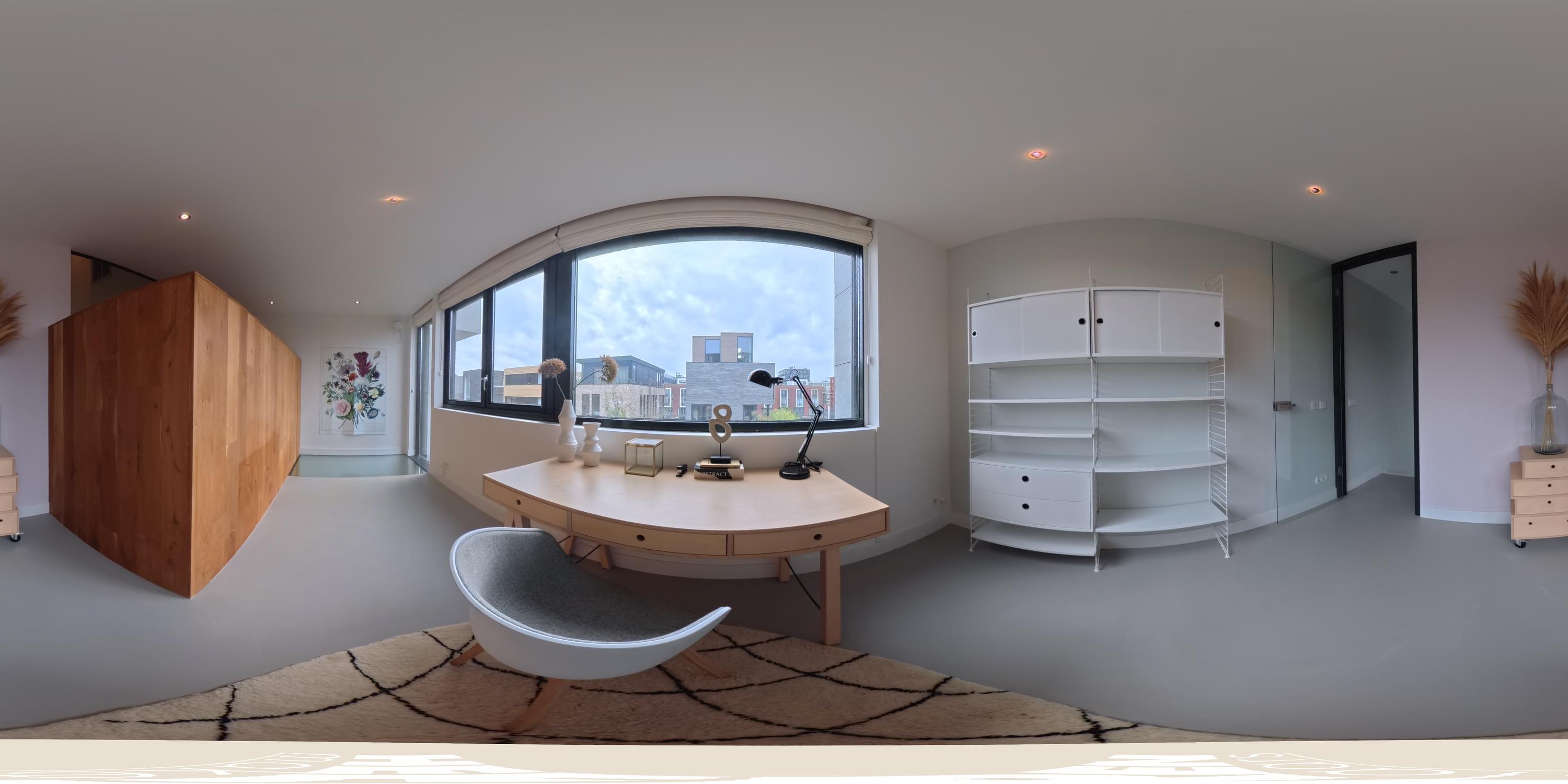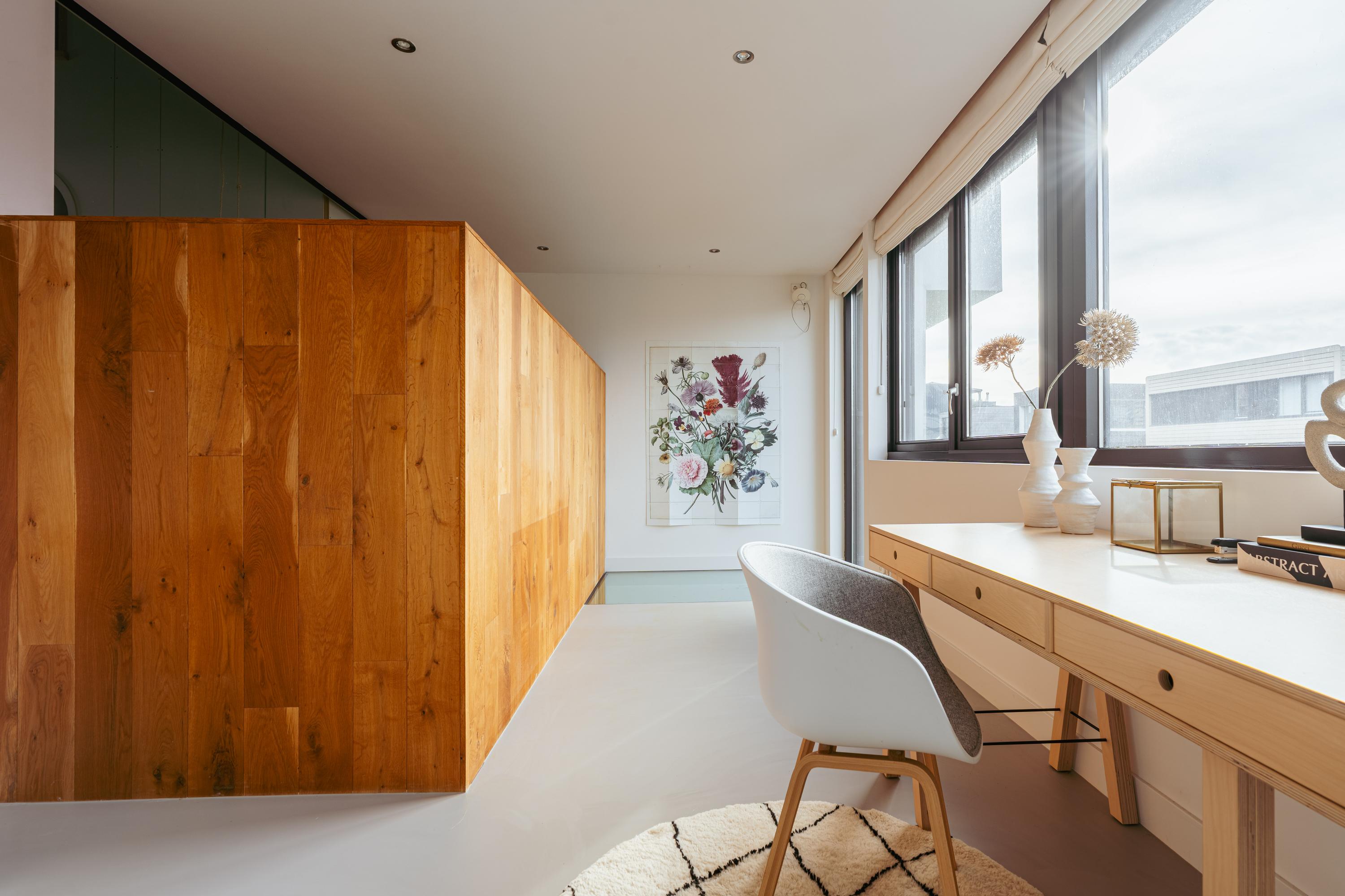 Aan de achterzijde ligt een tweede ruime werkkamer met veel daglicht en uitzicht op de groene binnentuin. Deze ruimte is ook uitstekend geschikt als speelkamer of extra slaapkamer.