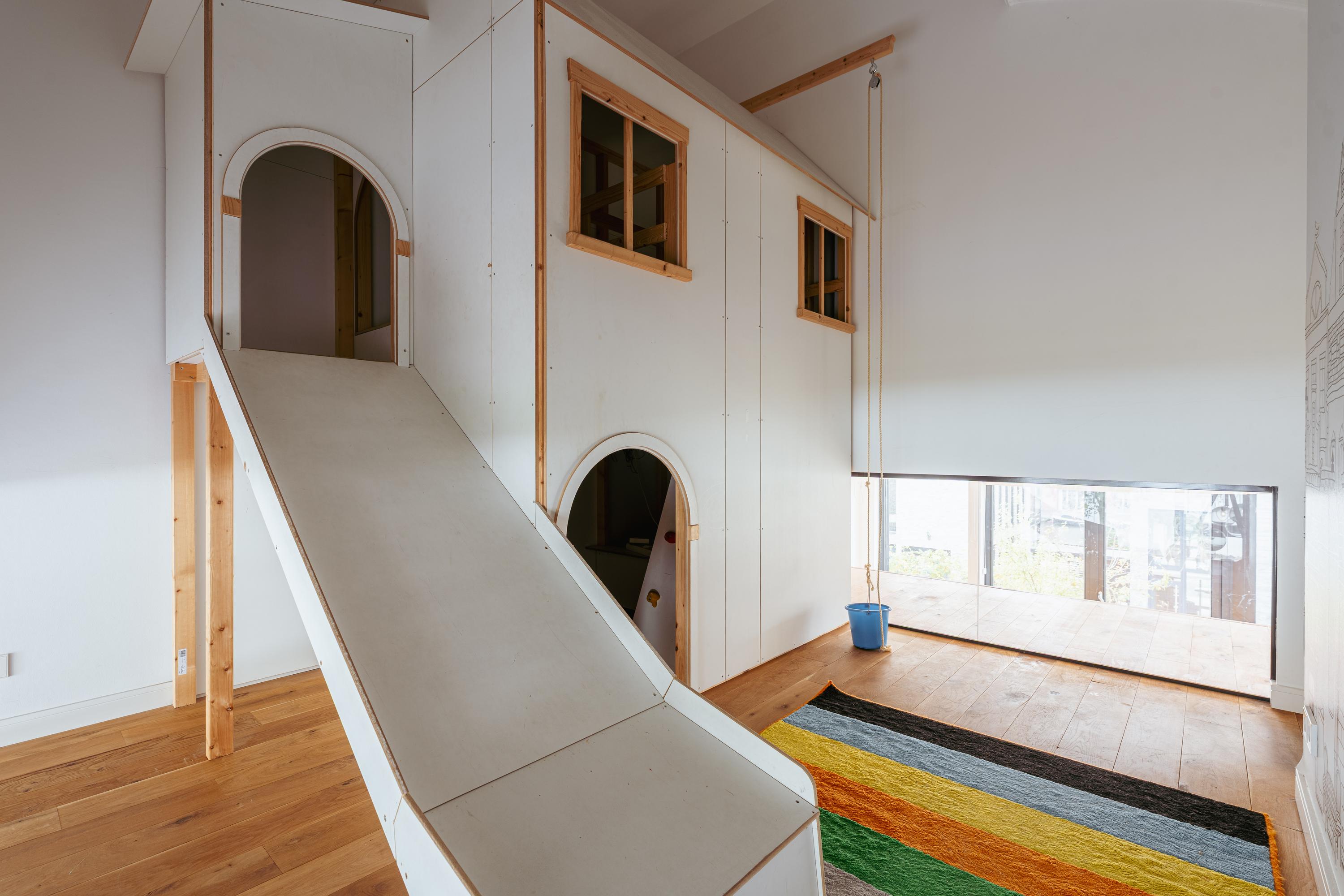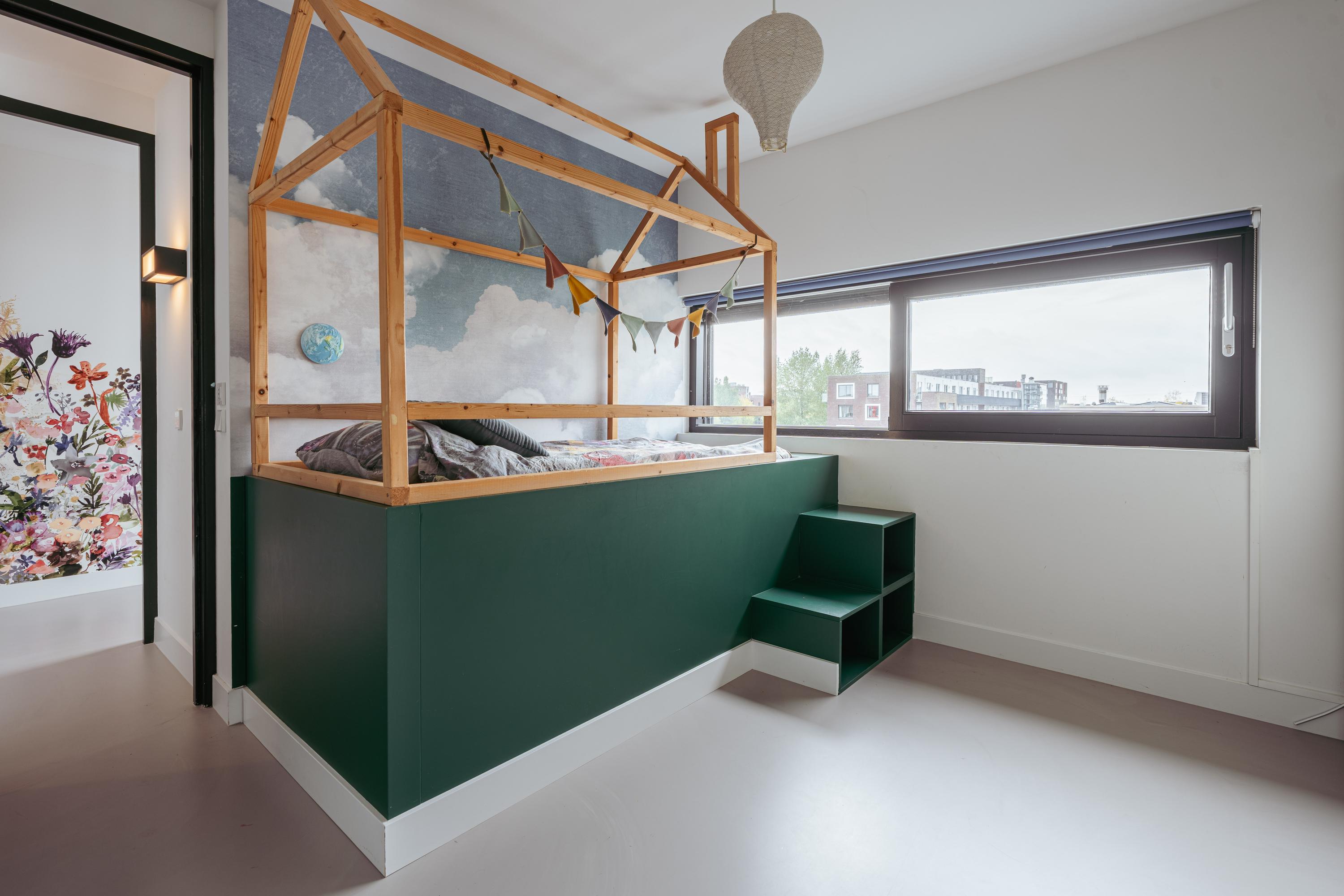 Via de trap vanaf de eerste verdieping bereikt u eerst een tussenverdieping, momenteel ingericht als unieke kinderspeelruimte met doorkijk naar de woonkamer. Deze creatieve ruimte vormt een echte blikvanger en benadrukt het gezinsvriendelijke karakter van de woning.