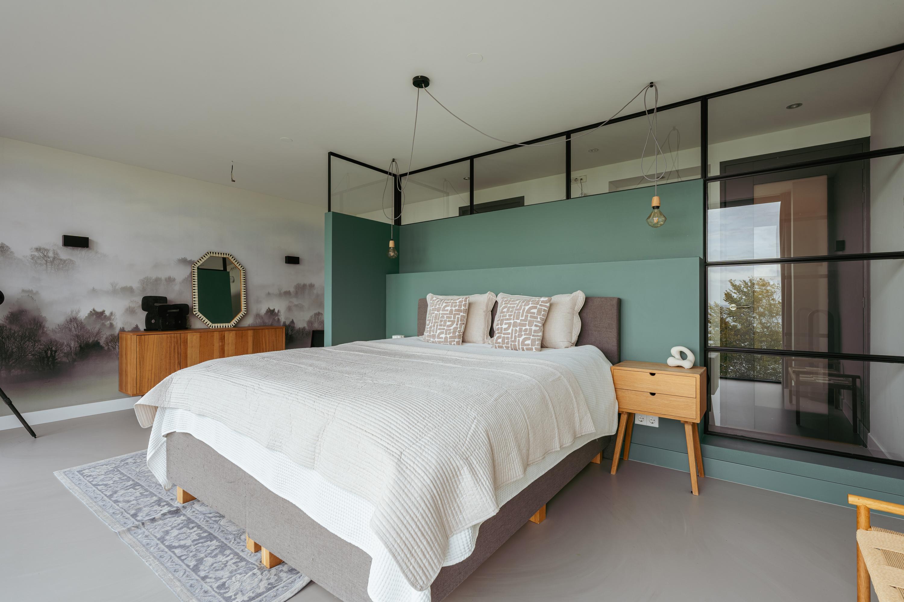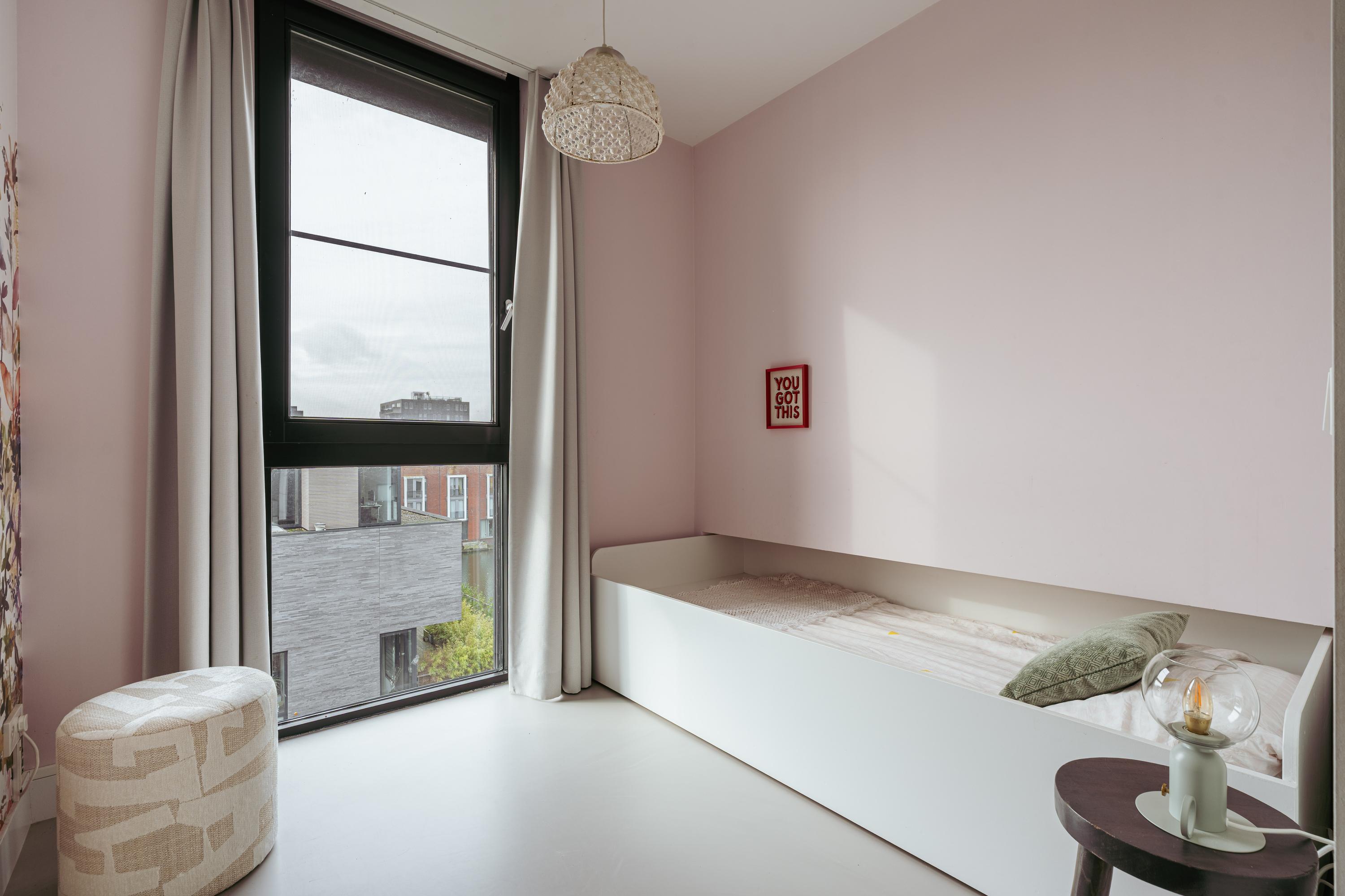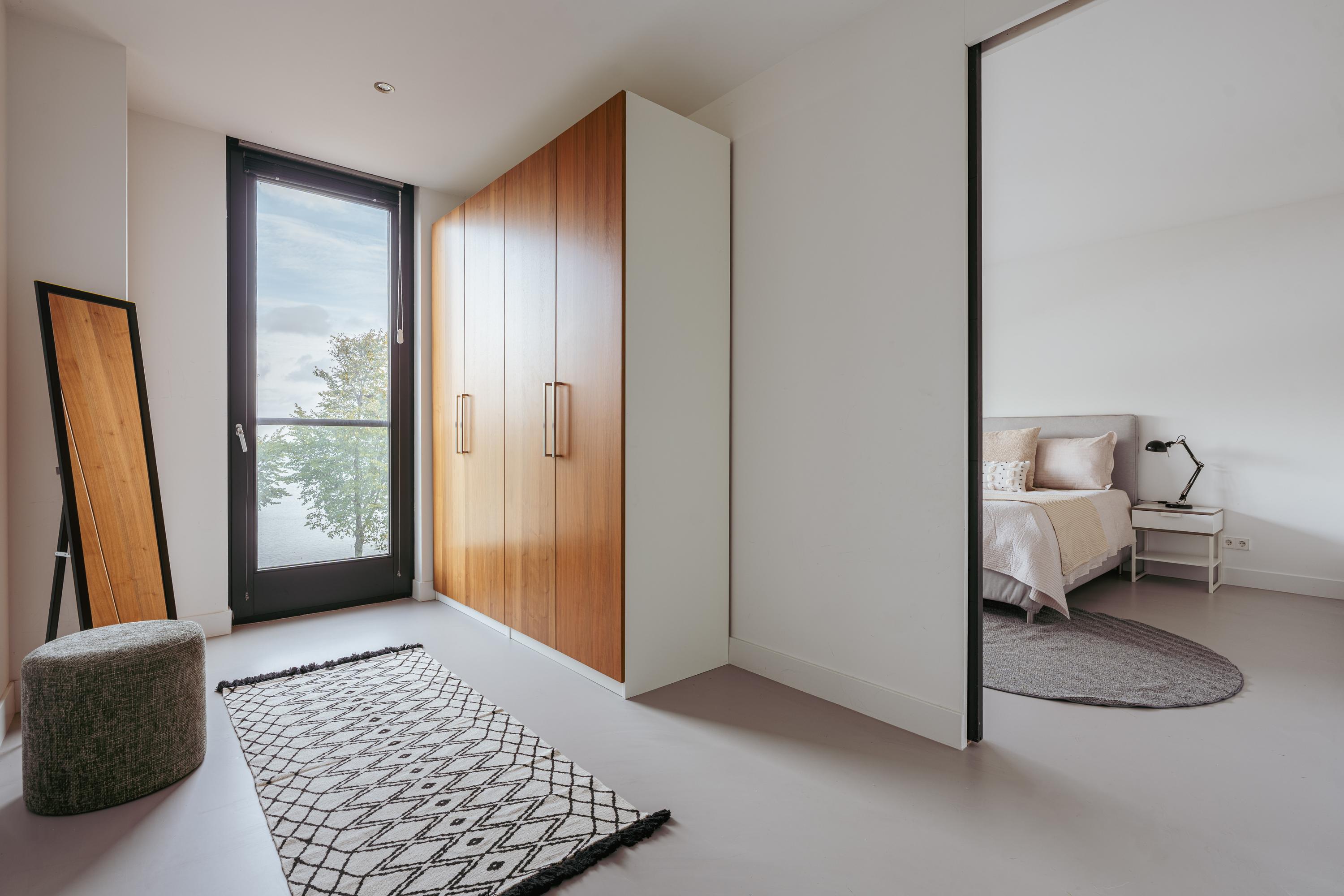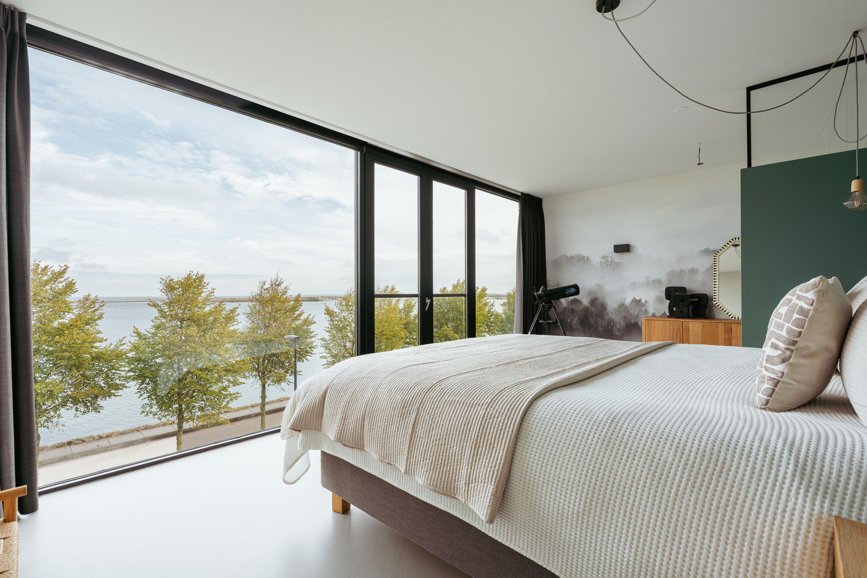 Aan de voorzijde bevindt zich een zeer ruime slaapkamer, momenteel ingericht als stijlvolle master bedroom. Dankzij de grote raampartij over de volledige breedte geniet u hier van een spectaculair uitzicht over het IJmeer. De kamer voelt dankzij de glazen scheidingswand en rustige kleurtinten modern en ruimtelijk aan.