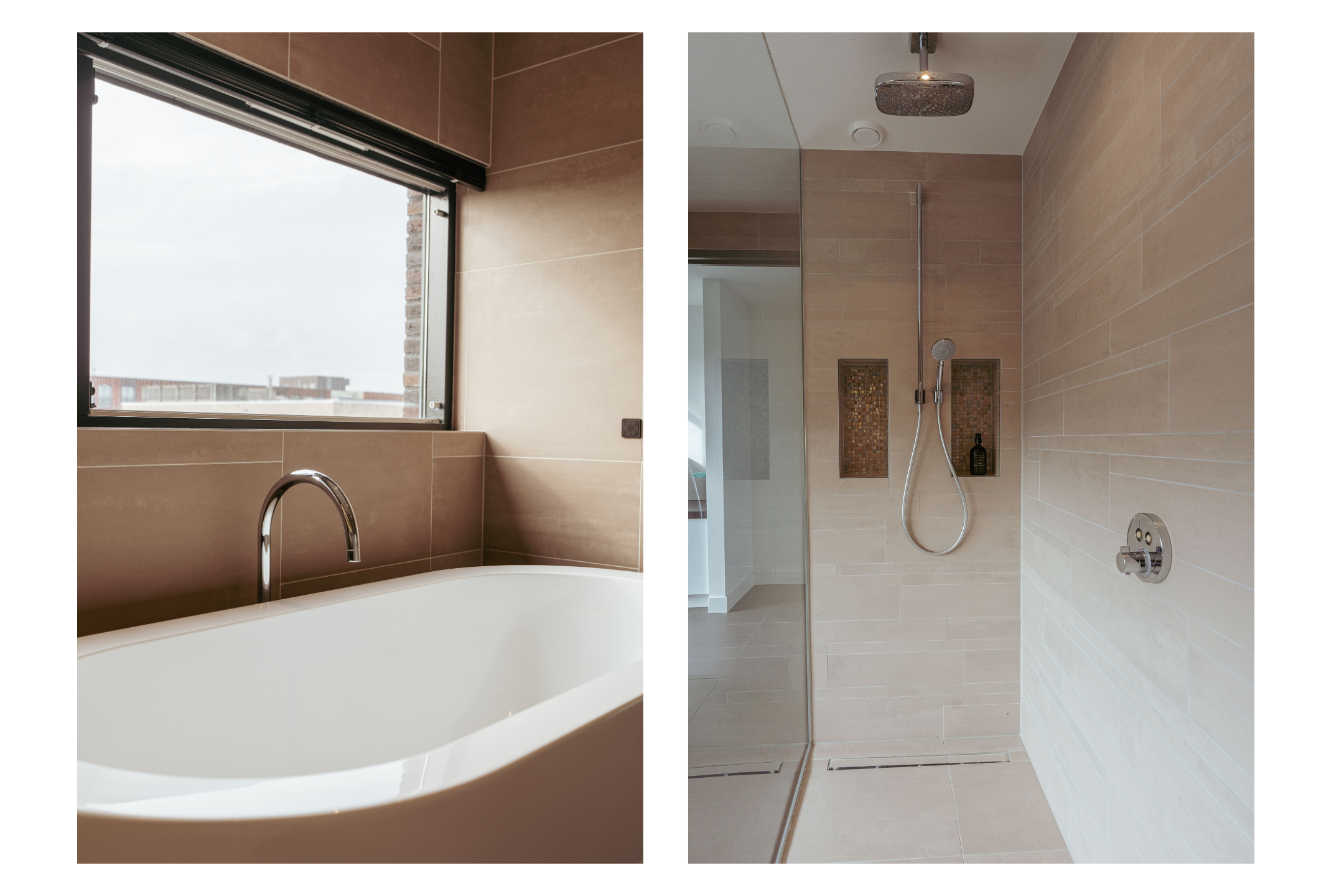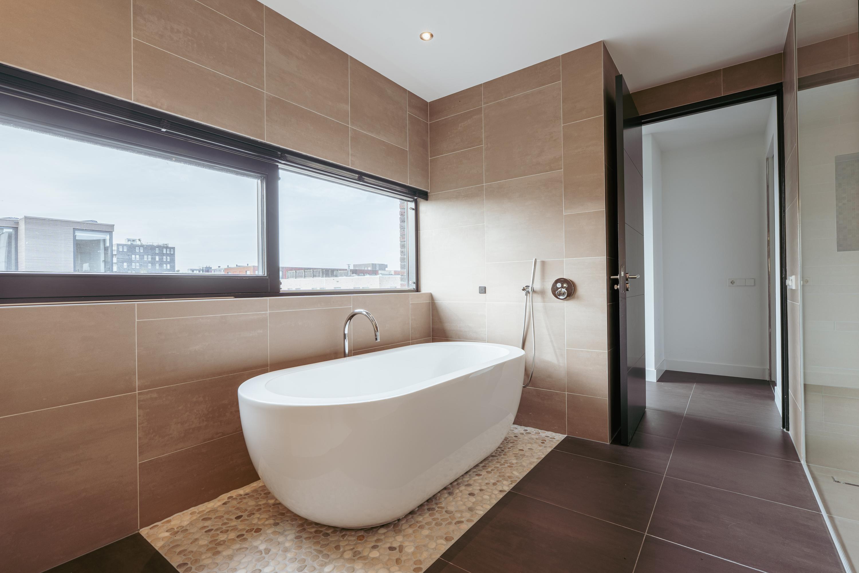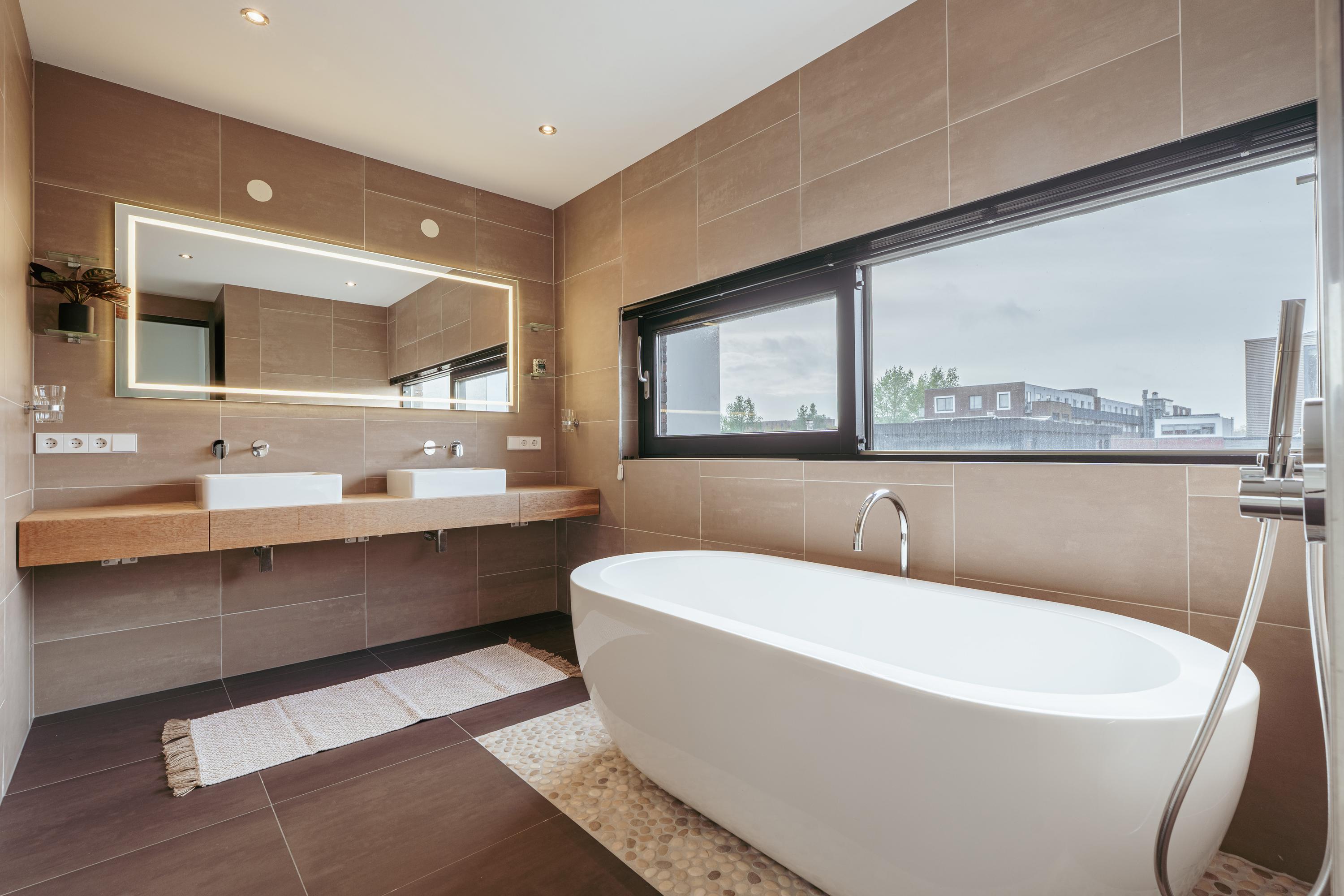 De royale badkamer ademt luxe en rust, met warme aardetinten en hoogwaardige afwerking. De ruimte beschikt over een vrijstaand ligbad, inloopdouche met regendouche, dubbele wastafel en een sauna — een heerlijke plek voor ontspanning na een drukke dag.