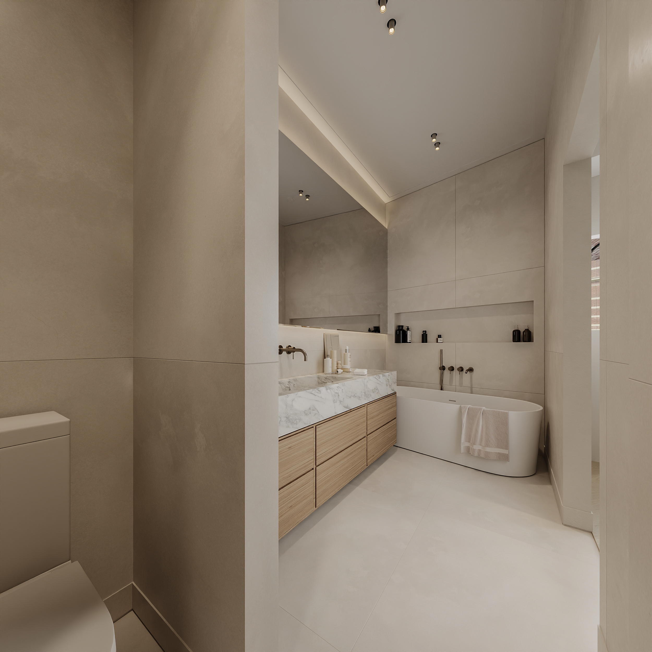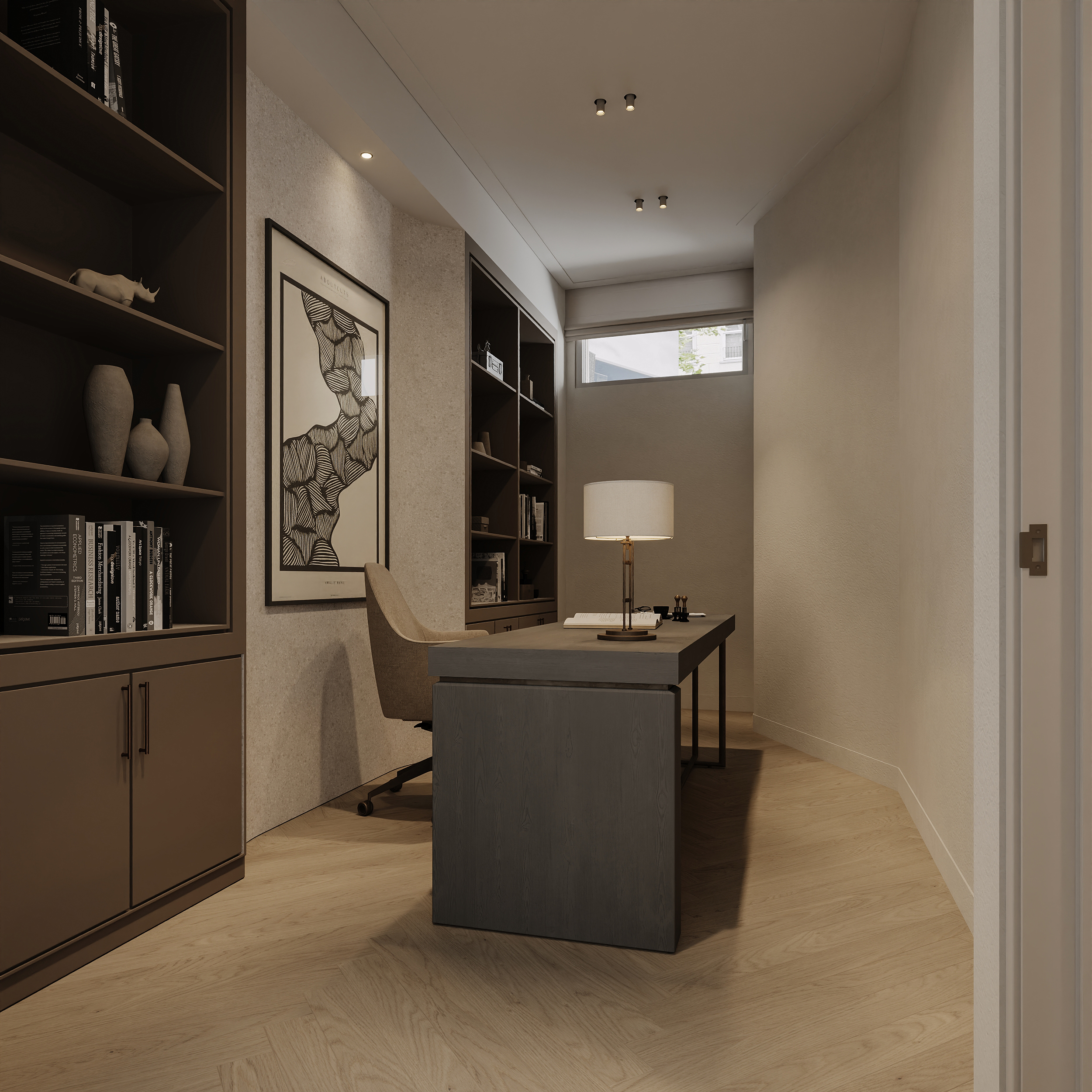 In het souterrain treft u drie slaapkamers en twee moderne badkamers. De riante master bedroom beschikt over grote ramen die zorgen voor veel lichtinval en een open uitstraling, evenals een praktische inbouwkast. Beide badkamers zijn luxe uitgevoerd met een inloopdouche en dubbel wastafelmeubel; één van de badkamers is bovendien uitgerust met een ligbad. Op deze verdieping bevinden zich tevens een separaat toilet en een aparte wasruimte.