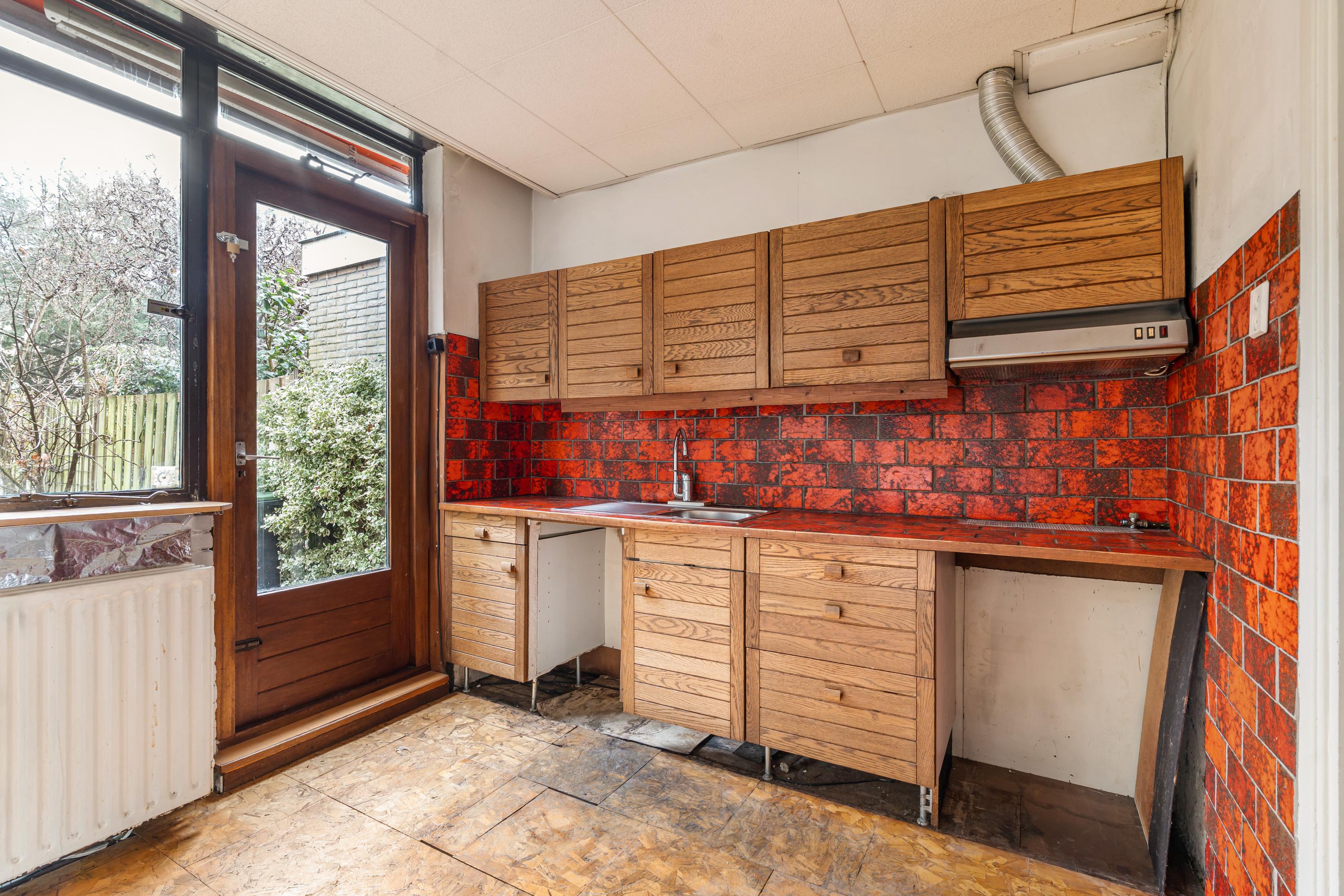 Aan de achterzijde van de woning is de keuken gesitueerd, met directe toegang tot de achtertuin. De keuken is eenvoudig uitgevoerd en gedateerd, maar biedt uitstekende mogelijkheden voor het realiseren van een moderne (open) woonkeuken. De begane grond leent zich tevens goed voor herindeling en/of uitbreiding aan de achterzijde, uiteraard onder voorbehoud van de benodigde vergunningen.