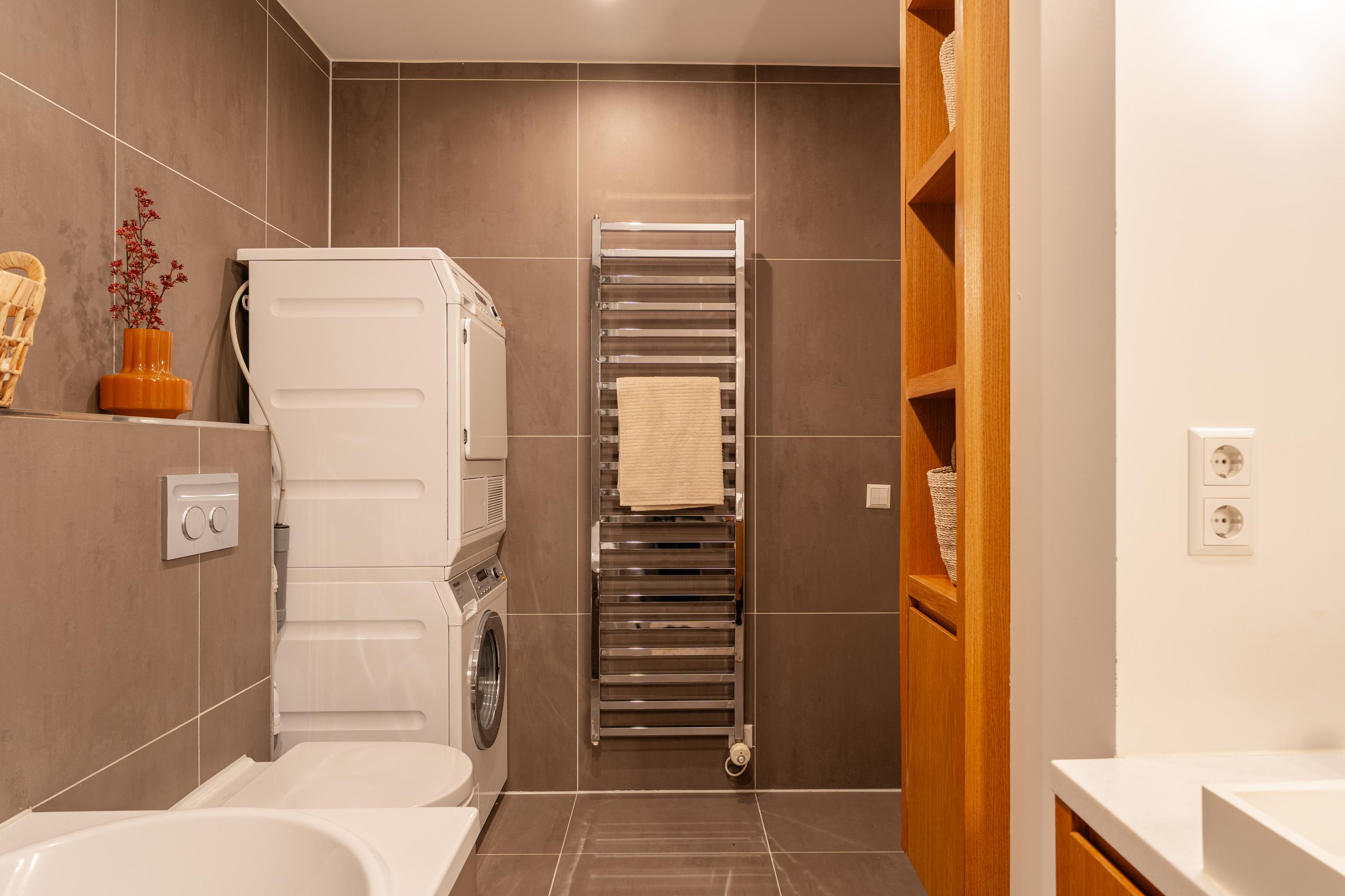 Via de trap in de woonkamer bereikt u de derde en tevens bovenste verdieping van het appartement. Hier bevinden zich twee goed bemeten slaapkamers, beide voorzien van grote raampartijen en maatwerk inbouwkasten. De master bedroom beschikt bovendien over een stijlvol geïntegreerde televisie in de kastenwand. De moderne badkamer is uitgerust met een ruim ligbad, een dubbele wastafel met meubel en een toilet. Tevens bevinden zich hier de aansluitingen voor wasmachine en droger.