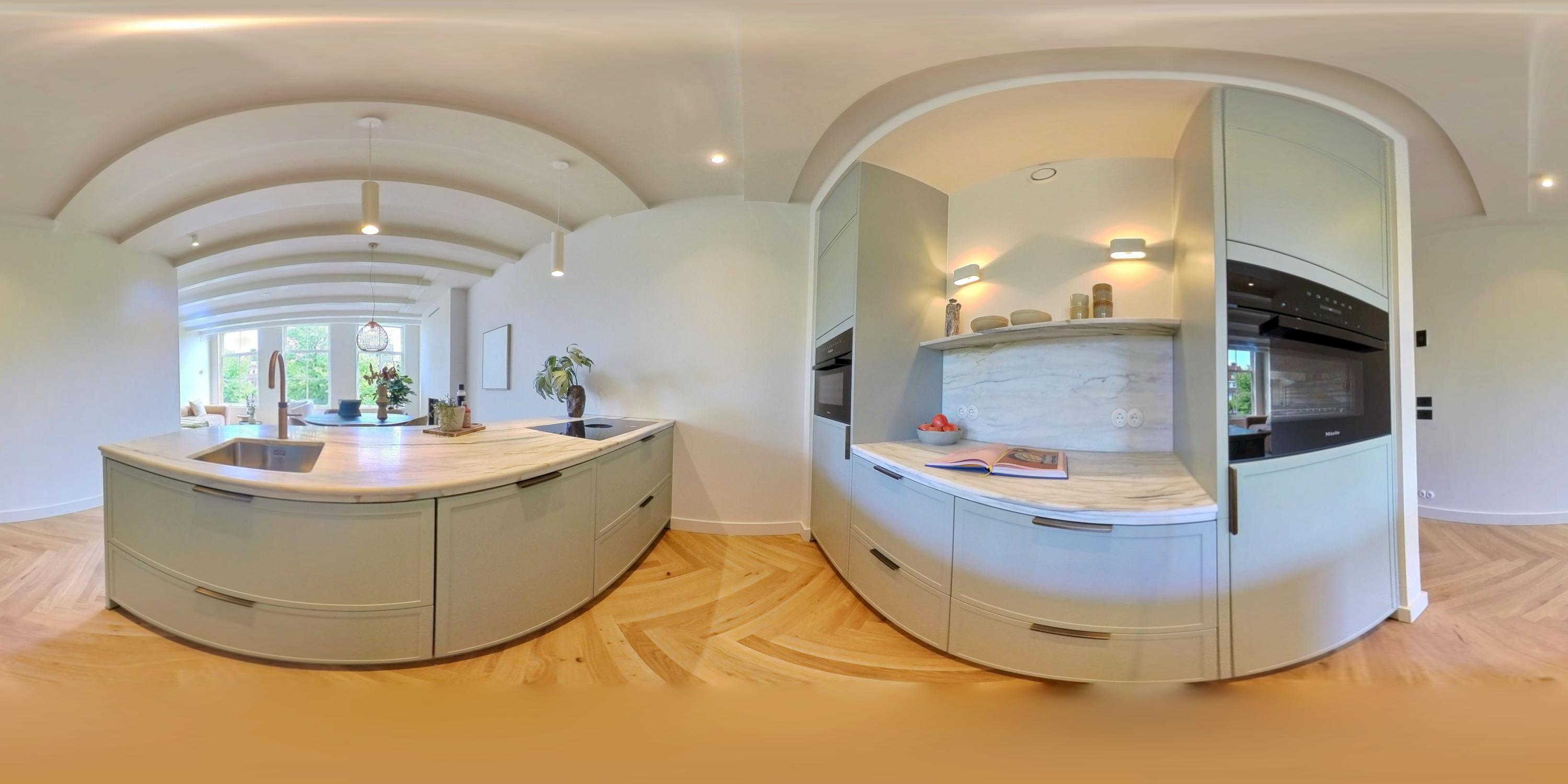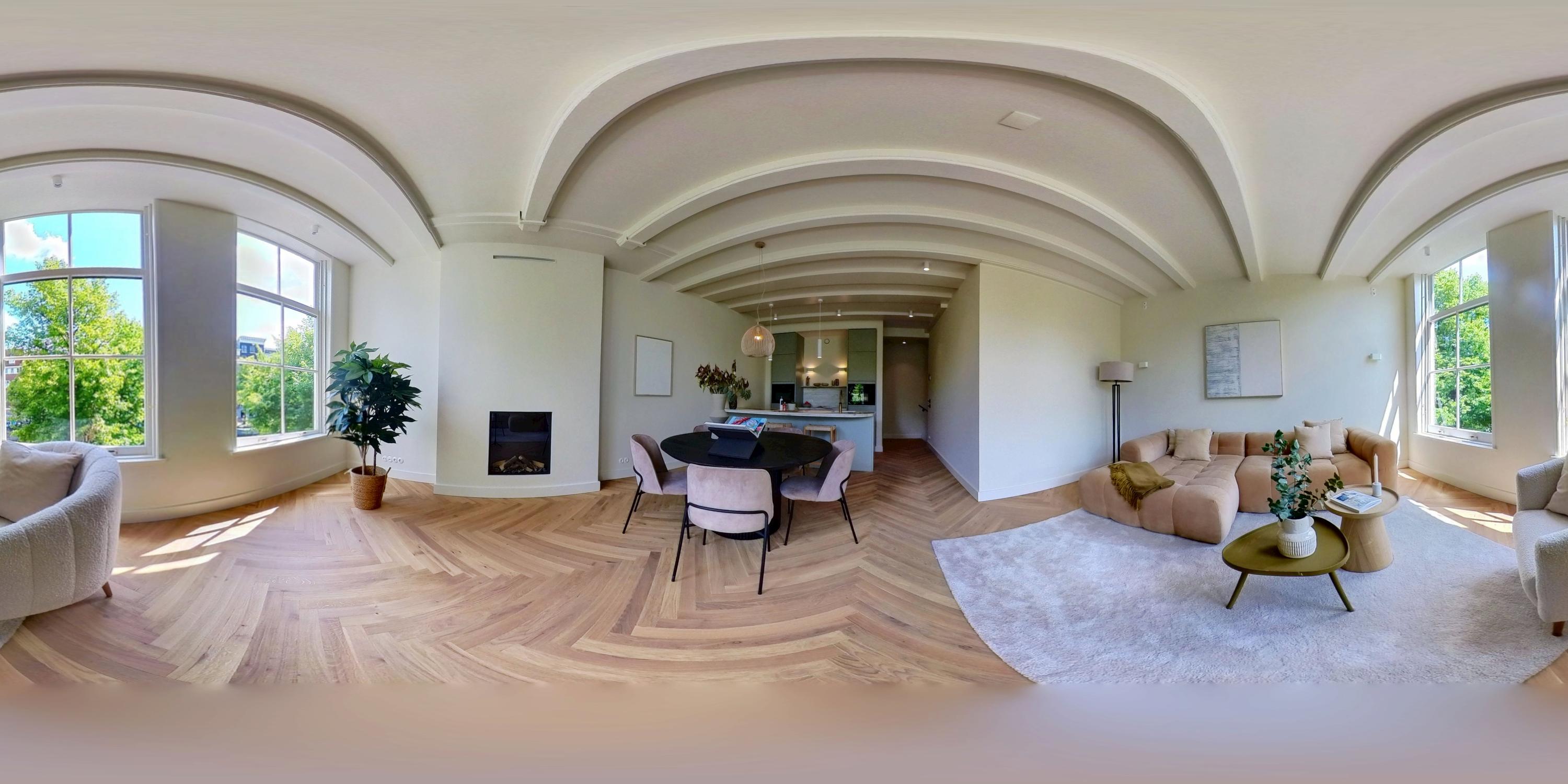 De living en woonkeuken zijn gesitueerd op split level, wat zorgt voor een speels en ruimtelijk effect. De keuken is voorzien van alle denkbare inbouwapparatuur waaronder een Quooker, Siemens Studioline combioven en oven, Bora inductieplaat met geïntegreerde afzuiging, vaatwasser en meer dan genoeg opbergruimte. Een marmeren blad en messing details maken het geheel af! Het bargedeelte met marmeren blad en houten barkrukken maakt deze ruimte perfect voor zowel uitgebreid koken als ontspannen borrelen. De woonkamer aan de voorzijde heeft drie imposante hoge ramen met uitzicht op de majestueuze Keizersgracht. Hier valt het daglicht prachtig naar binnen en creëert in combinatie met de plafondbalken een warme sfeer. Een moderne gashaard vormt het knusse middelpunt van deze ruimte en geeft het extra sfeer.