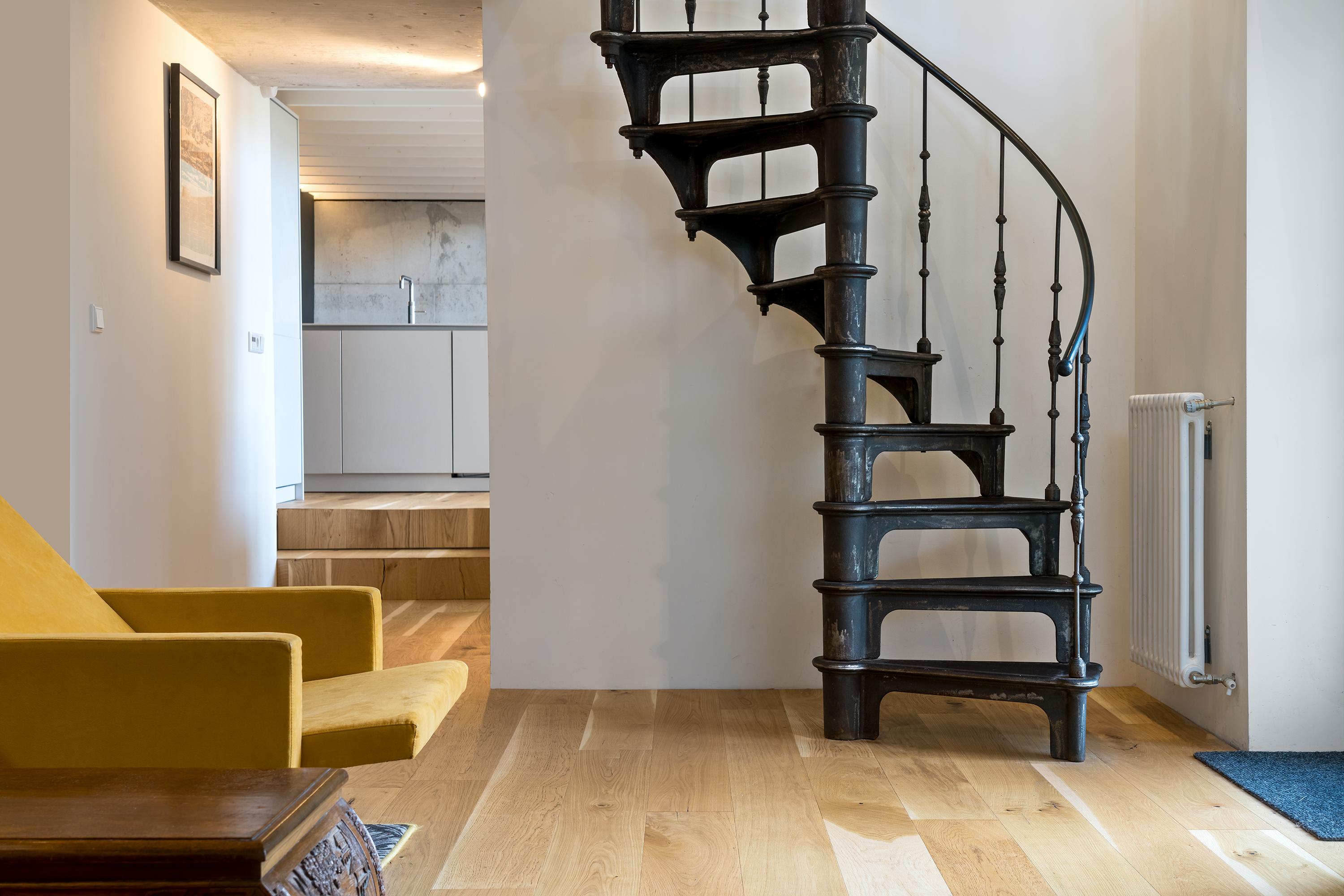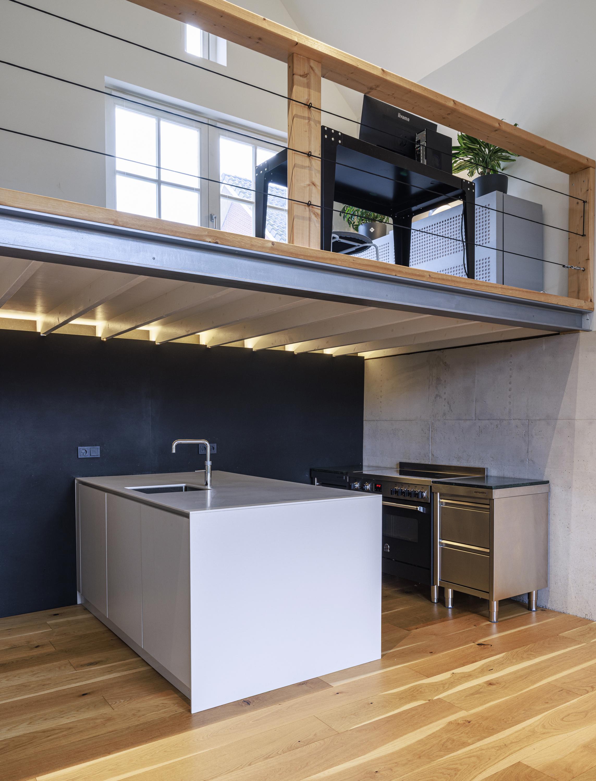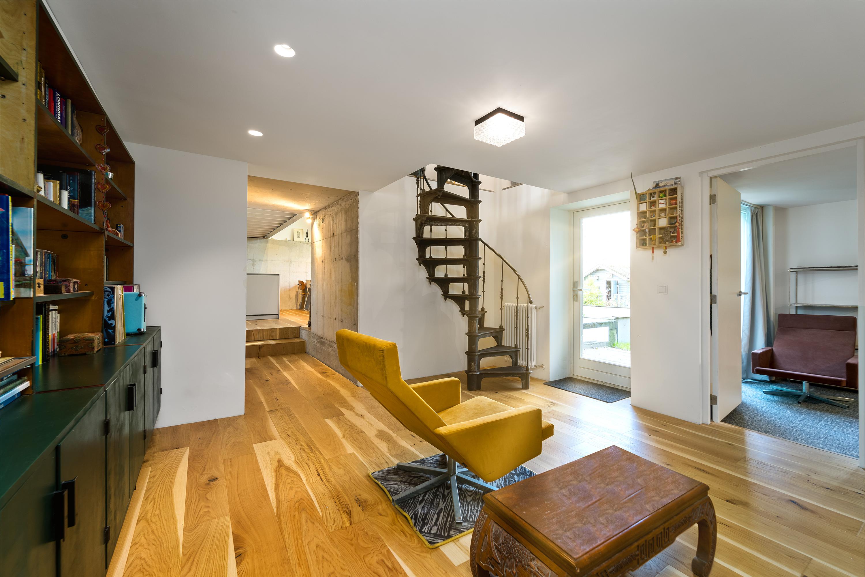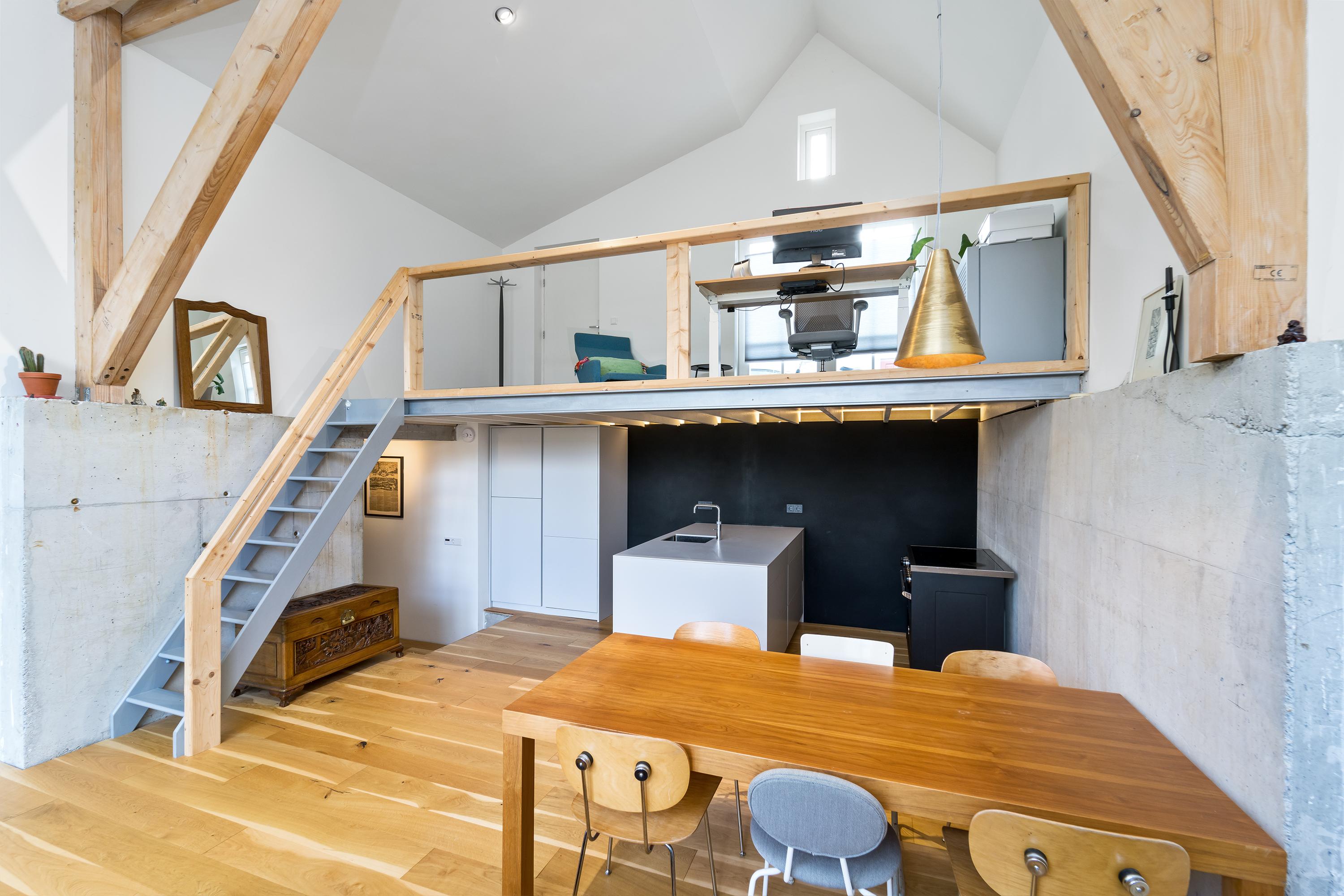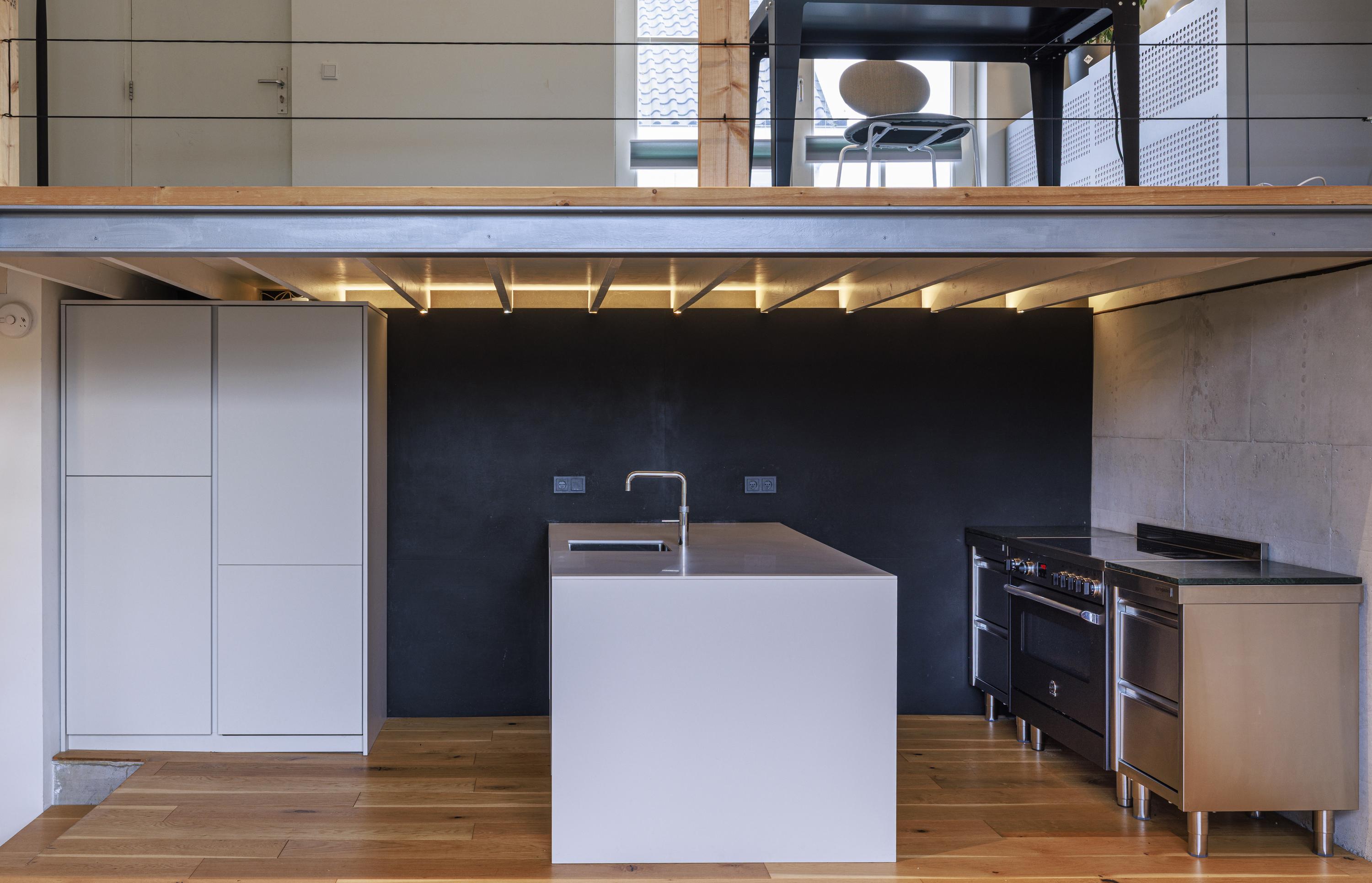 Ook binnen is deze woning een ware blikvanger. Bij de nieuwbouw en verbouwing is gekozen voor een spannende combinatie van oude en moderne materialen. Denk aan robuuste houten constructiebalken, ruw beton, eikenhouten vloerdelen, klassieke ledenradiatoren en een stoere stalen wenteltrap. De afwerking is hoogwaardig en met oog voor detail uitgevoerd. Wat direct opvalt, is de indrukwekkende ruimtelijke beleving. De superhoge living vormt het hart van het huis en beschikt over een vide met open kantoorruimte. Onder de vide bevindt zich een op maat gemaakte keuken. Dankzij de enorme glazen pui geniet je op de vide én in de woonkamer van een zee aan daglicht en een prachtig zicht op de tuin en het terras.