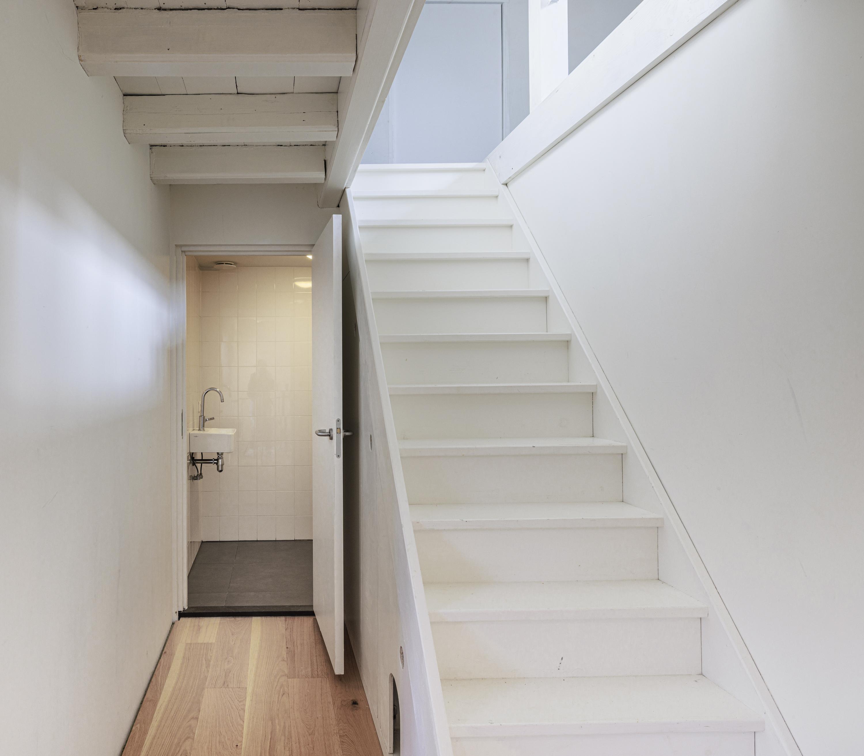 Stenen dijkhuis: entree, hal, toilet, trap met trapkast naar de eerste verdieping, wenteltrap naar het tuinniveau, twee slaapkamers en tweede badkamer (inloopdouche en wastafel).